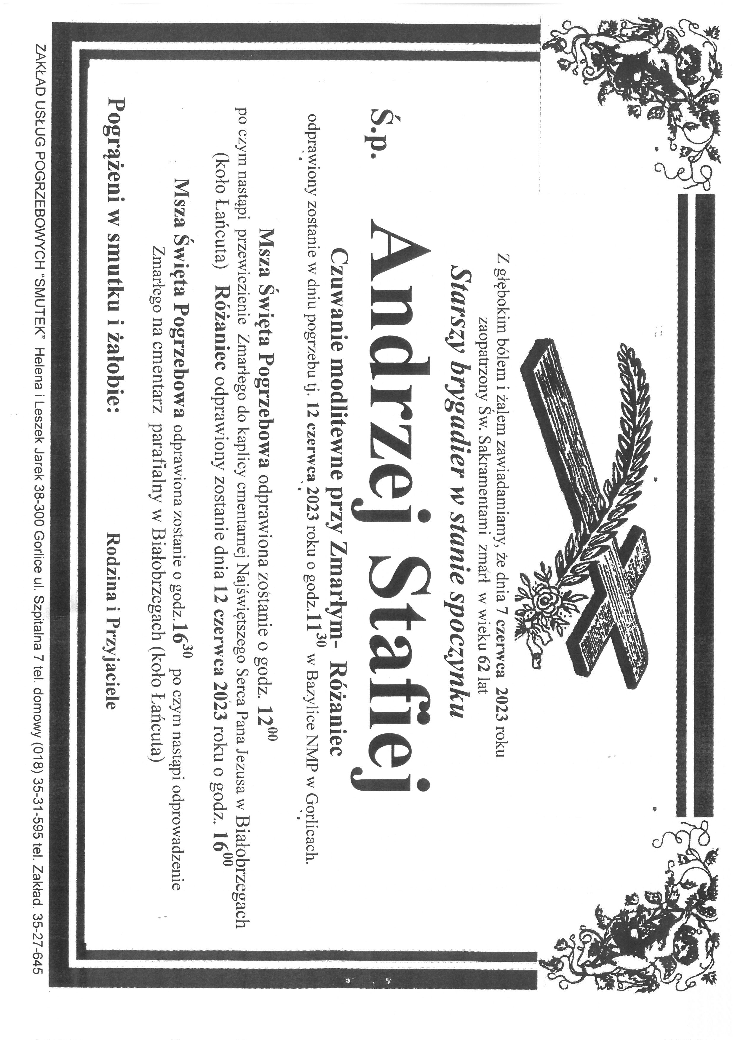 Z wielkim smutkiem przyjęliśmy informację, że w dniu 7 czerwca 2023 r. zmarł, wieloletni komendant rejonowy i powiatowy tutejszej komendy, st. bryg w stan. spocz. Andrzej Stafiej.