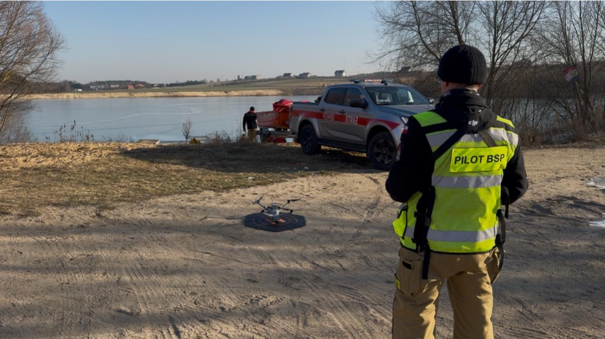 Dodatkowym elementem ćwiczeń było wykorzystanie bezzałogowego statku powietrznego (BSP), który od niedawna znajduje się na wyposażeniu komendy. Sprawdzono możliwości użycia kamery termowizyjnej, w którą wyposażony jest dron. Zastosowanie BSP znacząco usprawnia szybkie rozpoznanie terenu działań oraz lokalizację osób poszkodowanych.