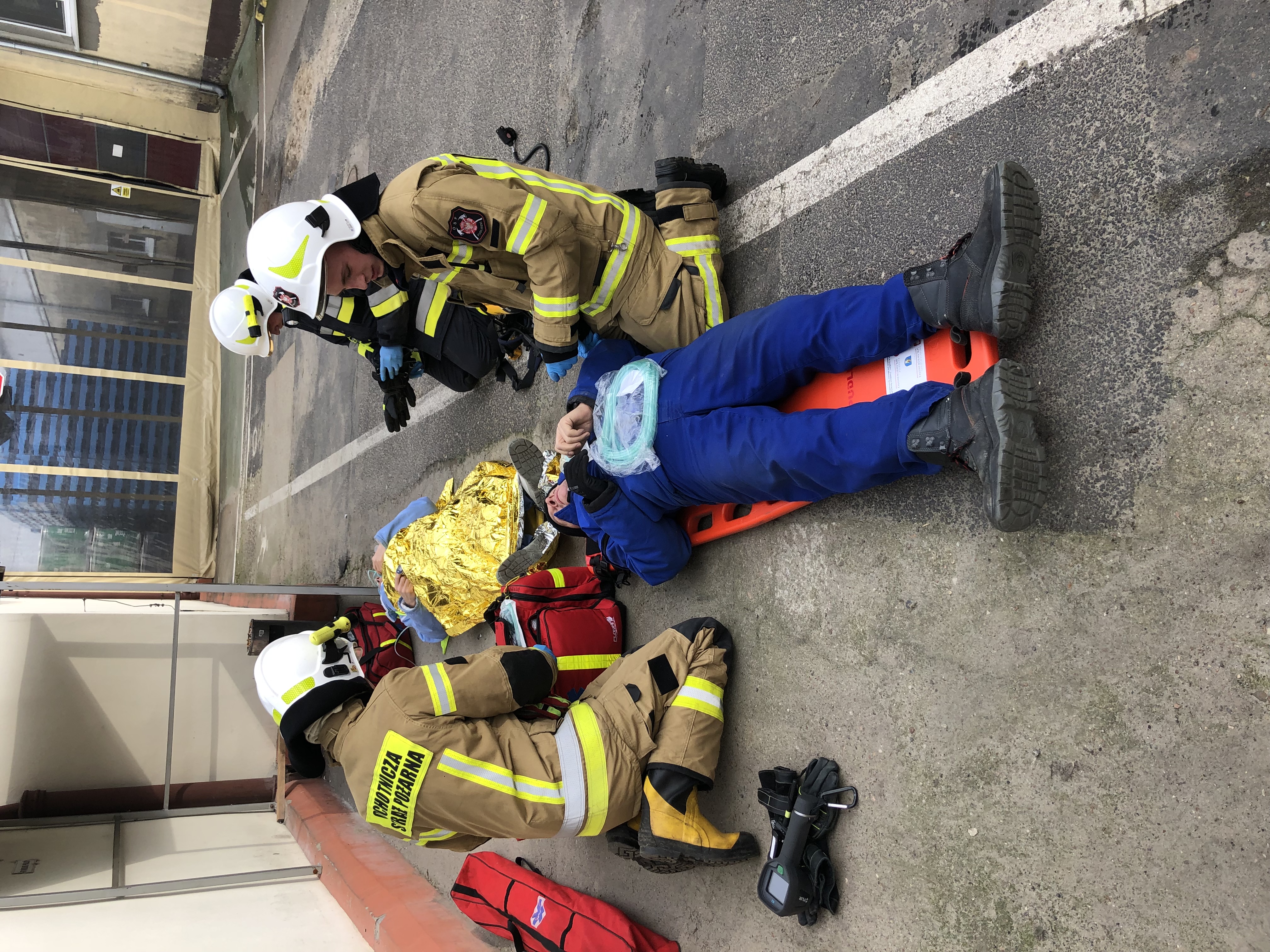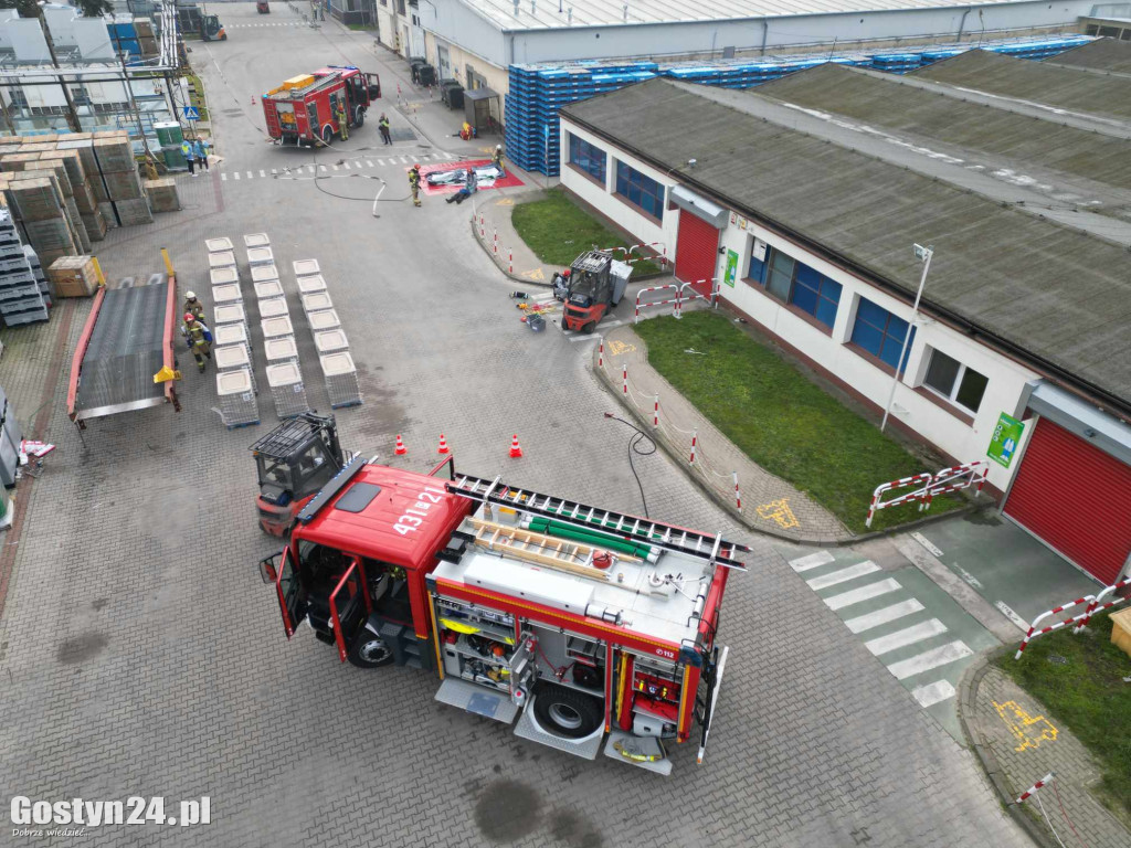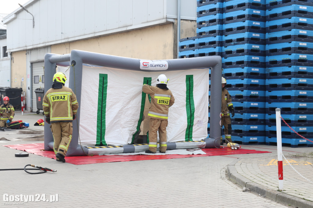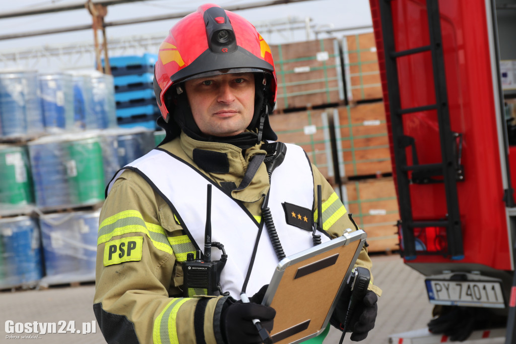 Scenariusz ćwiczeń zakładał pożar hali magazynowej firmy zajmującej się przetwórstwem spożywczym oraz wyciek substancji żrącej ze zbiornika przewożonego przez operatora wózka widłowego.
