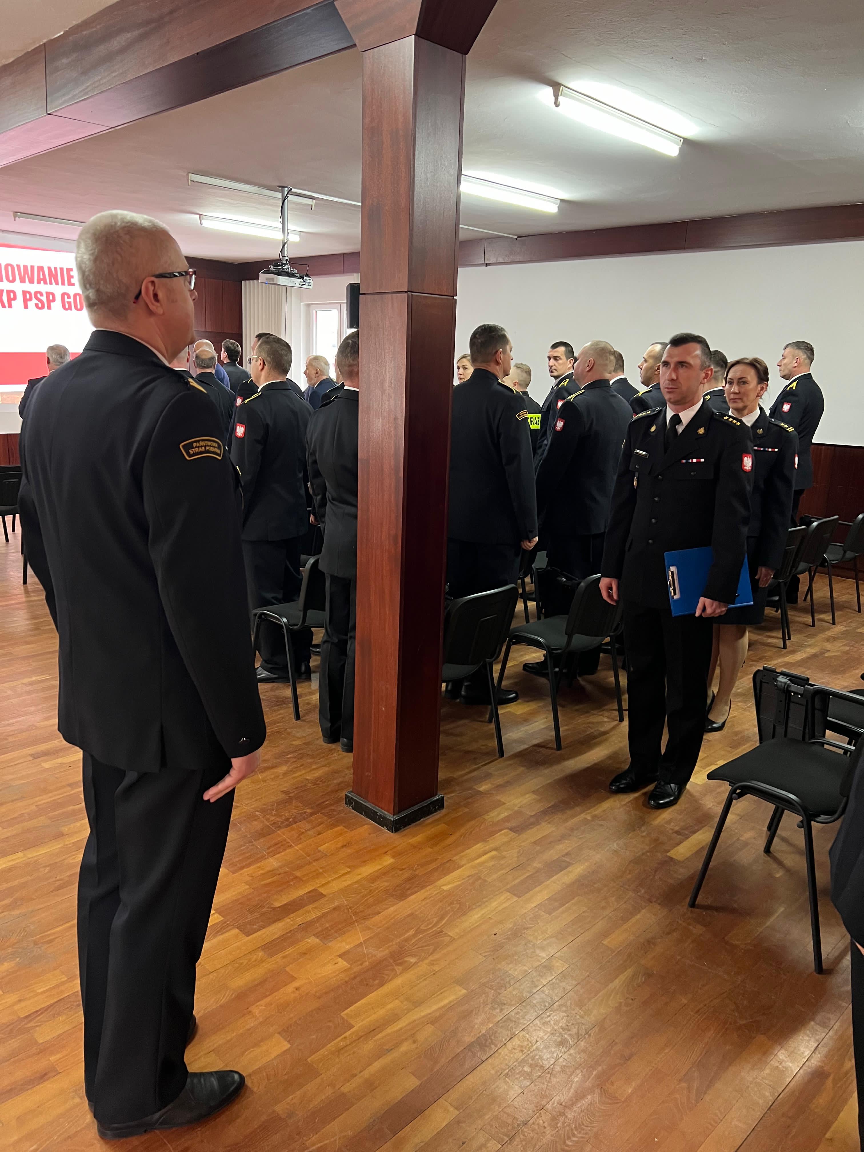 Uroczystość rozpoczęła się od złożenia meldunku komendantowi powiatowemu Państwowej Straży Pożarnej w Gostyniu st. kpt. Marcinowi Nyczce przez przez mł. bryg. Rafała Rybackiego.
