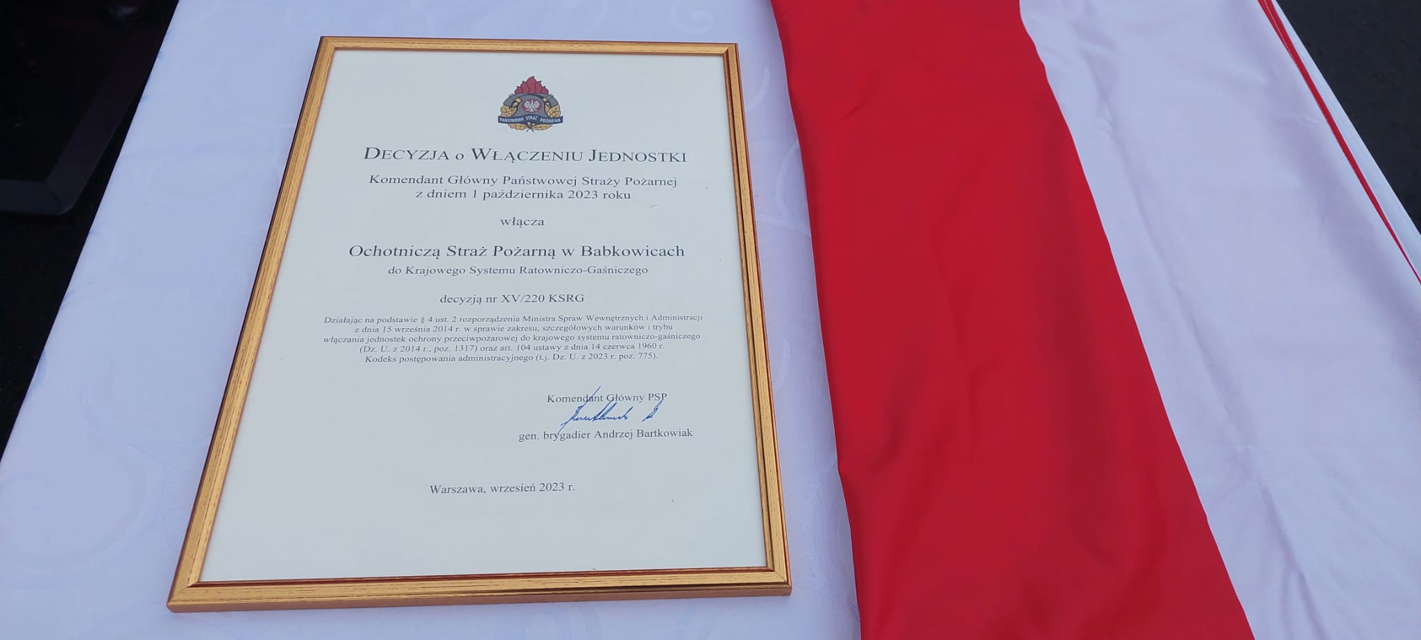 12 października 2023 roku w Babkowicach odbyła się uroczystość z okazji przedłużenia członkostwa jednostki Ochotniczej Straży Pożarnej Babkowice w Krajowym Systemie Ratowniczo Gaśniczym. Swoją obecnością, uroczystość uświetnili: