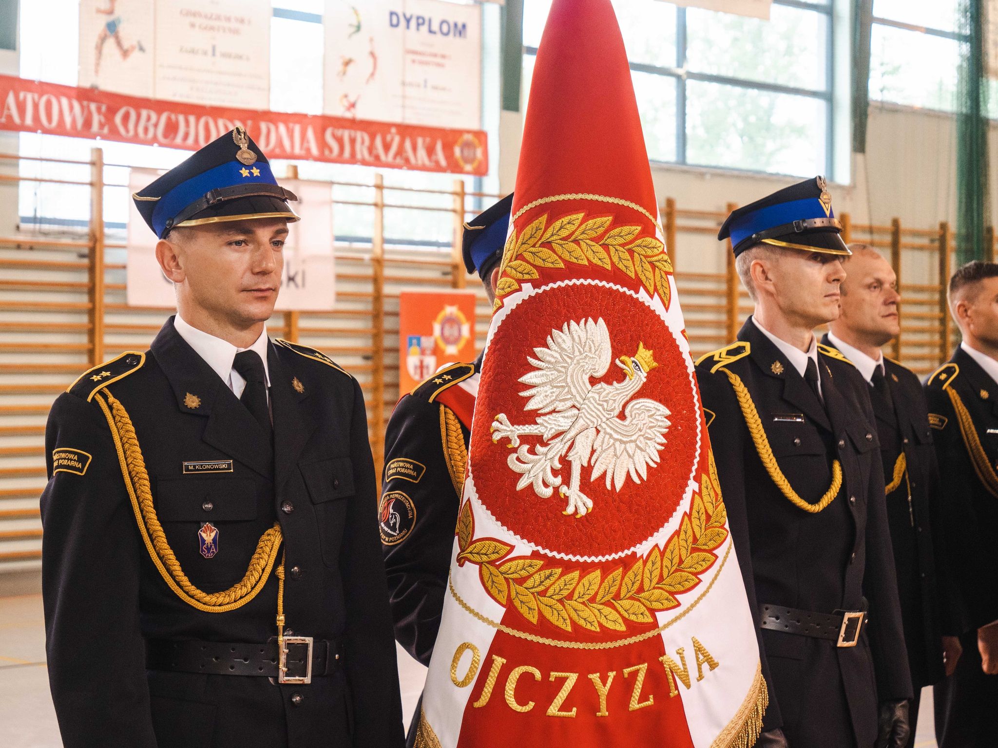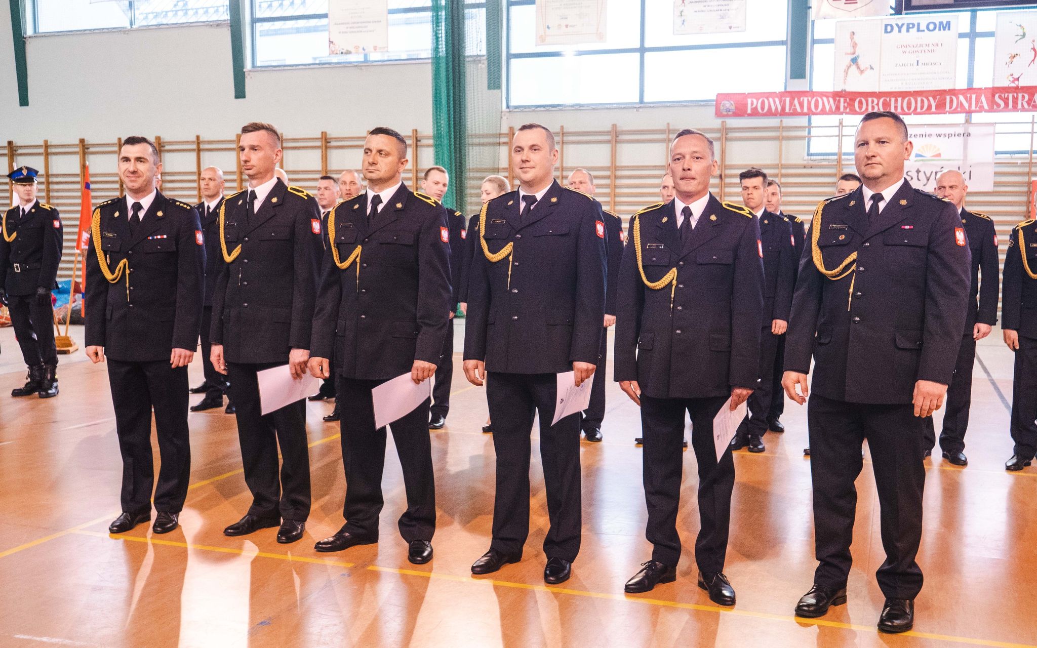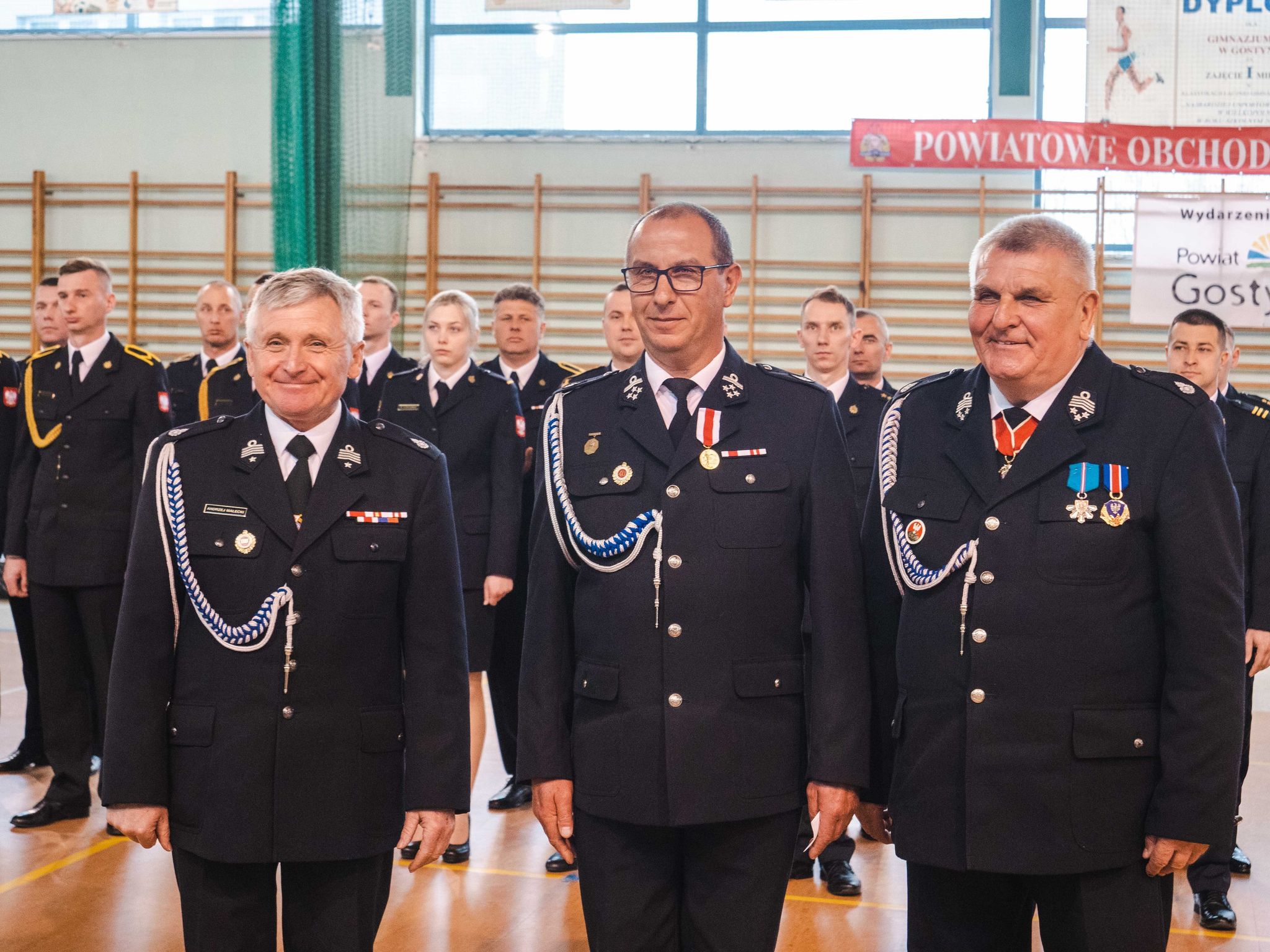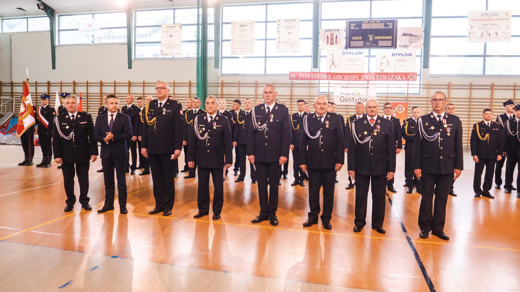 Po mszy świętej zgromadzeni goście udali się do budynku hali sportowej Szkoły Podstawowej Nr 1 z Oddziałami Integracyjnymi im. Czarnego Legionu w Gostyniu na dalszą część obchodów Dnia Strażaka. Główna uroczystość rozpoczęła się od złożenia meldunku Komendantowi Powiatowemu Państwowej Straży Pożarnej w Gostyniu st. kpt. Marcinowi Nyczce przez dowódcę uroczystości asp. sztab. Sebastiana Kasperkowiaka, po czym odśpiewano hymn państwowy. Następnie głos zabrał Komendant Powiatowy PSP st. kpt. Marcin Nyczka, który na wstępie powitał zaproszonych gości. W swoich słowach podziękował funkcjonariuszkom i funkcjonariuszom gostyńskiej komendy za codzienną służbę, zaangażowanie i wzorową współpracę oraz druhnom i druhom OSP za ich poświęcenie i dyspozycyjność. Podziękowania skierował także do lokalnych przedsiębiorców za wsparcie oraz pomoc w realizacji naszych przedsięwzięć.