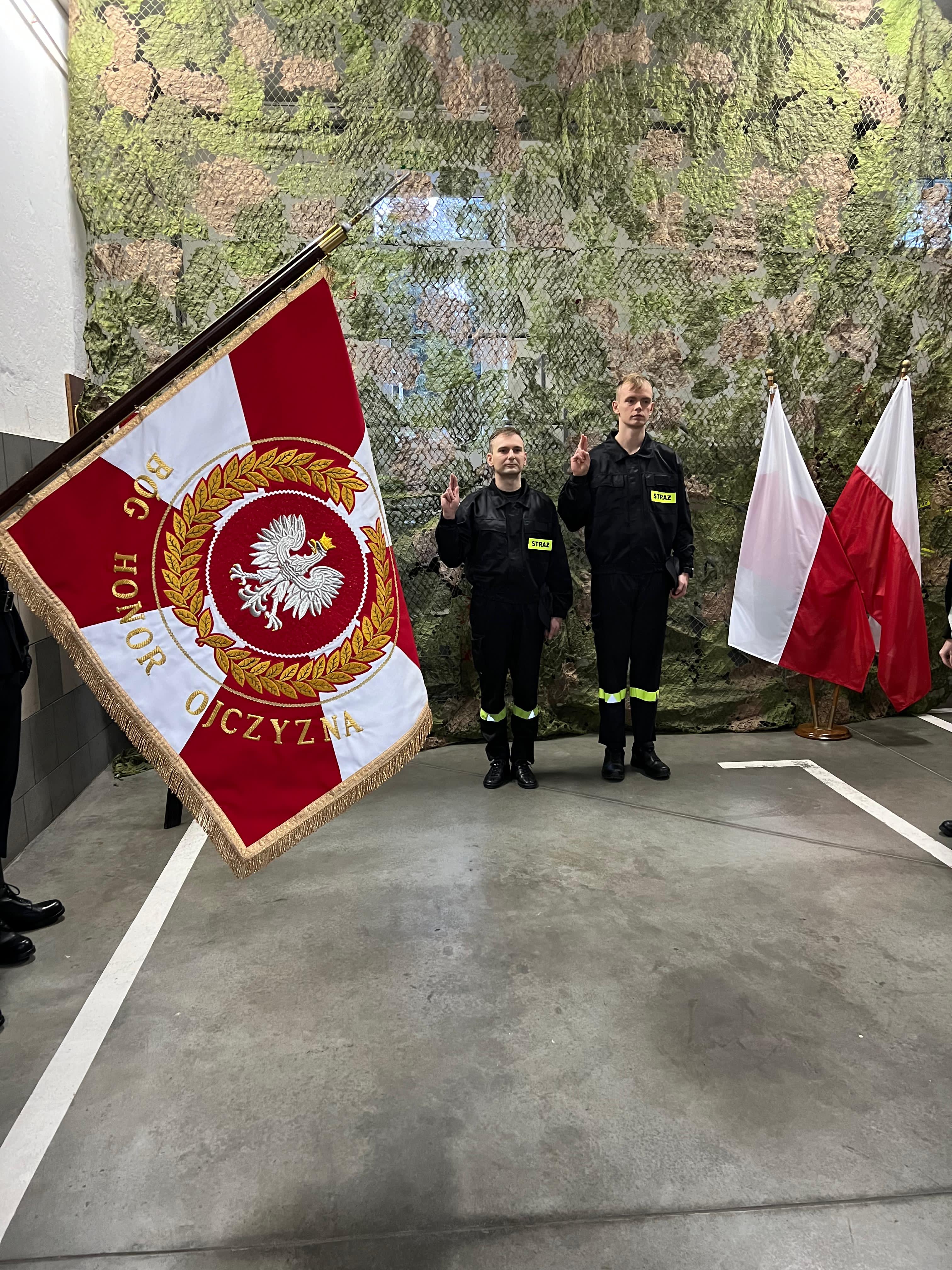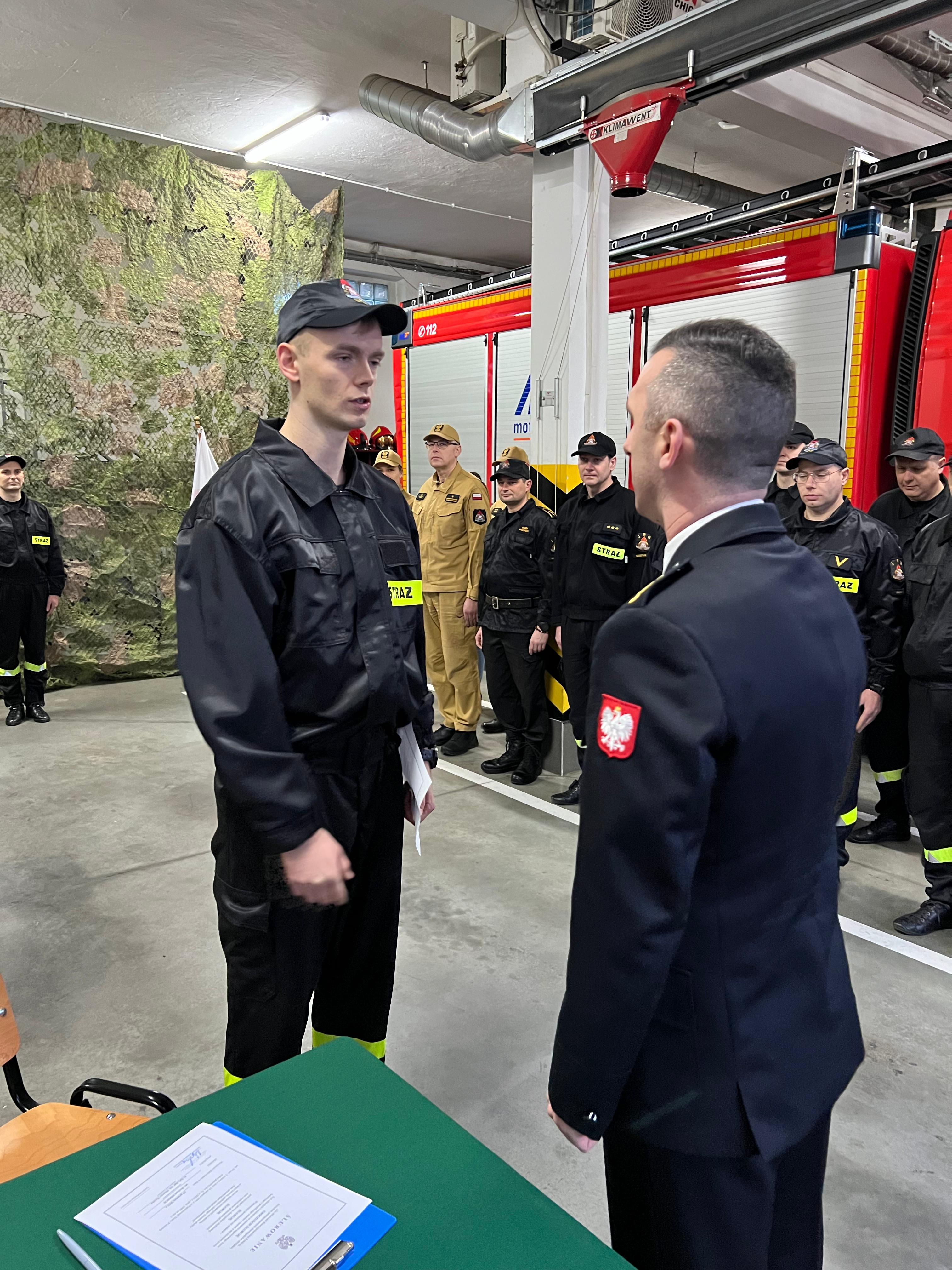 „Ja, obywatel Rzeczypospolitej Polskiej, świadom podejmowanych obowiązków strażaka, uroczyście ślubuję być ofiarnym i mężnym w ratowaniu zagrożonego życia ludzkiego i wszelkiego mienia – nawet z narażeniem życia. Wykonując powierzone mi zadania, ślubuję przestrzegać prawa, dyscypliny służbowej oraz wykonywać polecenia przełożonych. Ślubuję strzec tajemnic związanych ze służbą, a także honoru, godności i dobrego imienia służby oraz przestrzegać zasad etyki zawodowej”.