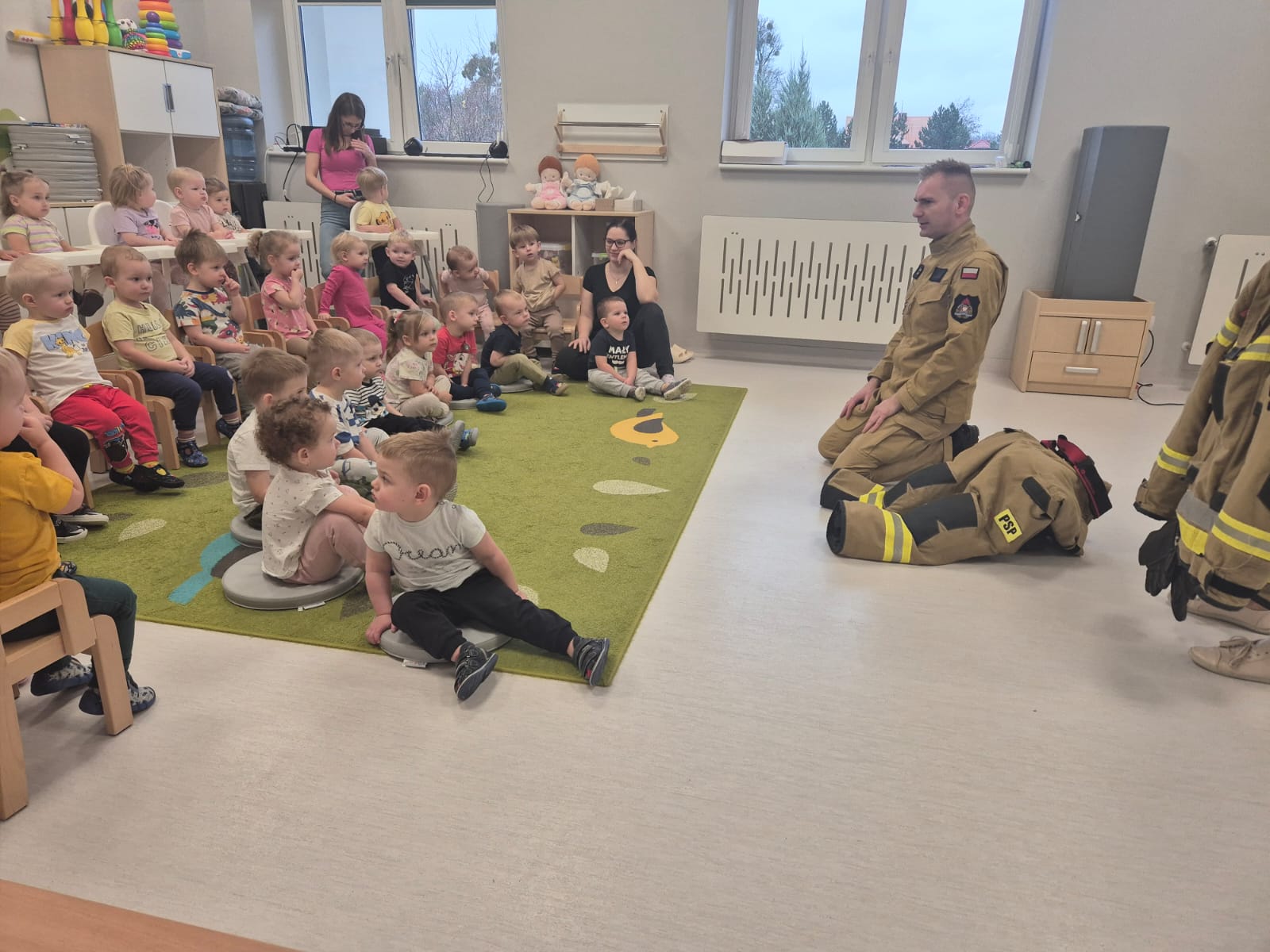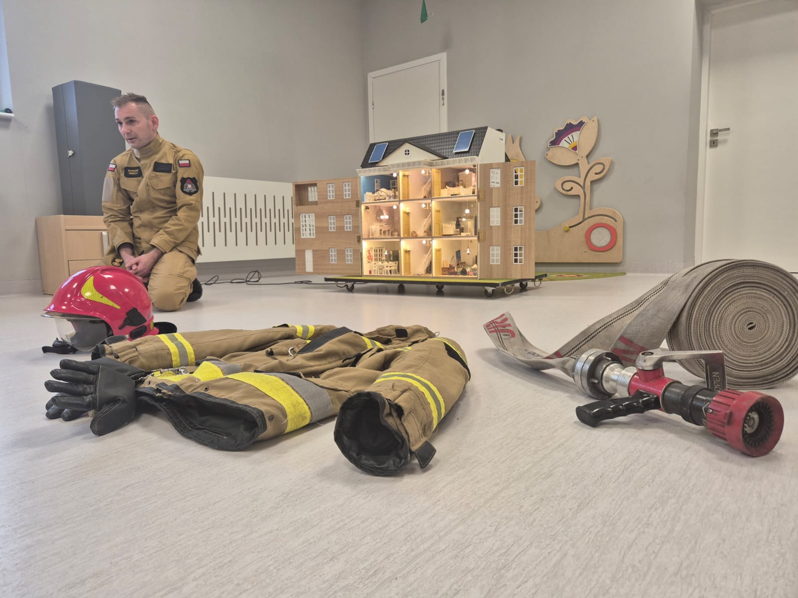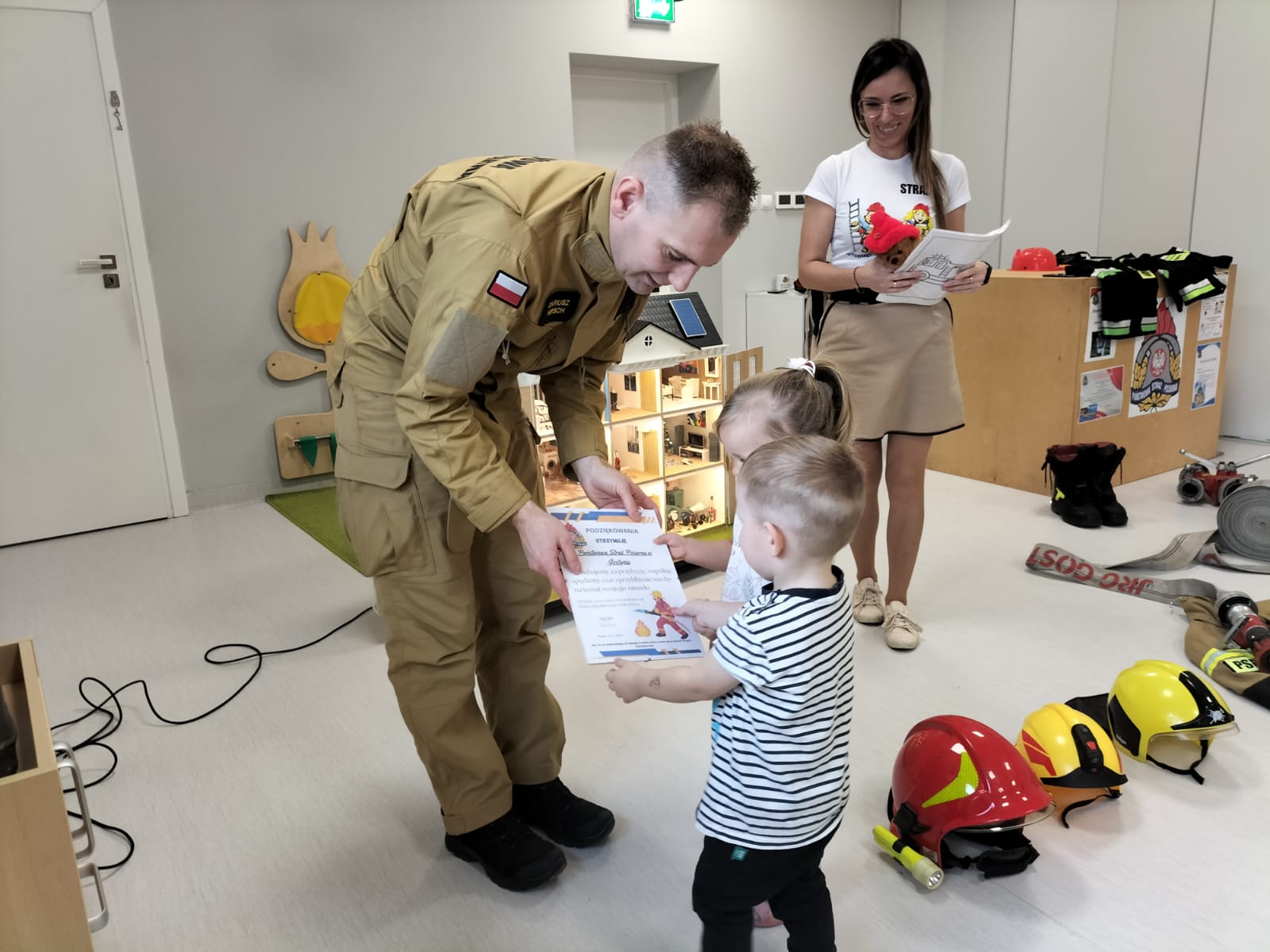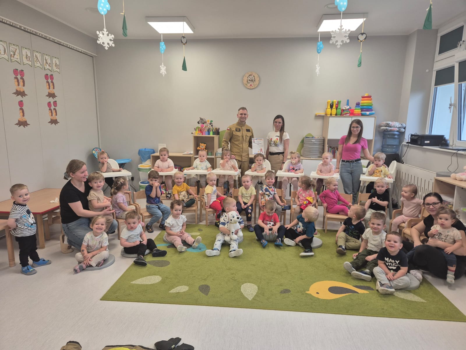 Dzieciom w czasie pogadanki towarzyszył Piesek Marshall z bajki „Psi Patrol” oraz Hydrant Henio, które uatrakcyjniły wizytę. Spotkanie obejmowało tematy dotyczące zawodu strażaka, alarmowania służb i straży. Uczestnikom lekcji edukacyjnej zaprezentowano umundurowanie specjalne strażaka oraz podręczny sprzęt używany podczas gaszenia pożarów. Dzieci podczas wizyty bardzo chętnie przymierzały stroje strażackie by choć przez chwilę poczuć się jak prawdziwy strażak. Maluchom zaprezentowano Mobilny Symulator Zagrożeń Domu Jednorodzinnego, który zobrazował im jakie niebezpieczeństwa czyhają na nich w domu oraz jak się przed nimi ustrzec. Dzieci dodatkowo otrzymały kolorowanki oraz maskotkę Misia Strażaka by przypominał, im o tej lekcji, która może zaowocować poprawą ich bezpieczeństwa.