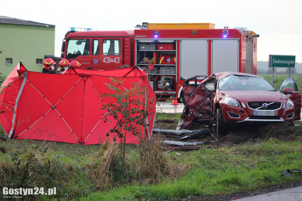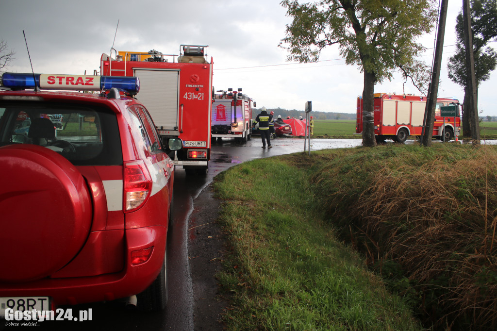 29 października 2020 roku około godziny 14:30 do Stanowiska Kierowania Komendanta Powiatowego w Gostyniu wpłynęła formatka informująca o wypadku drogowym samochodu osobowego z samochodem ciężarowym. Dyżurny SKKP zadysponował do zdarzenia zastępy JRG oraz jednostki OSP. Po dojeździe pierwszych zastępów i przeprowadzonym rozpoznaniu, potwierdzono informacje zawarte w formatce. W zdarzeniu poszkodowane zostały 4 osoby, w tym dwójka dzieci. Strażacy przystąpili do udzielania kwalifikowanej pierwszej pomocy. Po przyjeździe na miejsce zdarzenia Zespołu Ratownictwa Medycznego, kontynuowano działania medyczne. Na miejsce wezwano także śmigłowiec Lotniczego Pogotowia Ratunkowego. Niestety po długiej reanimacji, życia 30 letniego kierowcy nie udało się uratować. Dwójka dzieci została zabrana do szpitala drogą lądową, natomiast kobieta została zabrana do szpitala śmigłowcem. Na miejsce zdarzenia przybył także Komendant Powiatowy PSP w Gostyniu.