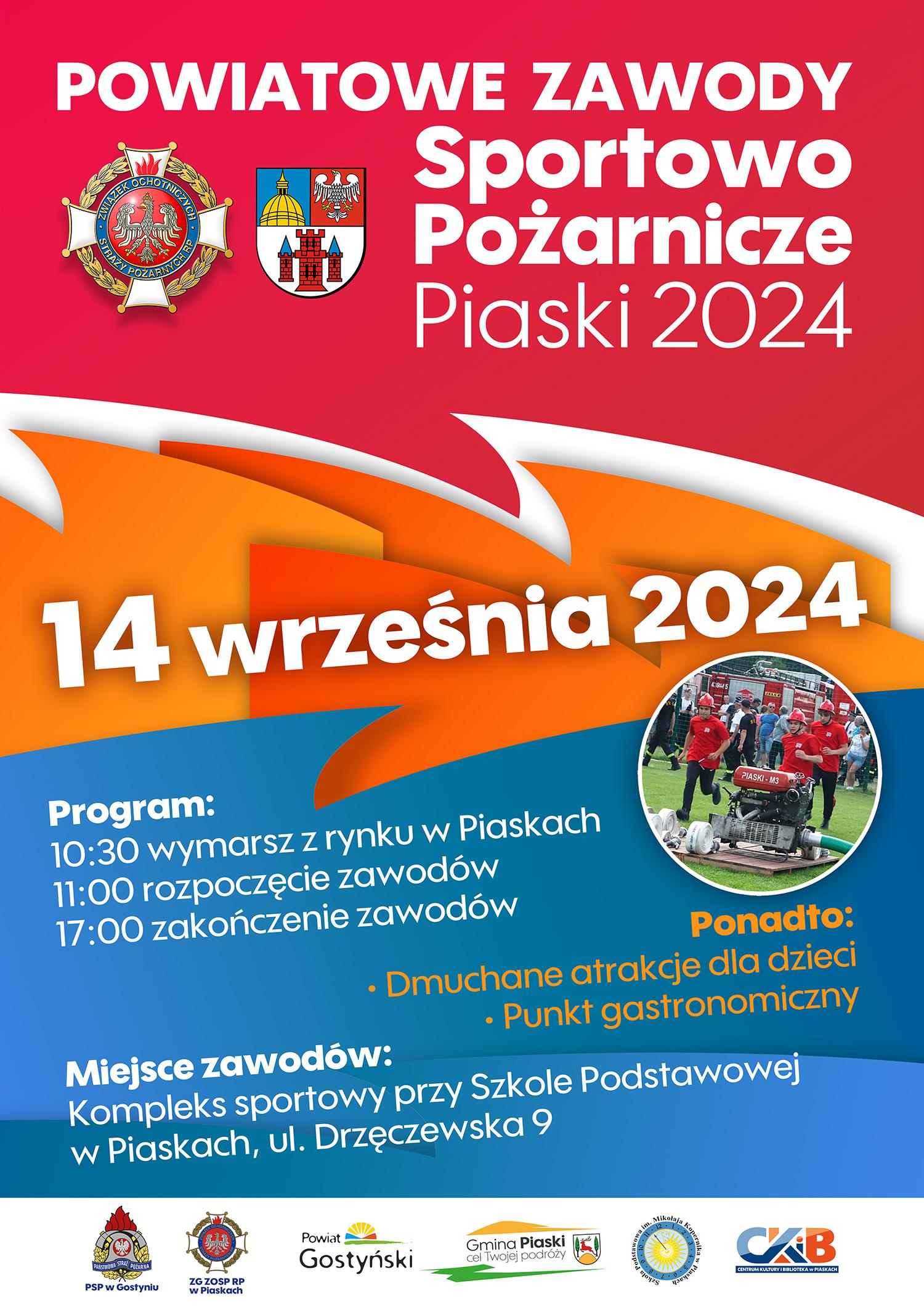Plakat przedstawia informację o zawodach sportowo-pożarniczych które mają odbyć się 14 września 2024 roku.
