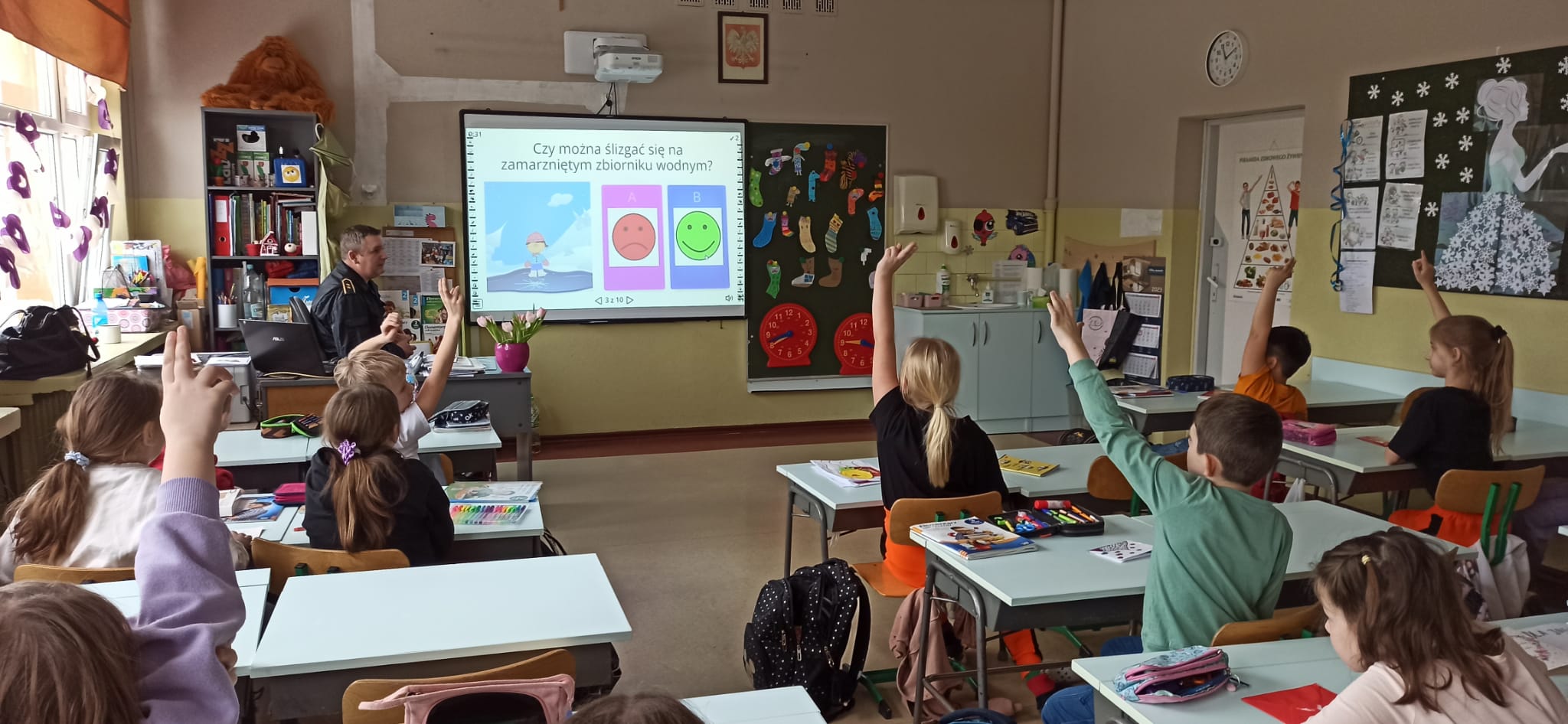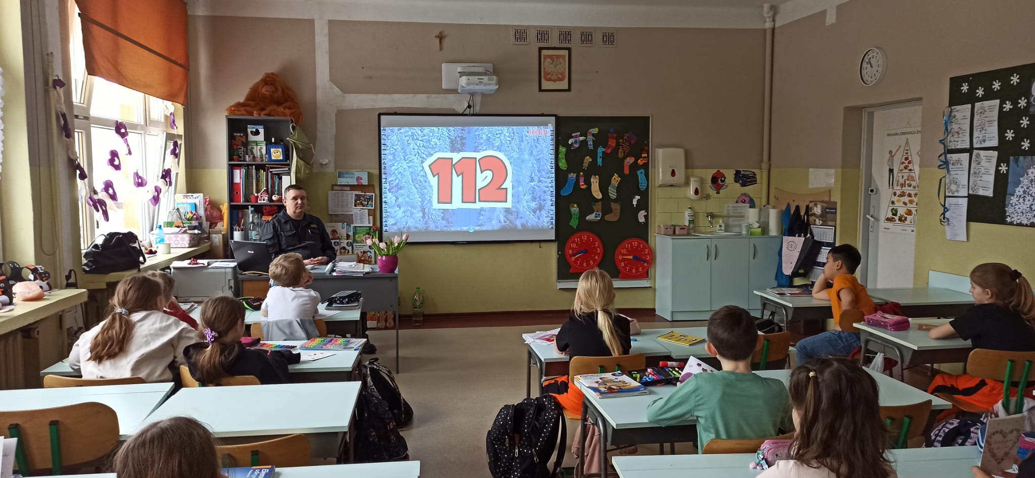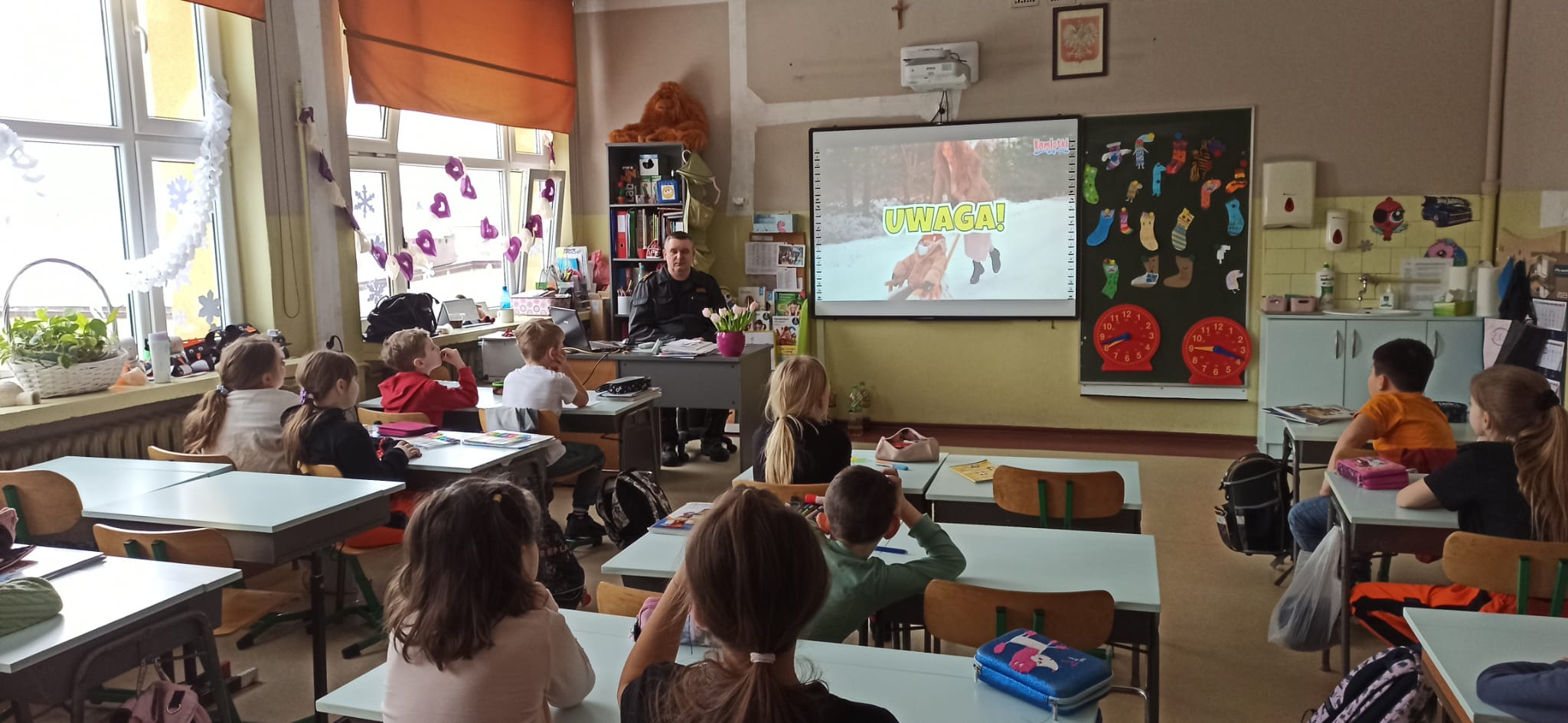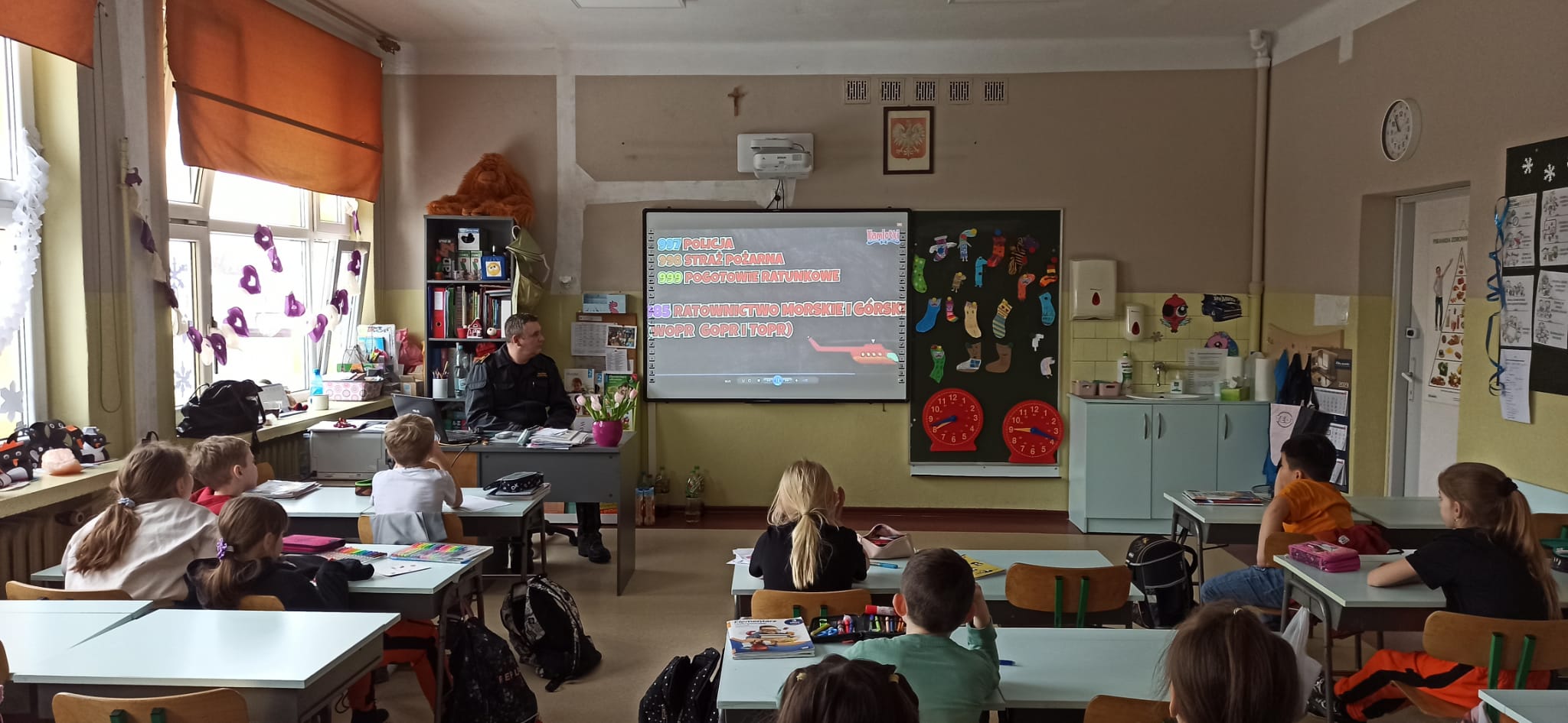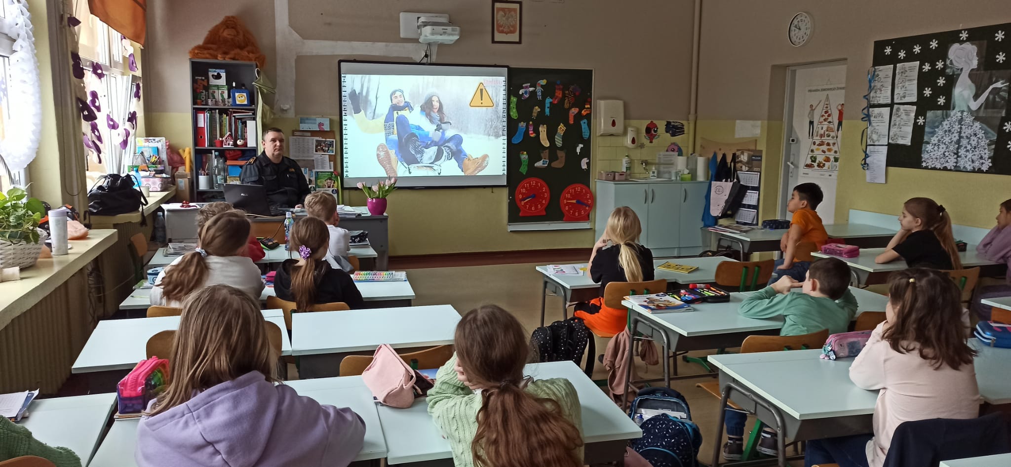 Podczas przeprowadzonych pogadanek z wykorzystaniem stosownych prezentacji i quizów słownych przedstawił zagrożenia związane z korzystaniem z tzw. „dzikich lodowisk” na zamarzniętych akwenach, zagrożenia związane z zabawami i aktywnością na świeżym powietrzu (ferie zimowe spędzane w górach, na stoku narciarskim, zjeżdżanie na sankach, organizowanie kuligów), zagrożenia związane z narażeniem swojego ciała na niskie temperatury, wykorzystanie elementów odblaskowych podczas poruszania się po zmroku, zagrożenia związane z pożarami oraz emisją tlenku węgla w obiektach mieszkalnych oraz zasady zgłaszania zdarzeń na numer alarmowy 112.