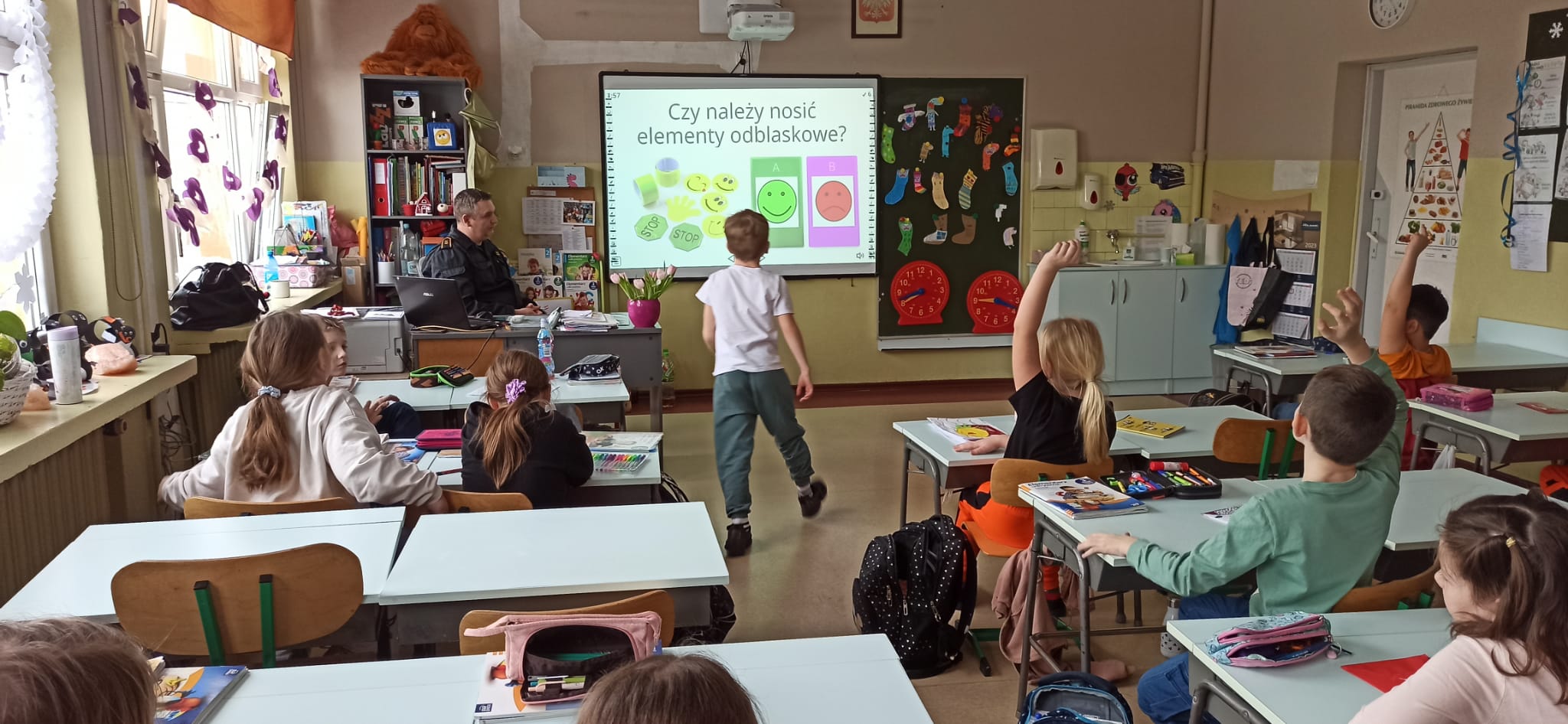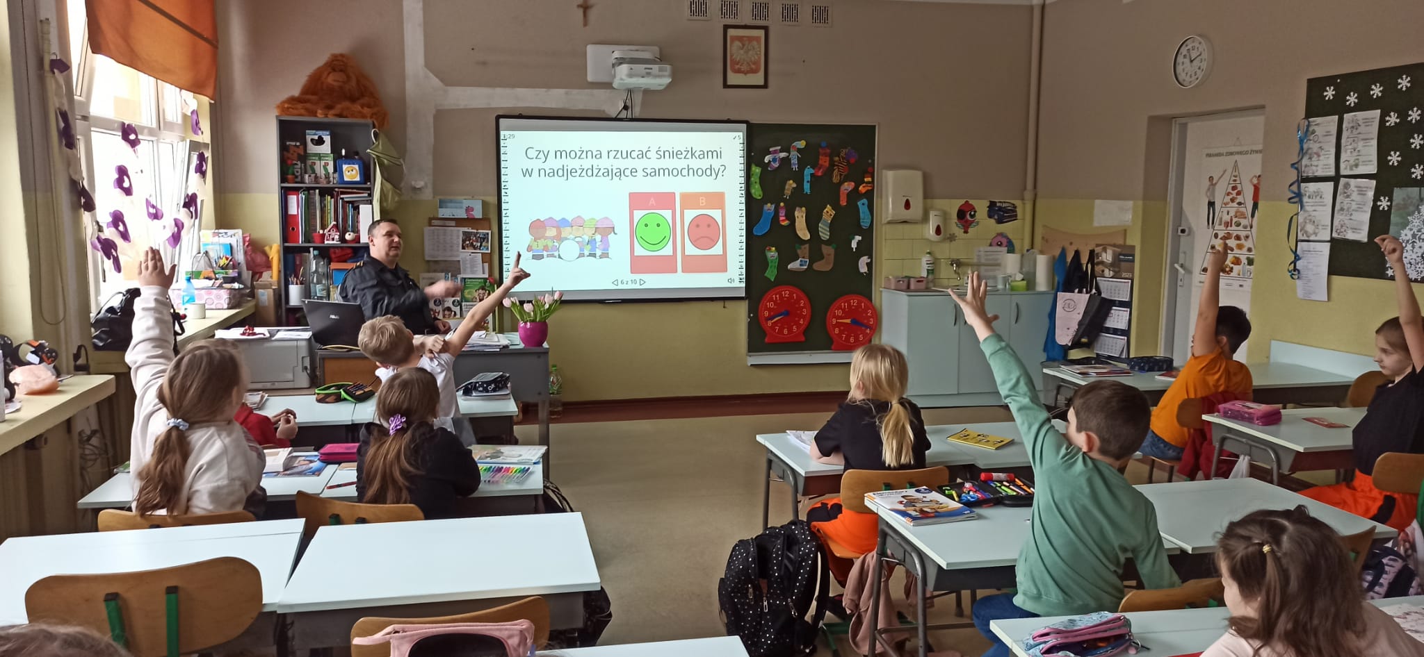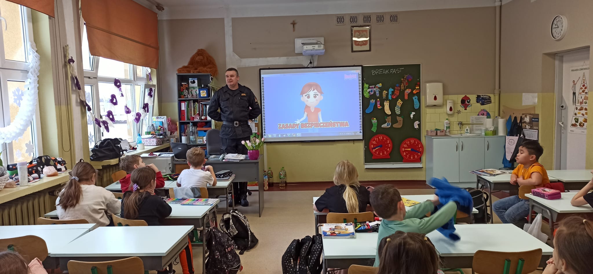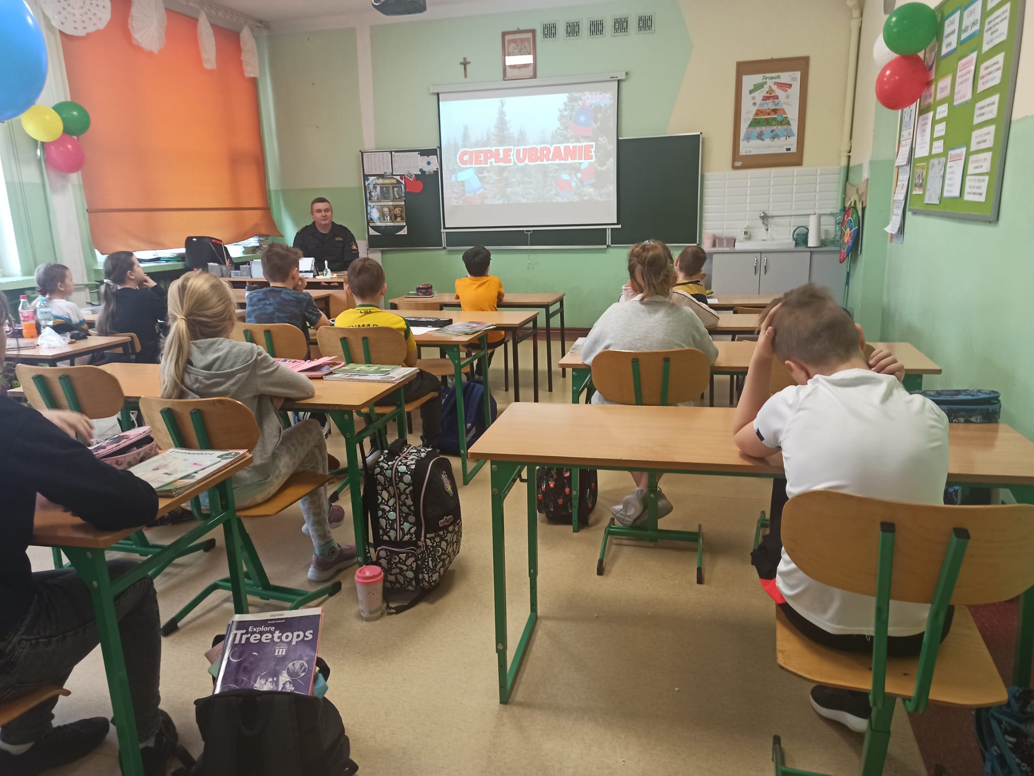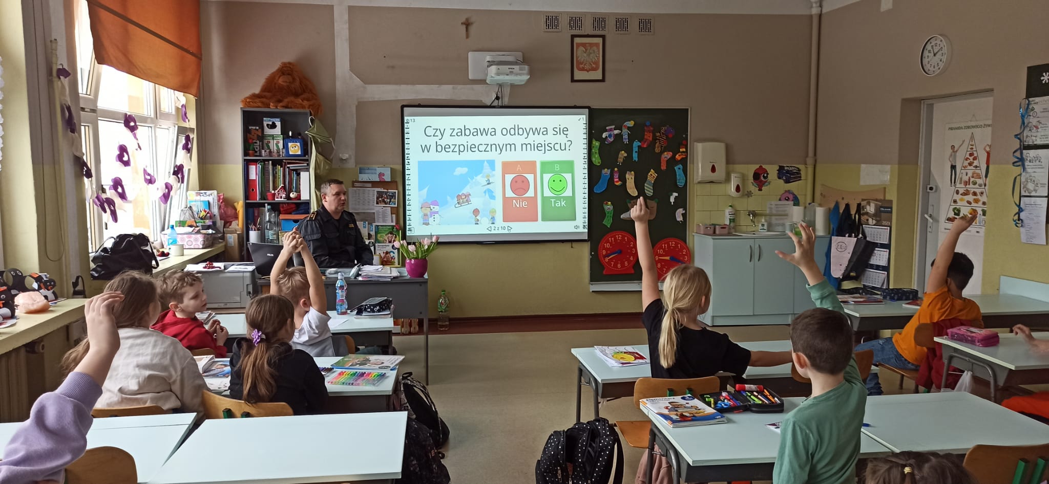 Podczas przeprowadzonych pogadanek z wykorzystaniem stosownych prezentacji i quizów słownych przedstawił zagrożenia związane z korzystaniem z tzw. „dzikich lodowisk” na zamarzniętych akwenach, zagrożenia związane z zabawami i aktywnością na świeżym powietrzu (ferie zimowe spędzane w górach, na stoku narciarskim, zjeżdżanie na sankach, organizowanie kuligów), zagrożenia związane z narażeniem swojego ciała na niskie temperatury, wykorzystanie elementów odblaskowych podczas poruszania się po zmroku, zagrożenia związane z pożarami oraz emisją tlenku węgla w obiektach mieszkalnych oraz zasady zgłaszania zdarzeń na numer alarmowy 112.