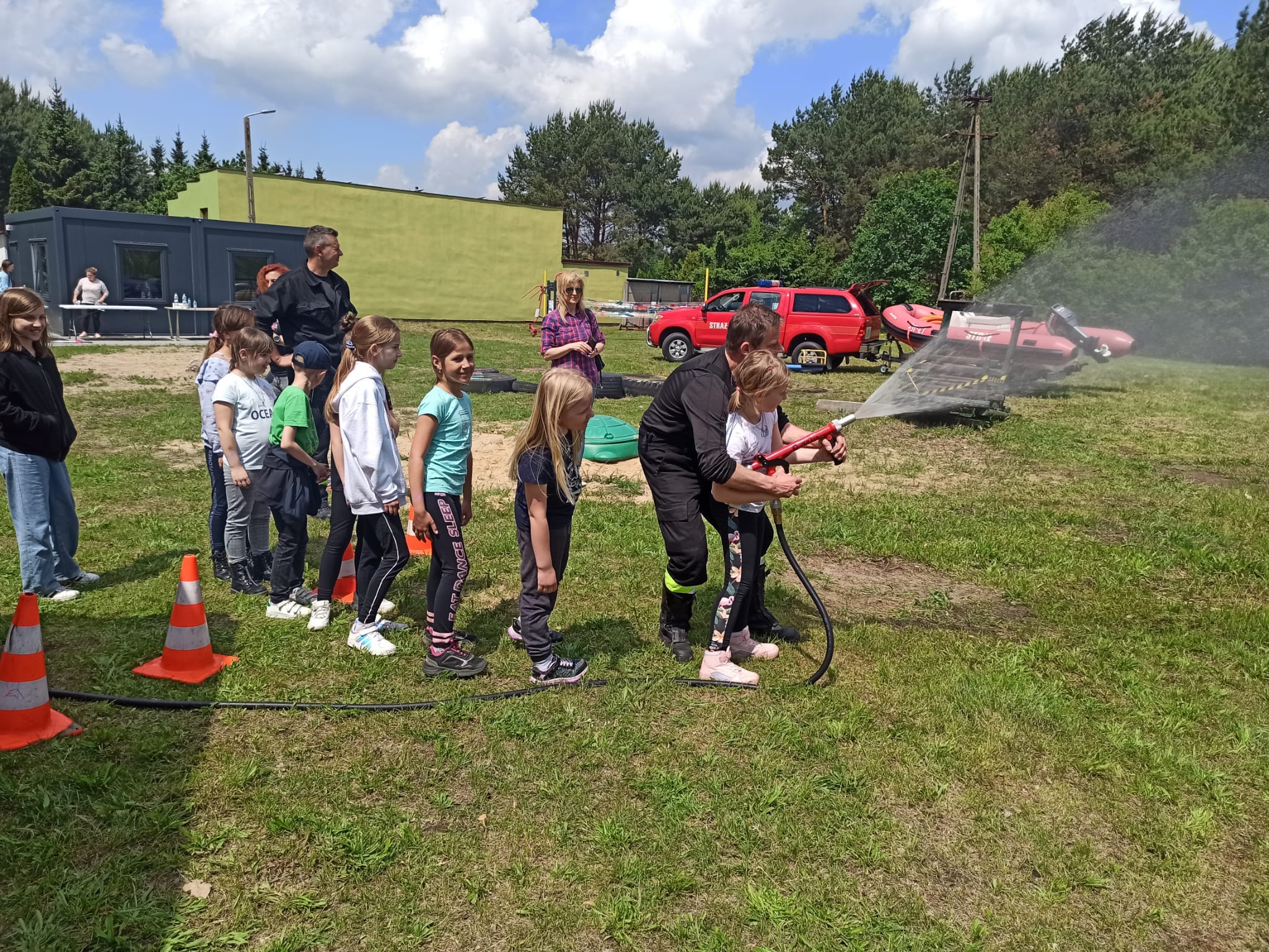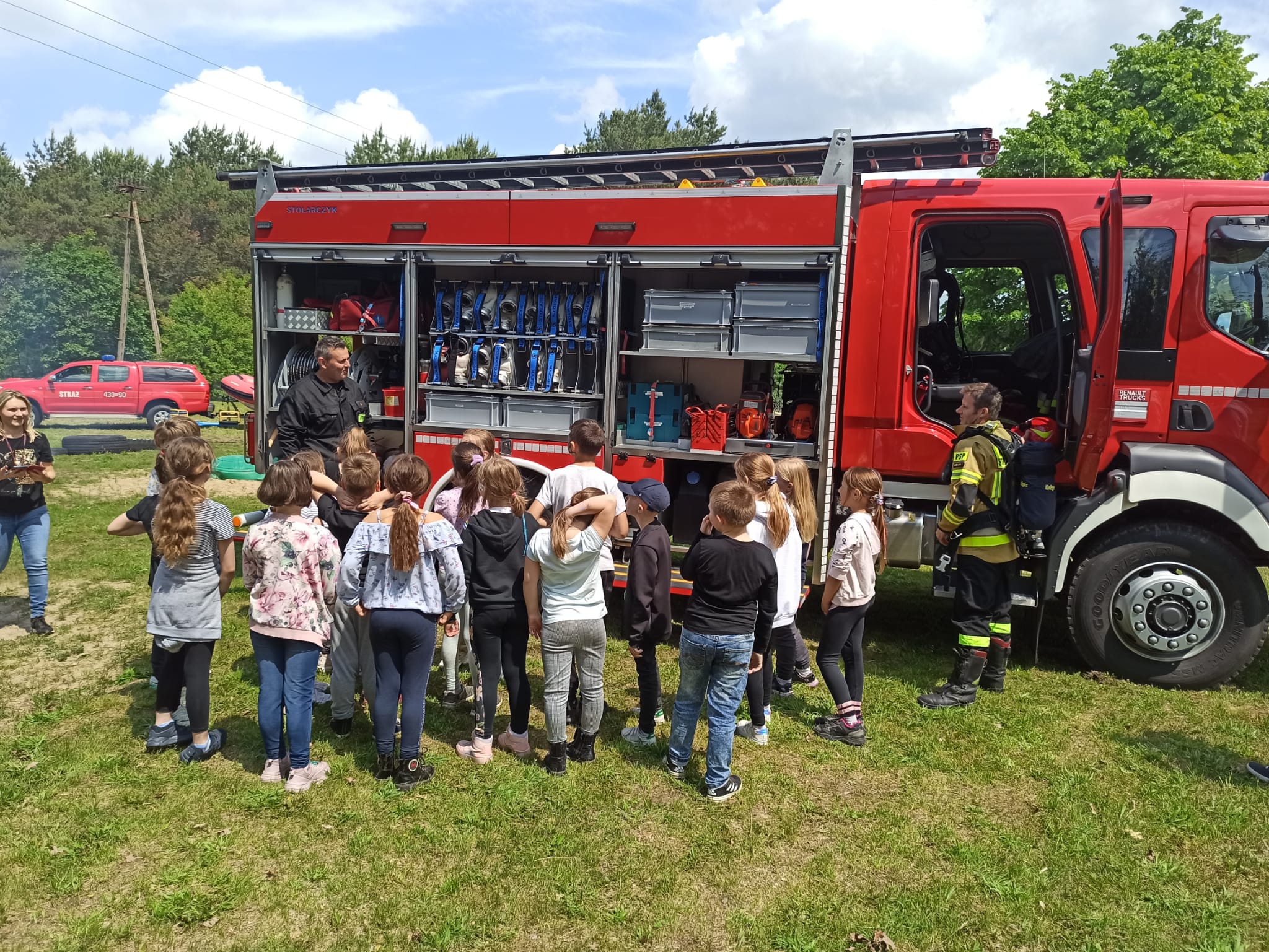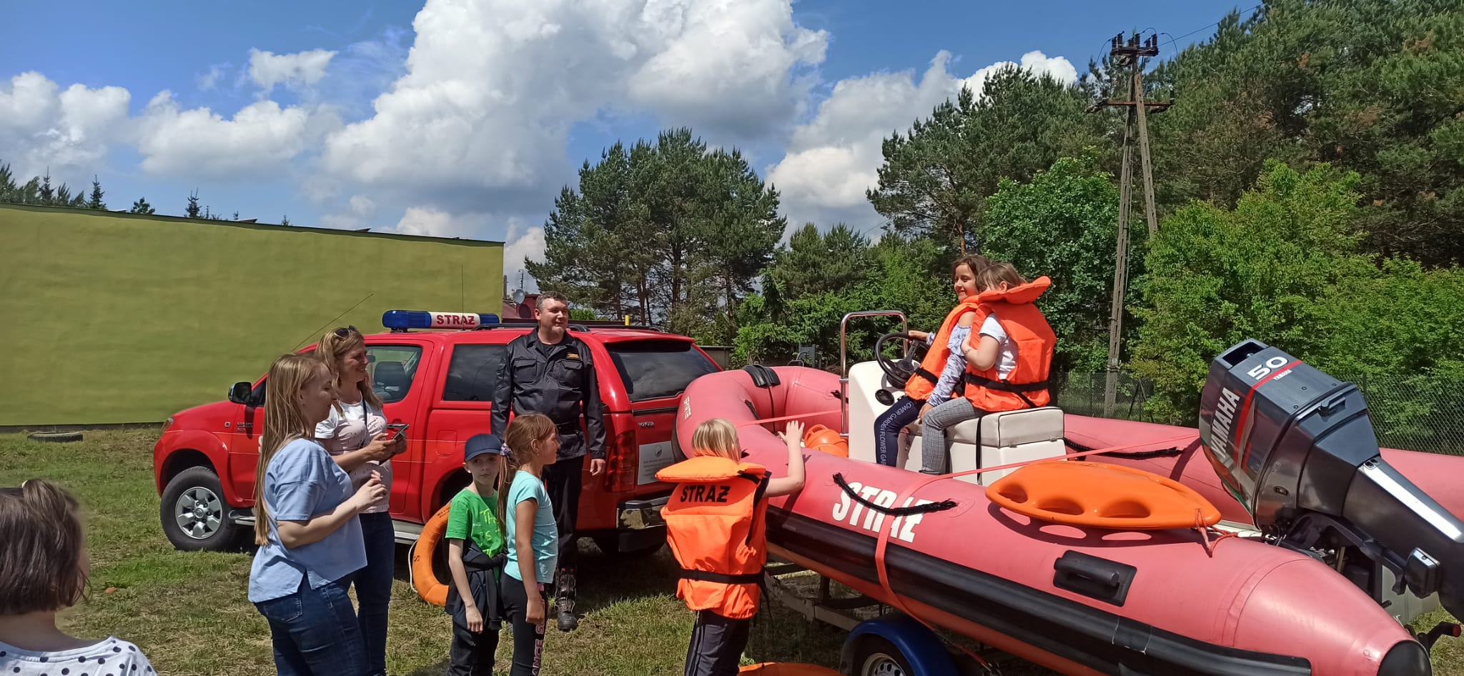 Po przeprowadzonych zajęciach w sali edukacyjnej „Ognik” strażacy uczestniczyli w zajęciach plenerowych podczas, których zaprezentowano sprzęt pożarniczy oraz łódź wykorzystywaną podczas działań z zakresu ratownictwa wodnego. Ważnym elementem spotkania plenerowego było omówienie zasad bezpiecznego wypoczynku nad wodą, co może podnieść poziom bezpieczeństwa podczas zbliżających się wakacji. Dzieci miały możliwość zobaczyć oraz wziąć do ręki każdy sprzęt, który stanowił wyposażenie samochodów pożarniczych. Nieodzownym elementem spotkania było podanie wody z prądownicy, czy też założenie hełmu lub ubrania strażackiego. Atrakcją była również łódź ratownicza, za sterami której oczywiście zasiedli młodzi adepci sztuki pożarniczej.