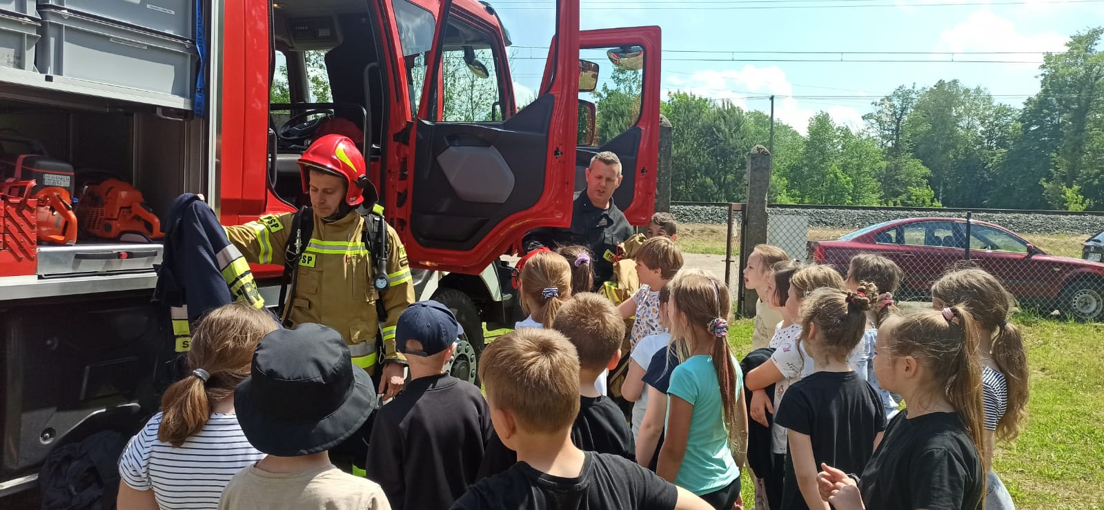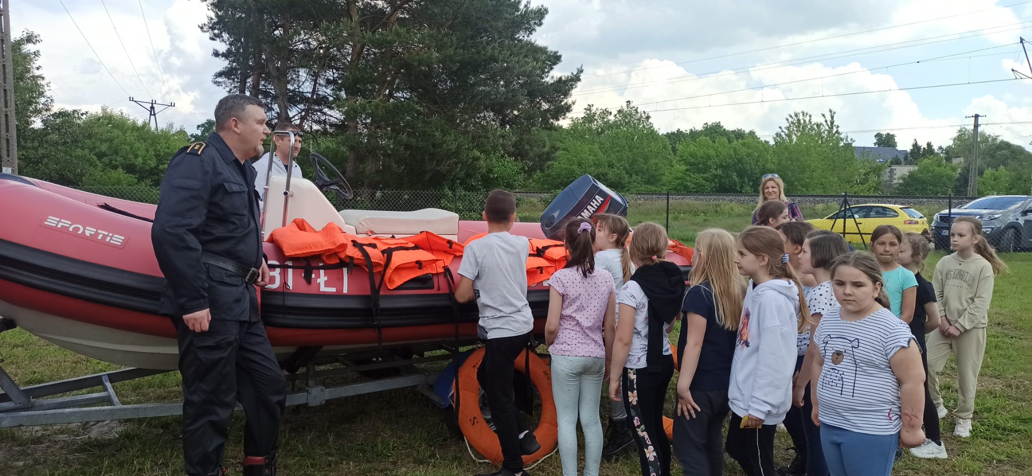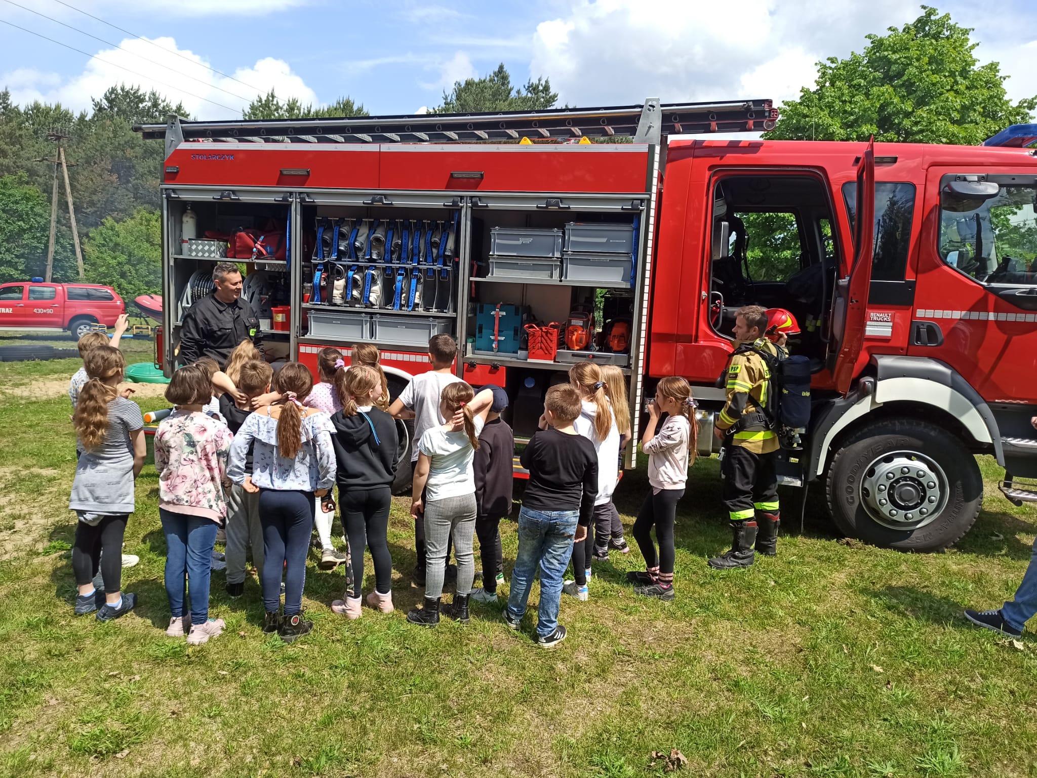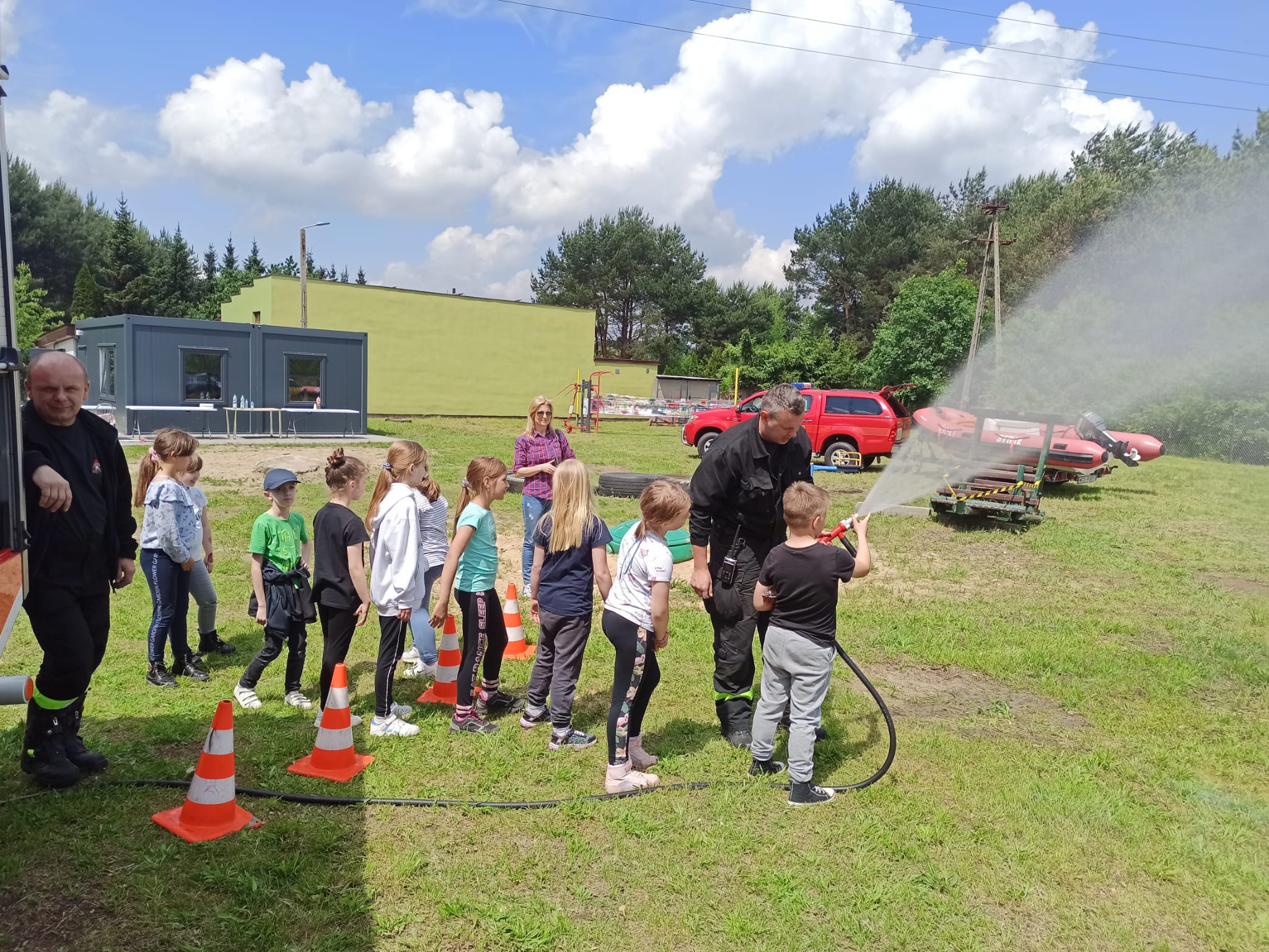Po przeprowadzonych zajęciach w sali edukacyjnej „Ognik” strażacy uczestniczyli w zajęciach plenerowych podczas, których zaprezentowano sprzęt pożarniczy oraz łódź wykorzystywaną podczas działań z zakresu ratownictwa wodnego. Ważnym elementem spotkania plenerowego było omówienie zasad bezpiecznego wypoczynku nad wodą, co może podnieść poziom bezpieczeństwa podczas zbliżających się wakacji. Dzieci miały możliwość zobaczyć oraz wziąć do ręki każdy sprzęt, który stanowił wyposażenie samochodów pożarniczych. Nieodzownym elementem spotkania było podanie wody z prądownicy, czy też założenie hełmu lub ubrania strażackiego. Atrakcją była również łódź ratownicza, za sterami której oczywiście zasiedli młodzi adepci sztuki pożarniczej.