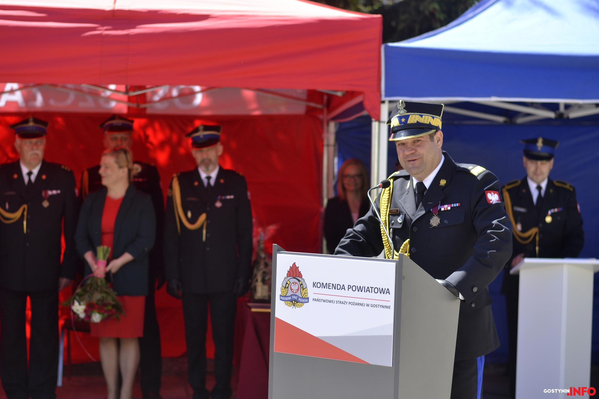 Po podniesieniu flagi państwowej i odegraniu Mazurka Dąbrowskiego, Komendant Powiatowy Państwowej Straży Pożarnej w Gostyninie st. bryg. Andrzej Ledzion przywitał wszystkich obecnych na uroczystości oraz wygłosił okazjonalne przemówienie.