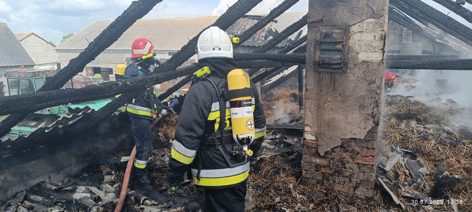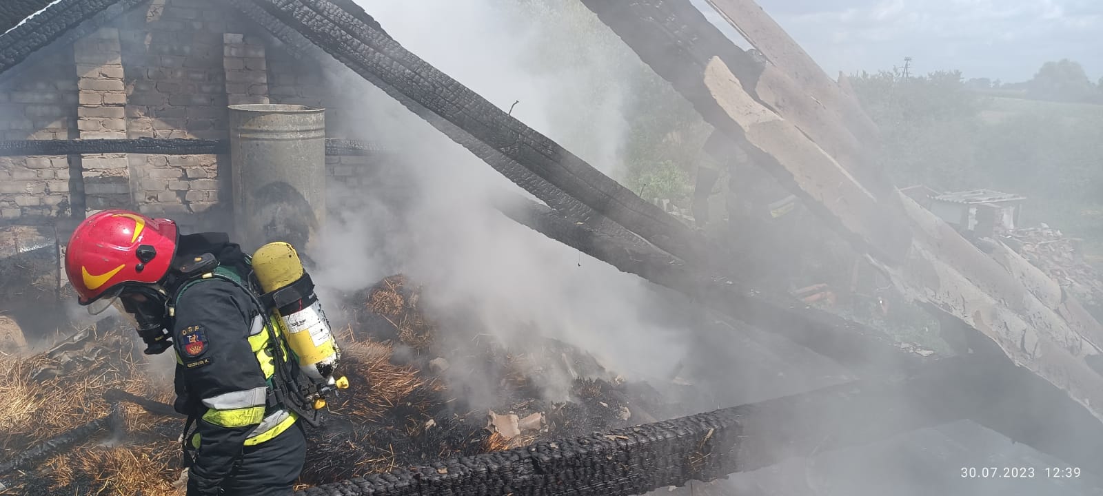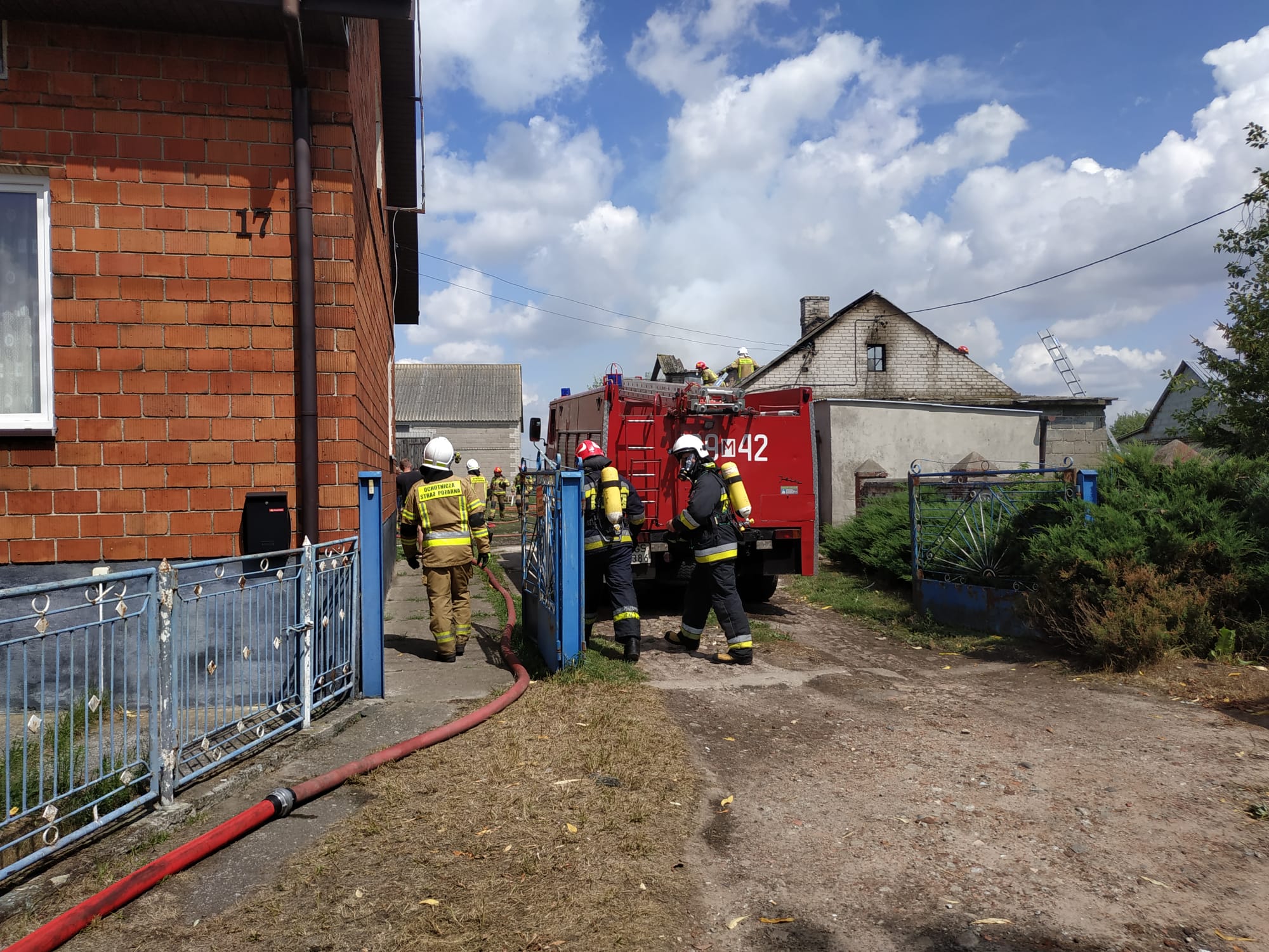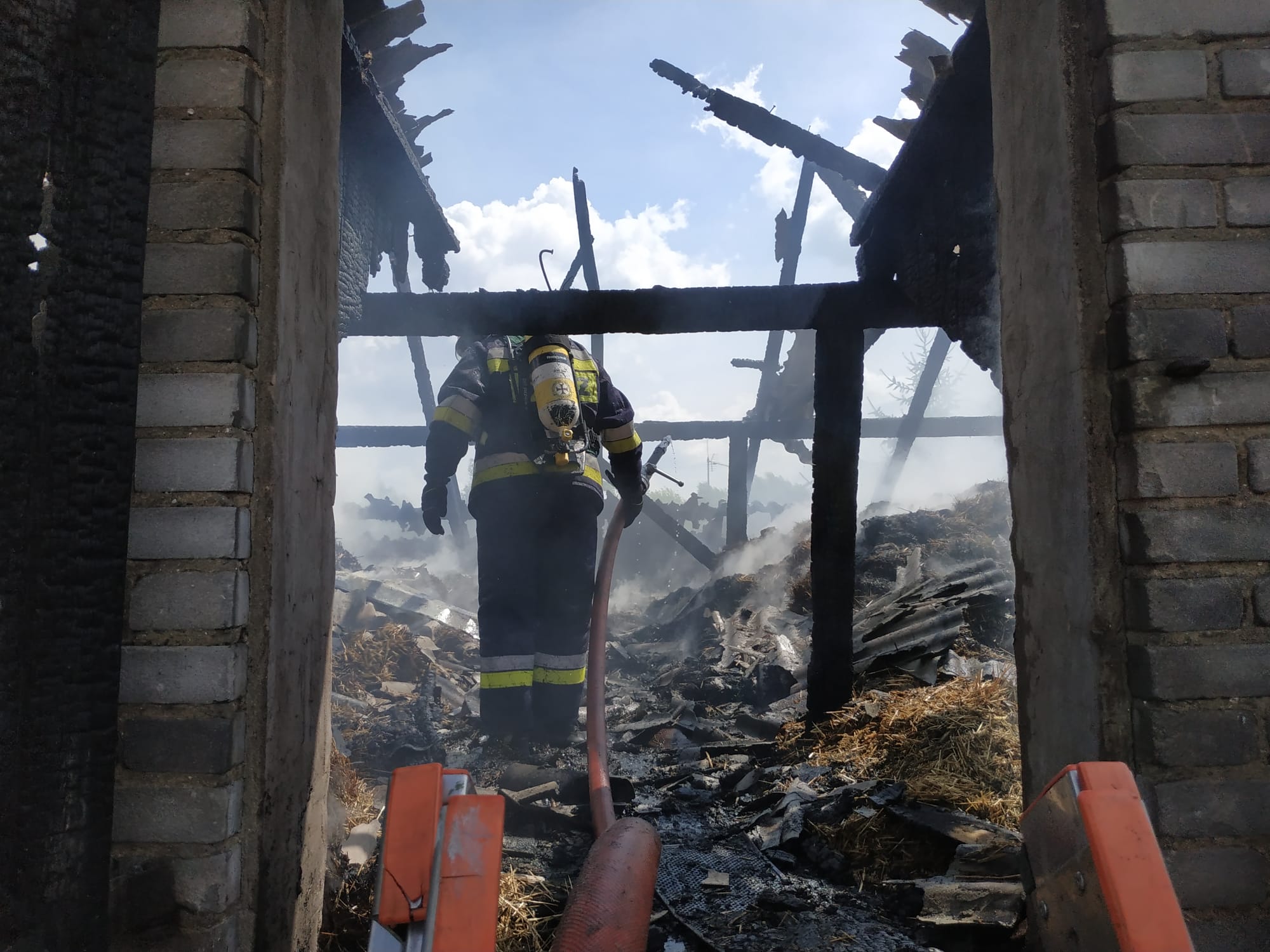 Po dojeździe na miejsce zdarzenia okazało się, że pożarem całkowicie objęty był dach oraz poddasze budynku inwentarskiego. Działania straży pożarnej polegały na zabezpieczeniu miejsca zdarzenia, podaniu pięciu prądów wody w natarciu na pożar. W dalszej kolejności usunięto składowaną słomę i siano z poddasza i dokładnie przelano wodą. Jednocześnie dokonano całkowitej rozbiórki konstrukcji dachu, która zagrażała zawaleniu. Po lokalizacji pożaru dalsze działania polegały na dokładnym przelewaniu pogorzeliska wodą. Z uwagi na duże zadymienie ratownicy pracowali w aparatach ochrony układu oddechowego.