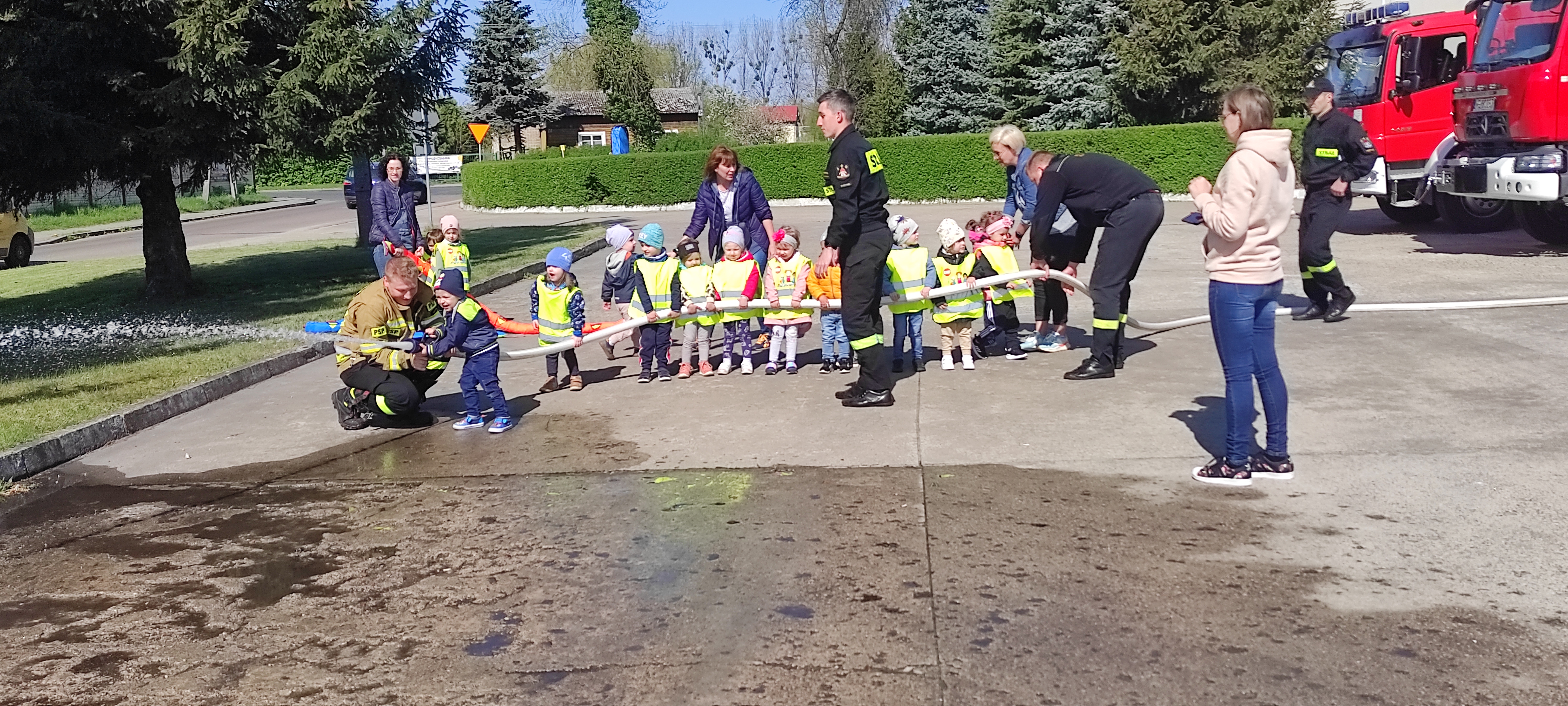 Dzieci przez chwilę miały okazję wcielić się w rolę strażaków, zasiąść w samochodzie pożarniczym i podać wodę do pożaru.