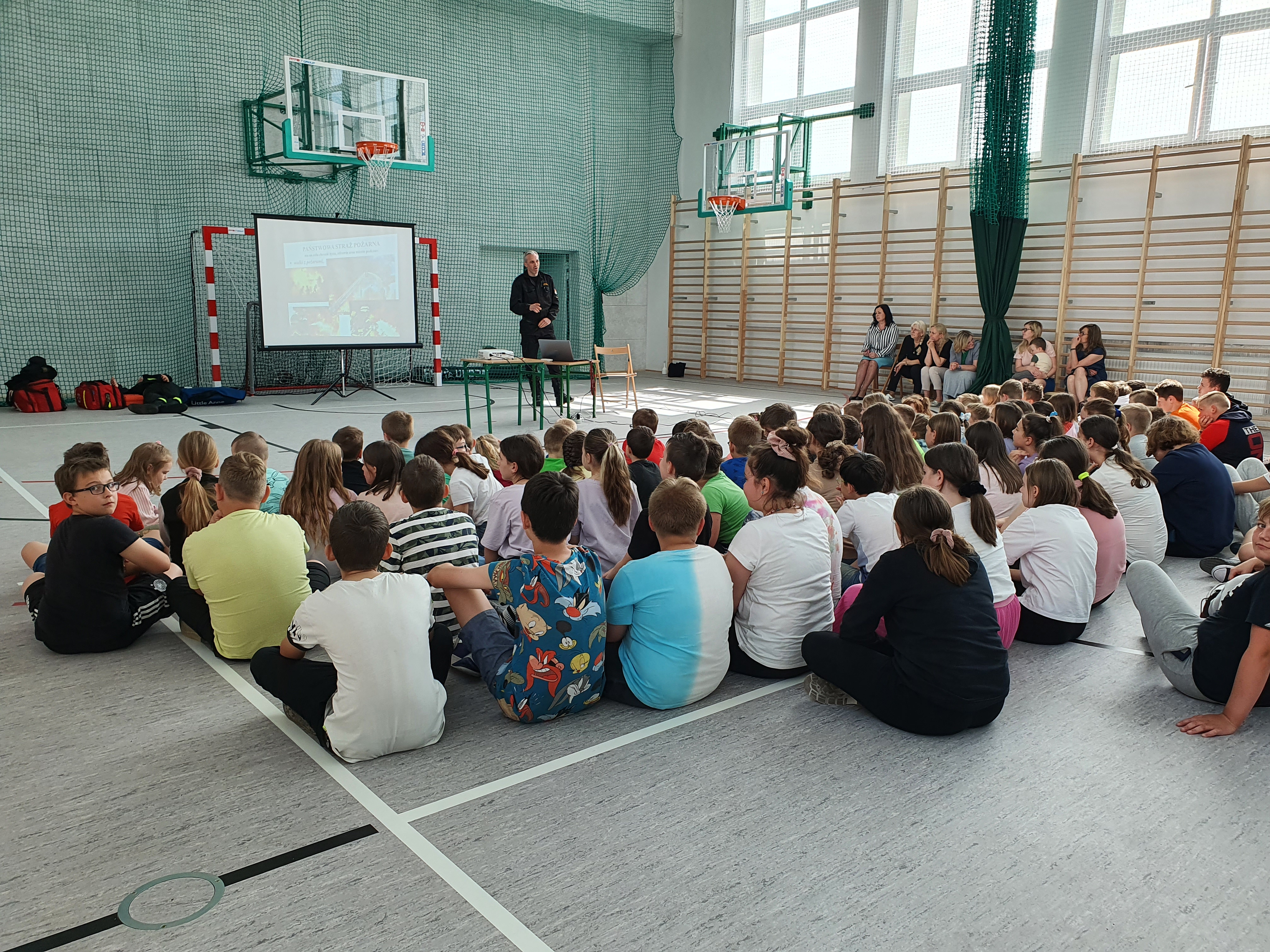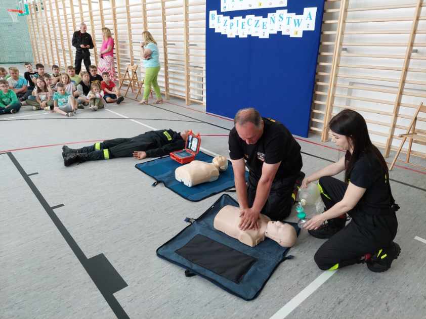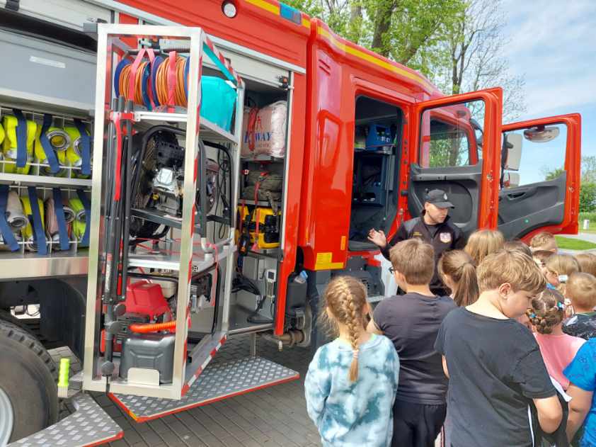 W dbałości o bezpieczeństwo w domu oraz podczas wypoczynku dzieci i młodzieży omówione zostały zagrożenia pożarowe oraz podstawowe sposoby zachowania na wypadek ich wystąpienia. Zwrócono szczególną uwagę na zagrożenia z jakimi można spotkać się w domu, podczas wypoczynku oraz w czasie niebezpiecznej pogody. Omówione zostały również sposoby wzywania pomocy podczas niebezpieczeństwa. W dalszej części spotkania omówione zostały i praktycznie zaprezentowane zasady udzielania pierwszej pomocy przedmedycznej. Kolejnym punktem wizyty było zaprezentowanie sprzętu pożarniczego, który wykorzystywany jest podczas działań.