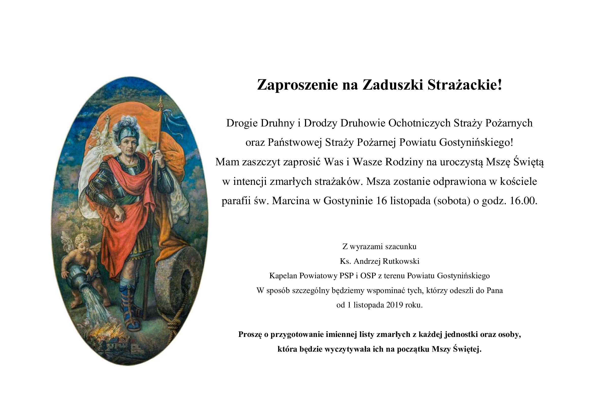 Serdecznie zapraszamy wszystkich strażaków, druhny i druhów, rodziny oraz wszystkich chętnych do uczestnictwa w Mszy Świętej w intencji zmarłych strażaków z terenu powiatu gostynińskiego, która odbędzie się 16 listopada (sobota) o godz. 16:00 w kościele parafii św. Marcina w Gostyninie.