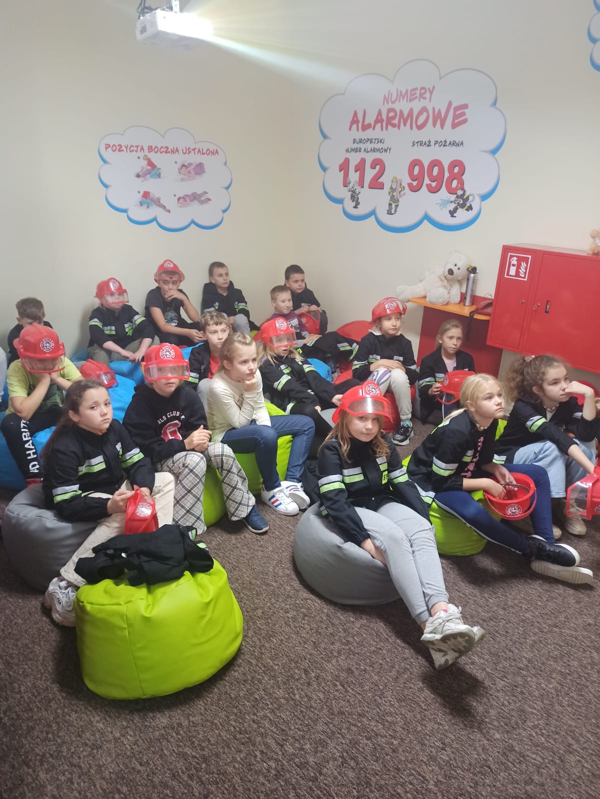 Podczas zajęć edukacyjnych przeprowadzonych w ramach prewencji społecznej, zostały zrealizowane zajęcia w sali edukacyjnej „Ognik”, gdzie przedstawiona została sylwetka strażaka oraz aspekty jego pracy. Podczas spotkania z dziećmi omówiono zagrożenia z jakimi można spotkać się w domu, w szkole oraz podczas wypoczynku. Przedstawiono również sposoby wzywania pomocy za pomocą numeru alarmowego 112.