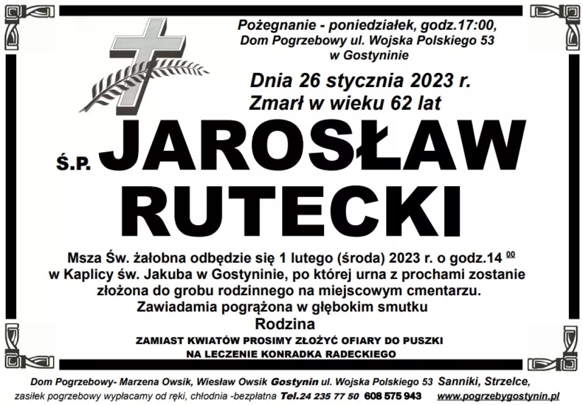 Ze smutkiem informujemy, że 26 stycznia 2023r., zmarł w wieku 62 lat emerytowany funkcjonariusz Komendy Rejonowej Państwowej Straży Pożarnej w Gostyninie Jarosław Rutecki.