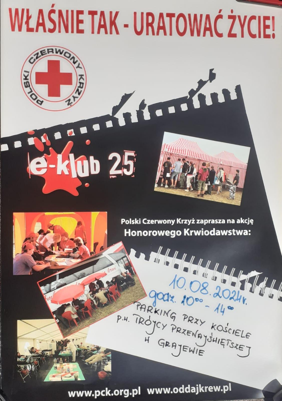 Pobieranie krwi zostanie przeprowadzone w sobotę 10 sierpnia 2024 r. od godz. 10:00 do godz. 14:00 na parkingu przy Kościele Trójcy Przenajświętszej w Grajewie (wjazd od strony ul. Ełckiej).