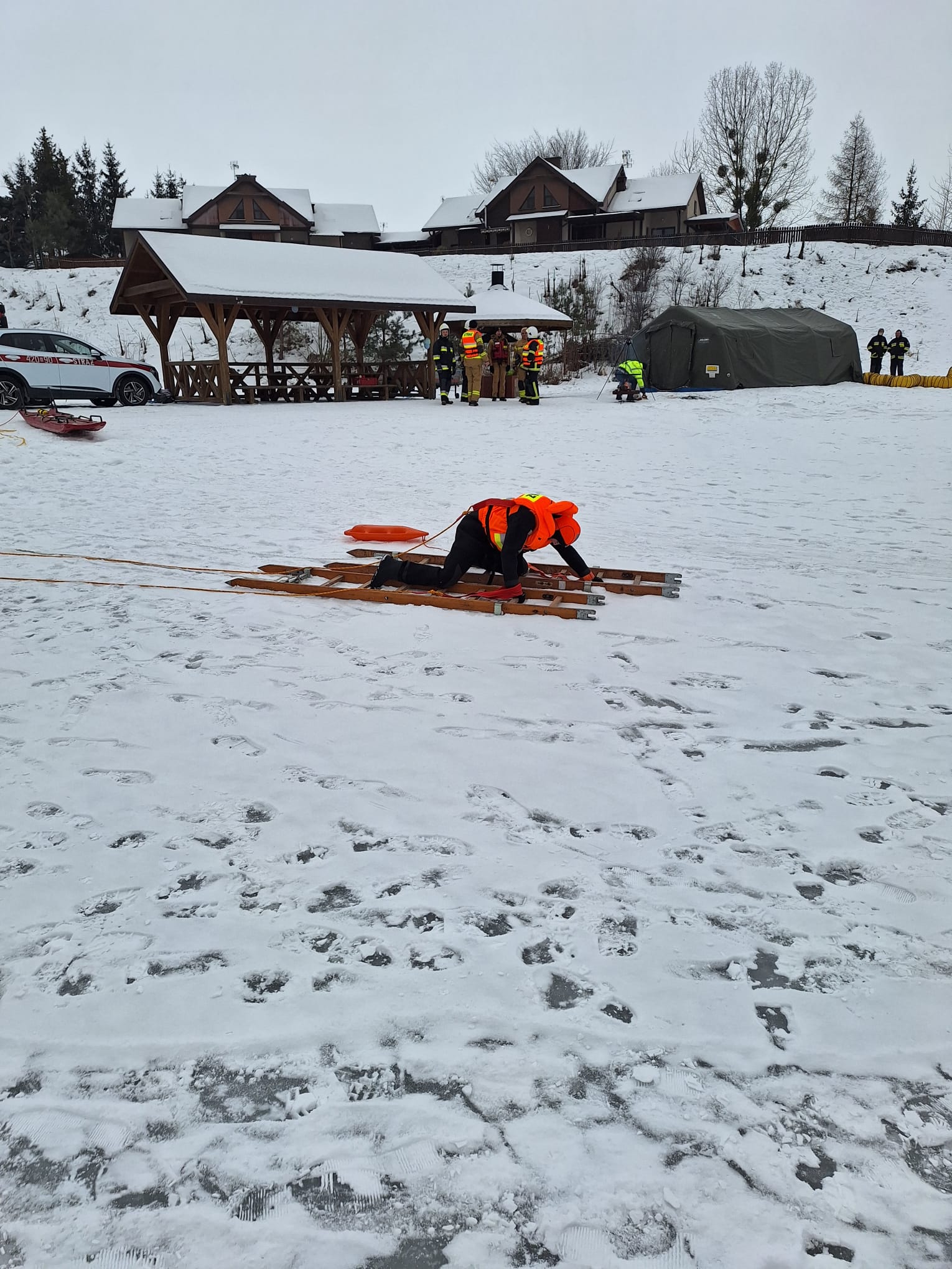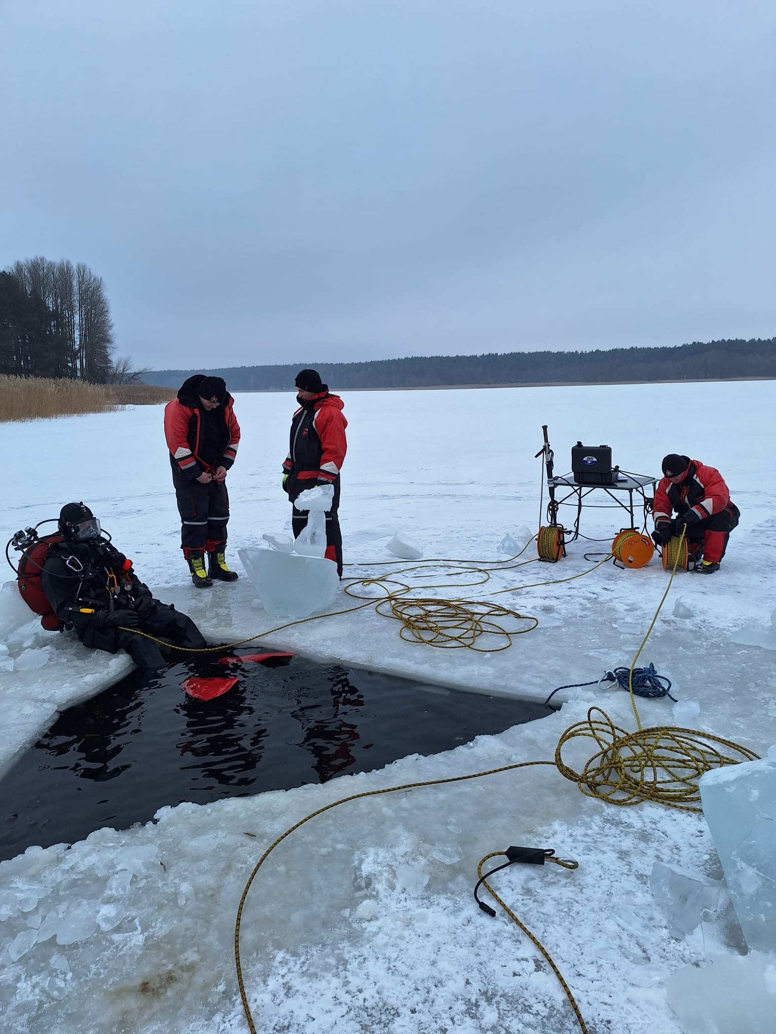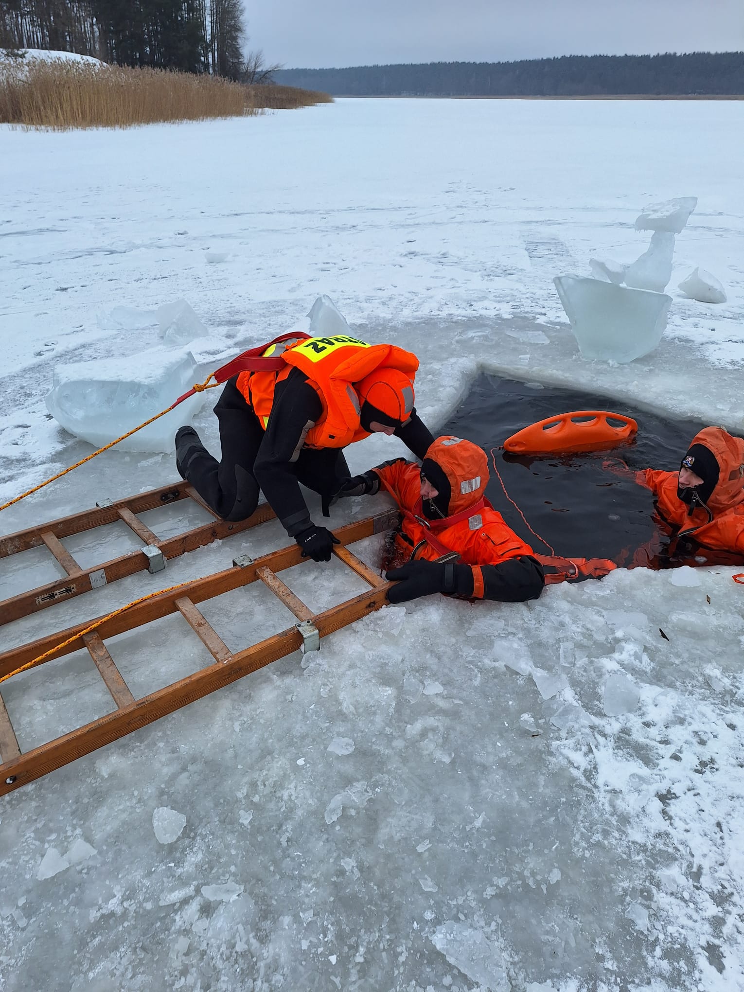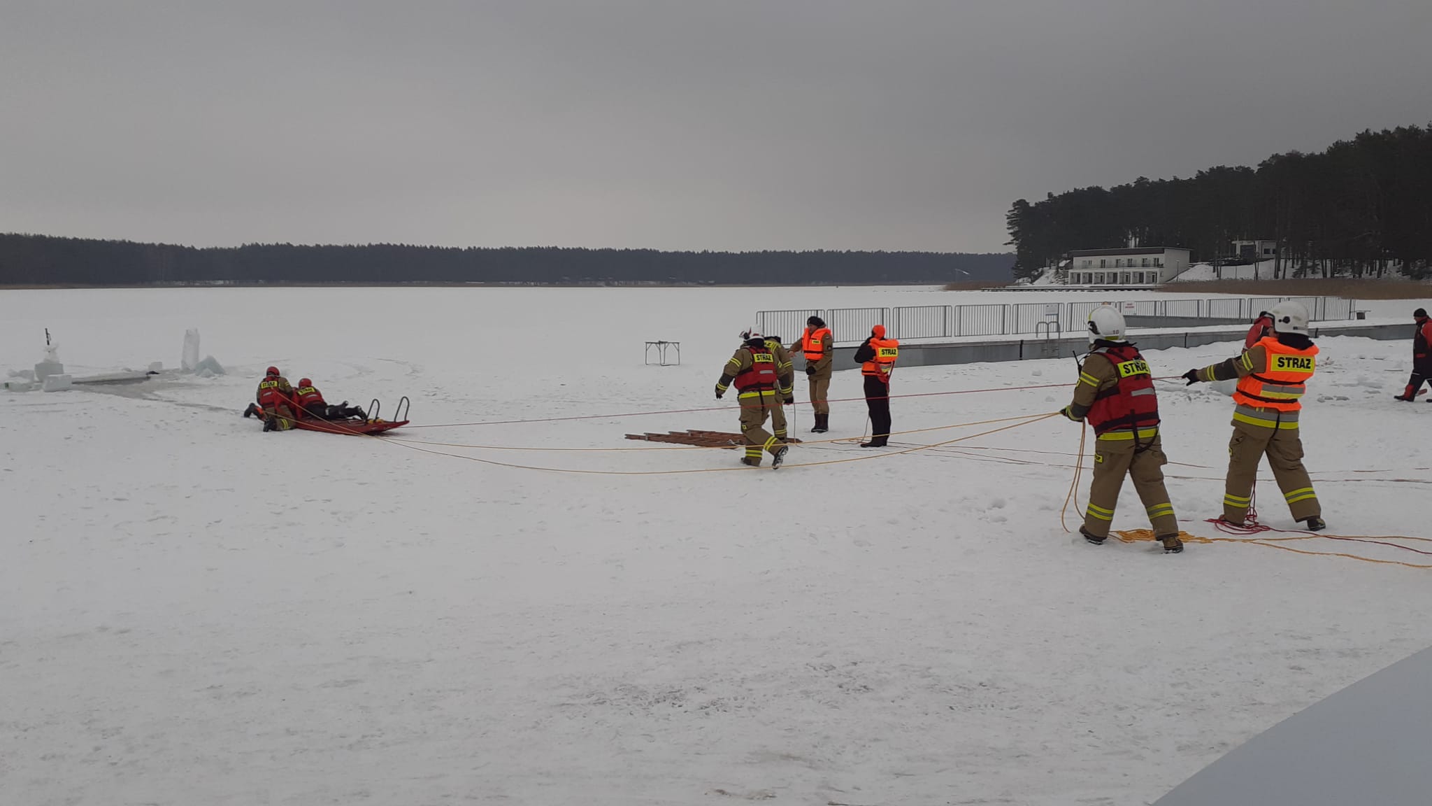 Scenariusz ćwiczeń przewidywał załamanie się lodu pod samochodem, którym podróżowały 4 osoby. Dwie z nic wydostały się na powierzchnię i znajdują się na granicy wody i lodu. Dwie kolejne pozostały pod wodą i najprawdopodobniej są uwięzione w pojeździe.