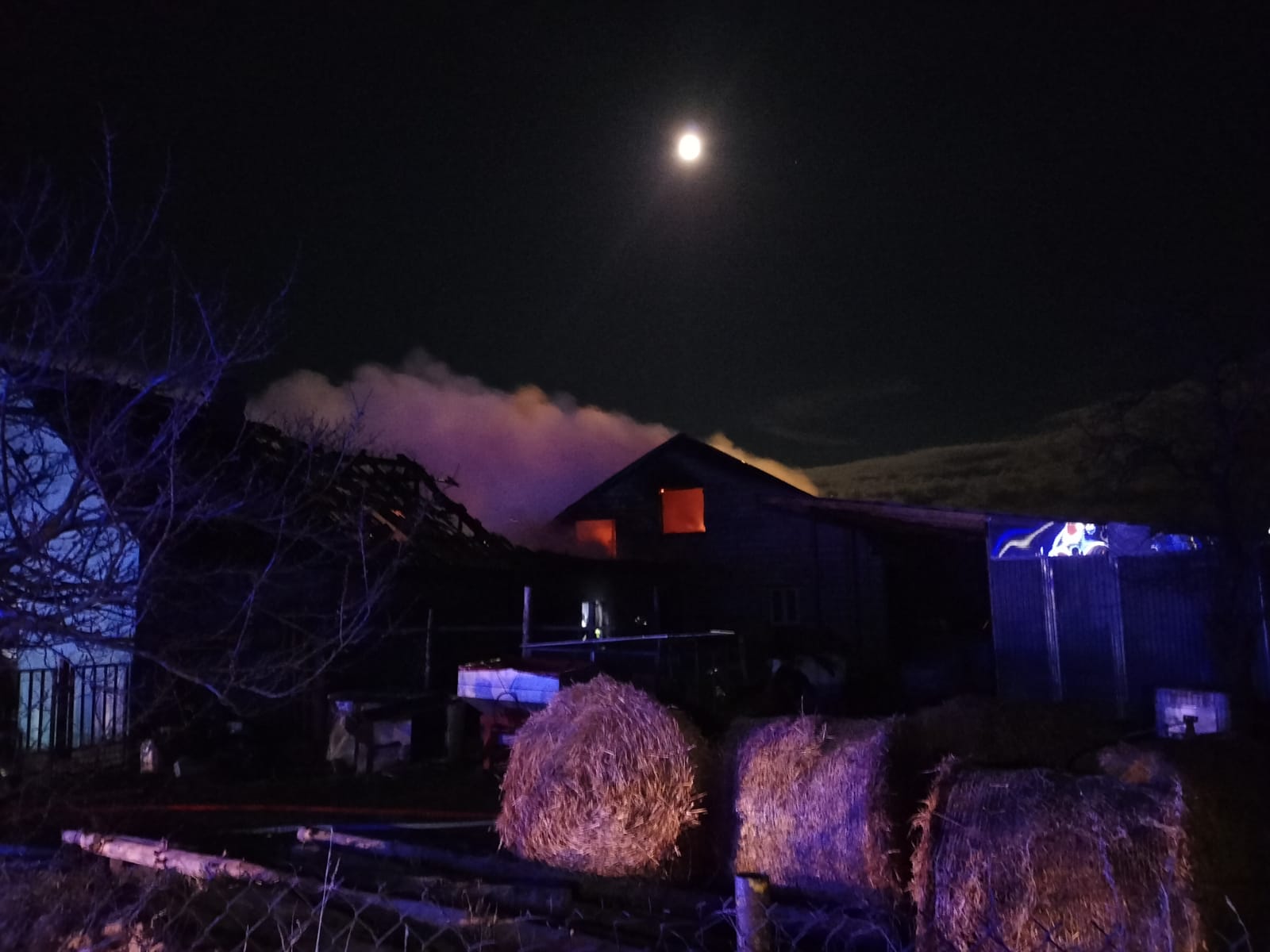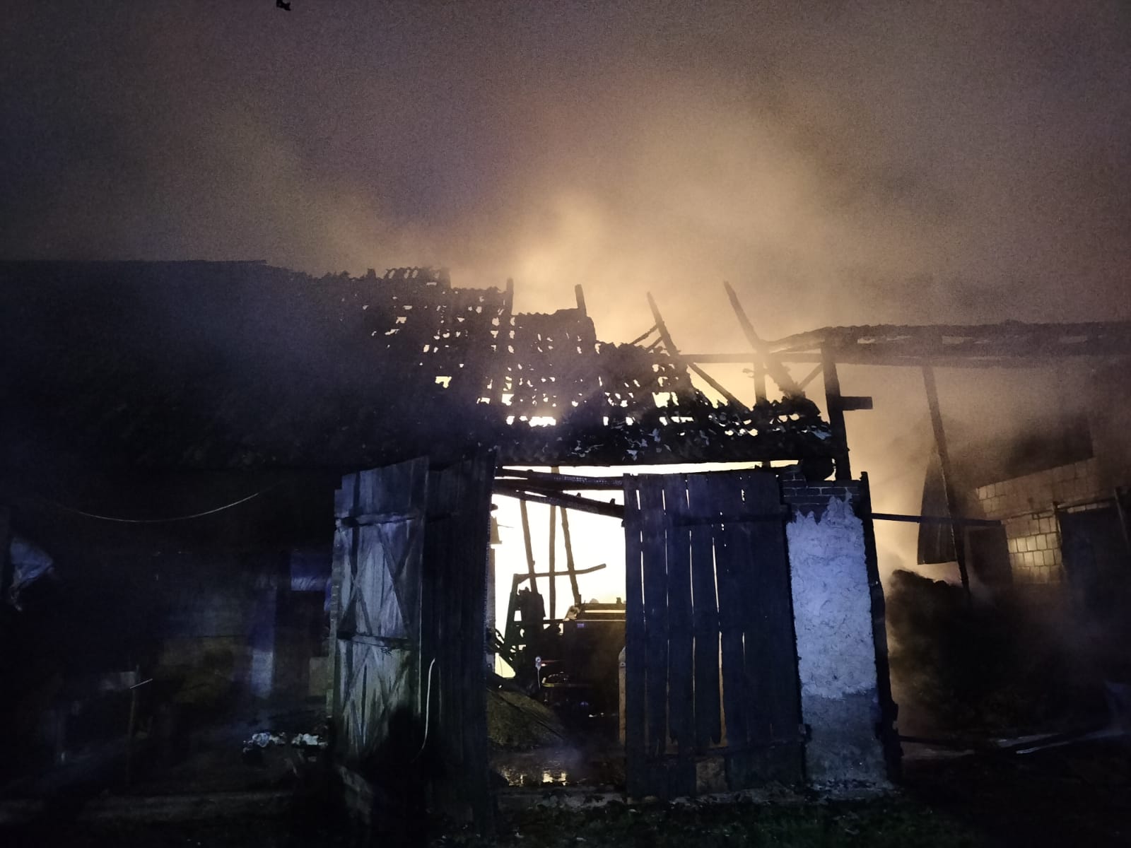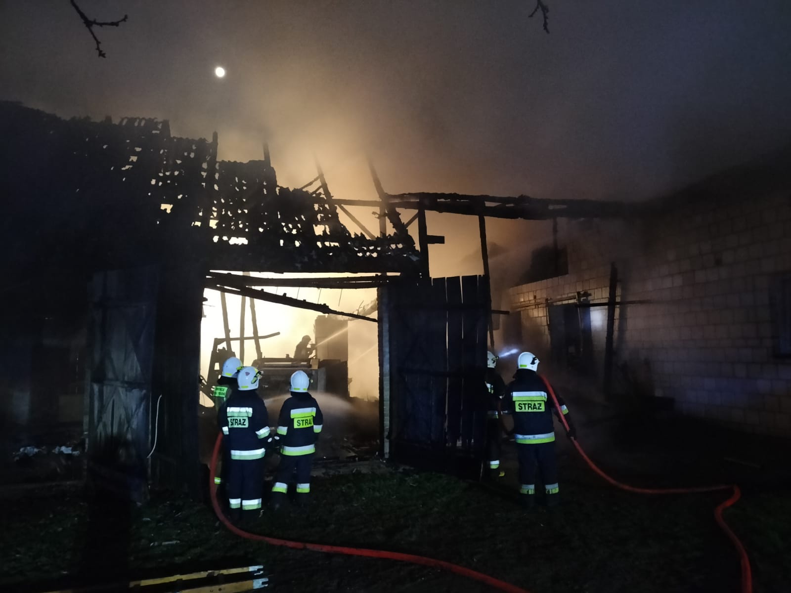 Dnia 16 kwietnia po godzinie 23 do Stanowiska Kierowania Komendanta Powiatowego PSP w Grajewie wpłynęła informacja o pożarze budynku inwentarskiego na jednej z posesji w Dołęgach w gminie Szczuczyn. Do zdarzenia zadysponowano w pierwszym rzucie 5 zastępów straży pożarnej. Po dojeździe na miejsce zdarzenia pierwszych jednostek ochrony przeciwpożarowej okazało się, że pożarem objęta jest stodoło – obora oraz dwa bezpośrednio przylegające do niej budynki gospodarcze. Z uwagi na fakt, że pożar szybko się rozprzestrzeniał działania ratowniczo – gaśnicze polegały na ewakuacji z palącej się obory 56 szt. bydła mlecznego i podaniu 3 prądów gaśniczych wody w natarciu na palącą się stodoło – oborę oraz w obronie bezpośrednio przylegającego kompleksu garaży, w których znajdował się sprzęt rolniczy. W trakcie ewakuacji zwierząt właściciel gospodarstwa zasłabł, a przybyły na miejsce ZRM po przebadaniu przewiózł mężczyznę do szpitala. Jego zdrowiu nie zagraża niebezpieczeństwo.