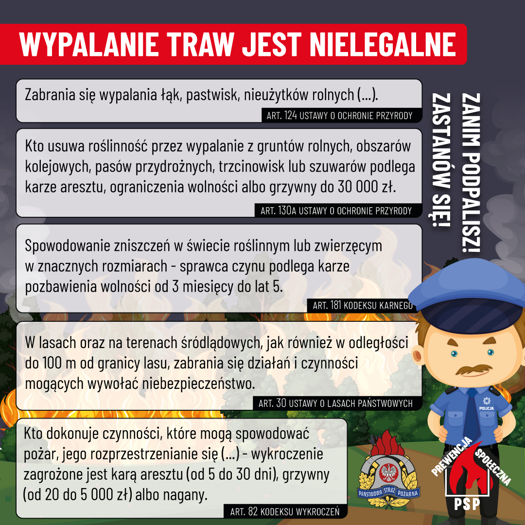 - O tym, że postępowanie takie jest niedozwolone mówi m.in. ustawa z dnia 1 września 2022 roku w ustawie o ochronie przyrody. Dodany został przepis Art. 130a., który mówi, że osoba, która usuwa roślinność przez wypalanie z gruntów rolnych, obszarów kolejowych, pasów przydrożnych, trzcinowisk lub szuwarów podlega karze aresztu, ograniczenia wolności albo grzywny do 30 000 złotych.