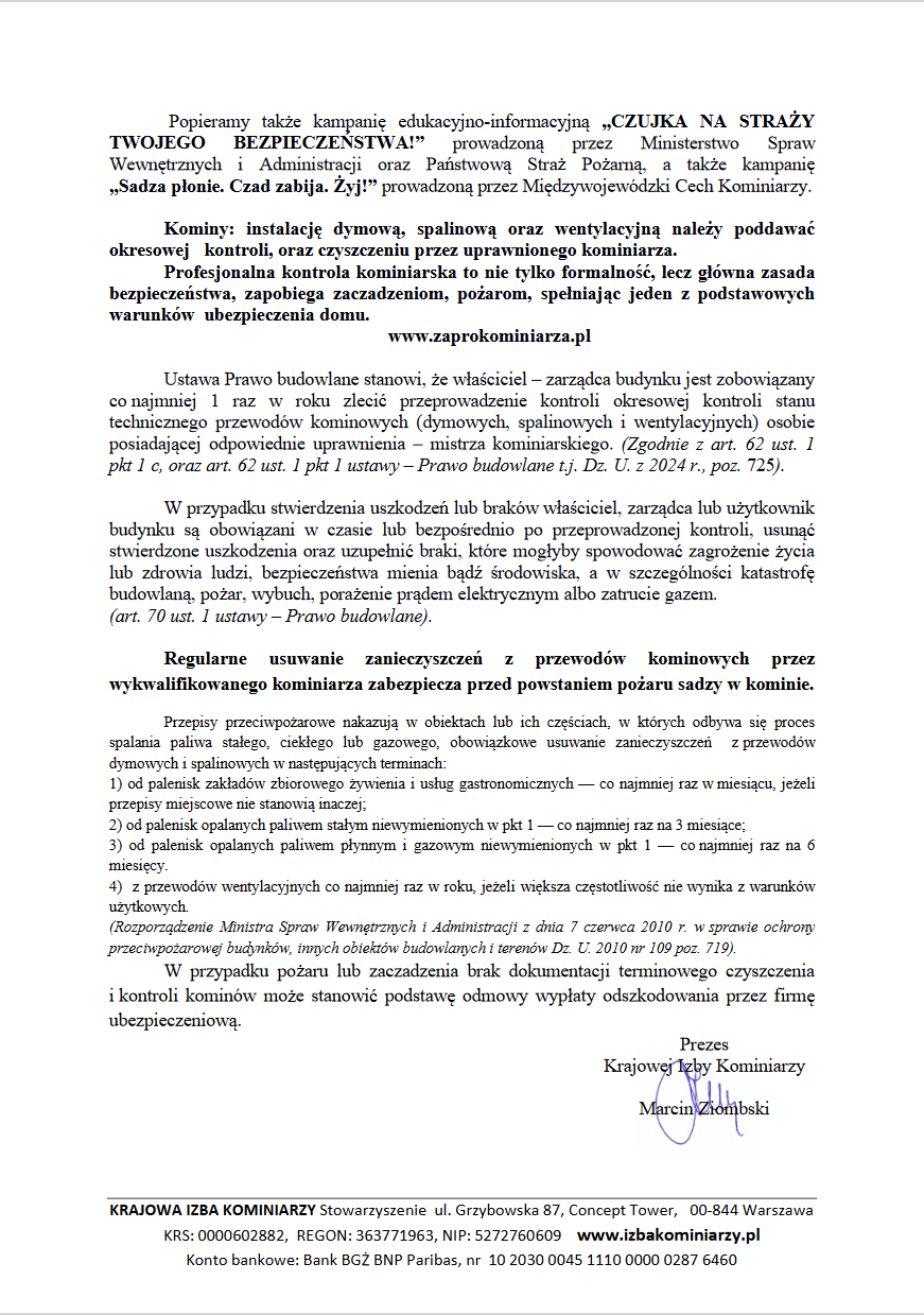 Komunikat Prezesa Krajowej Izby Kominiarzy