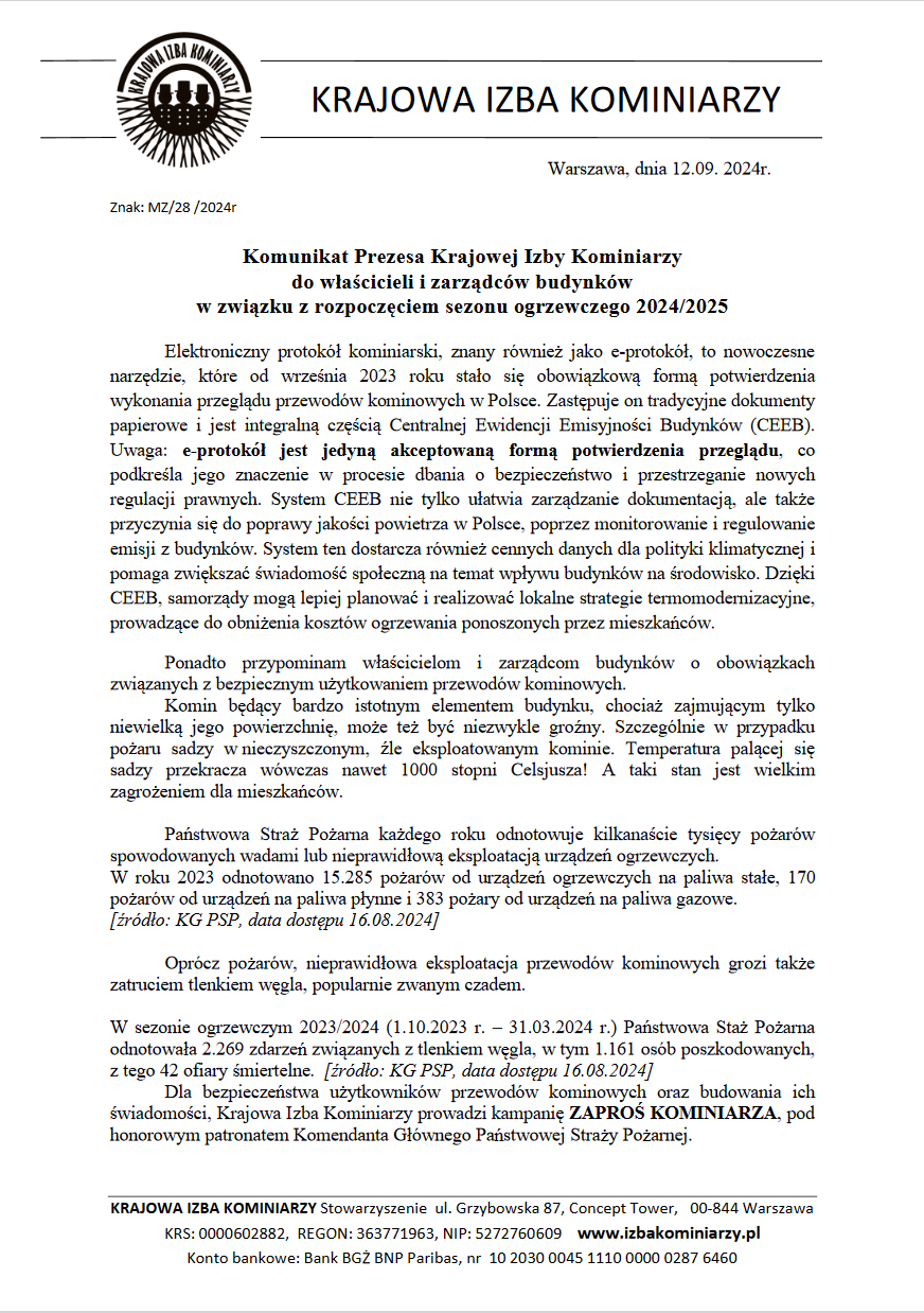 Poniżej publikujemy Komunikat Prezesa Krajowej Izby Kominiarzy do właścicieli i zarządców budynków w związku z rozpoczęciem sezonu ogrzewczego 2024/2025.