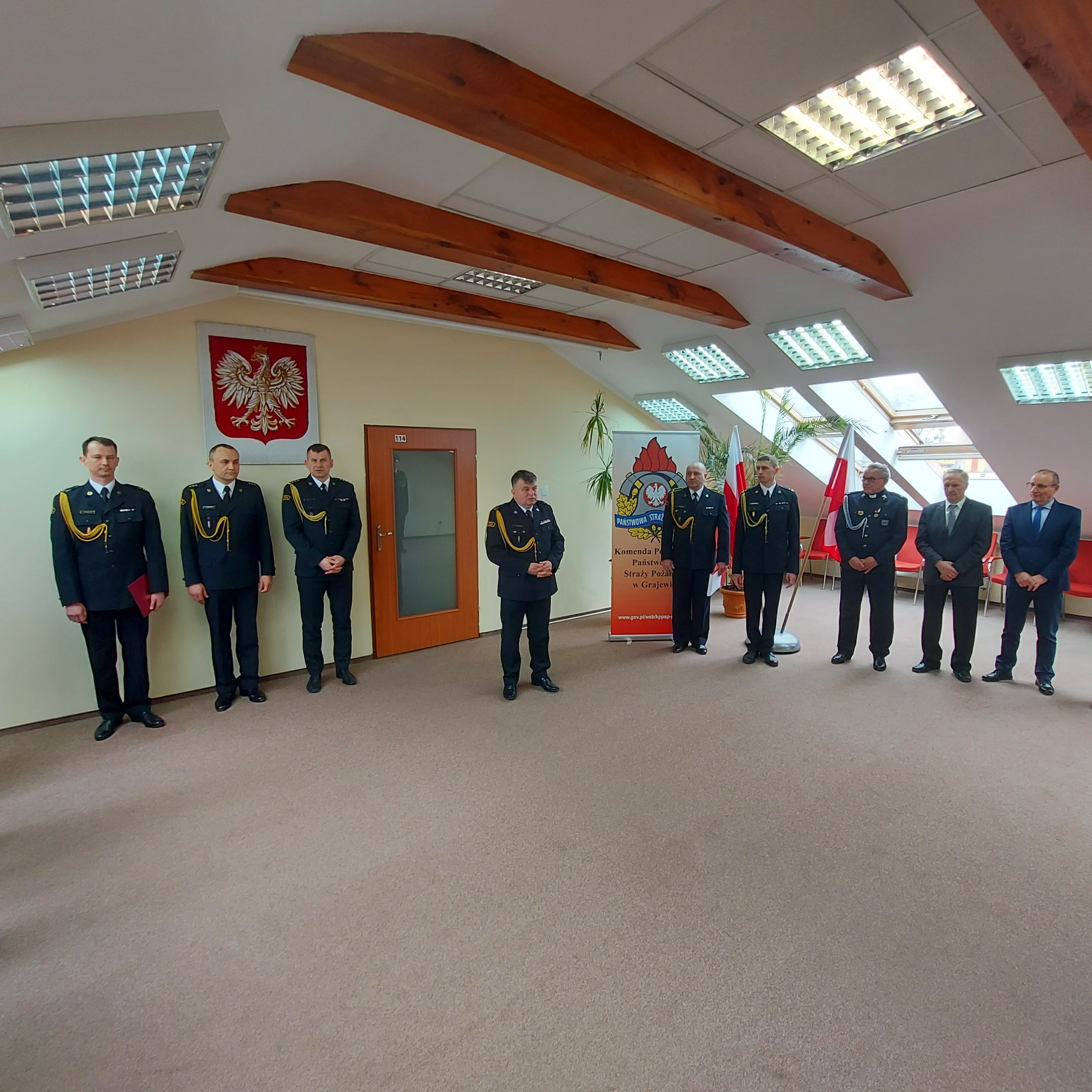 W poniedziałek 04.04.2022 r. o godz. 11 w siedzibie Komendy Powiatowej PSP w Grajewie odbyła się uroczysta zbiórka z okazja objęcia stanowiska Zastępcy Komendanta Powiatowego PSP w Grajewie przez kpt. Jarosława Szeszko. W uroczystości uczestniczyli Komendant Wojewódzki PSP w Białymstoku, st. bryg. Sebastian Zdanowicz, Naczelnik Wydziału Kadr KW PSP mł. bryg. Tomasz Kirejczyk, Wicestarosta Powiatu Grajewskiego Tomasz Cebeliński oraz inni goście.