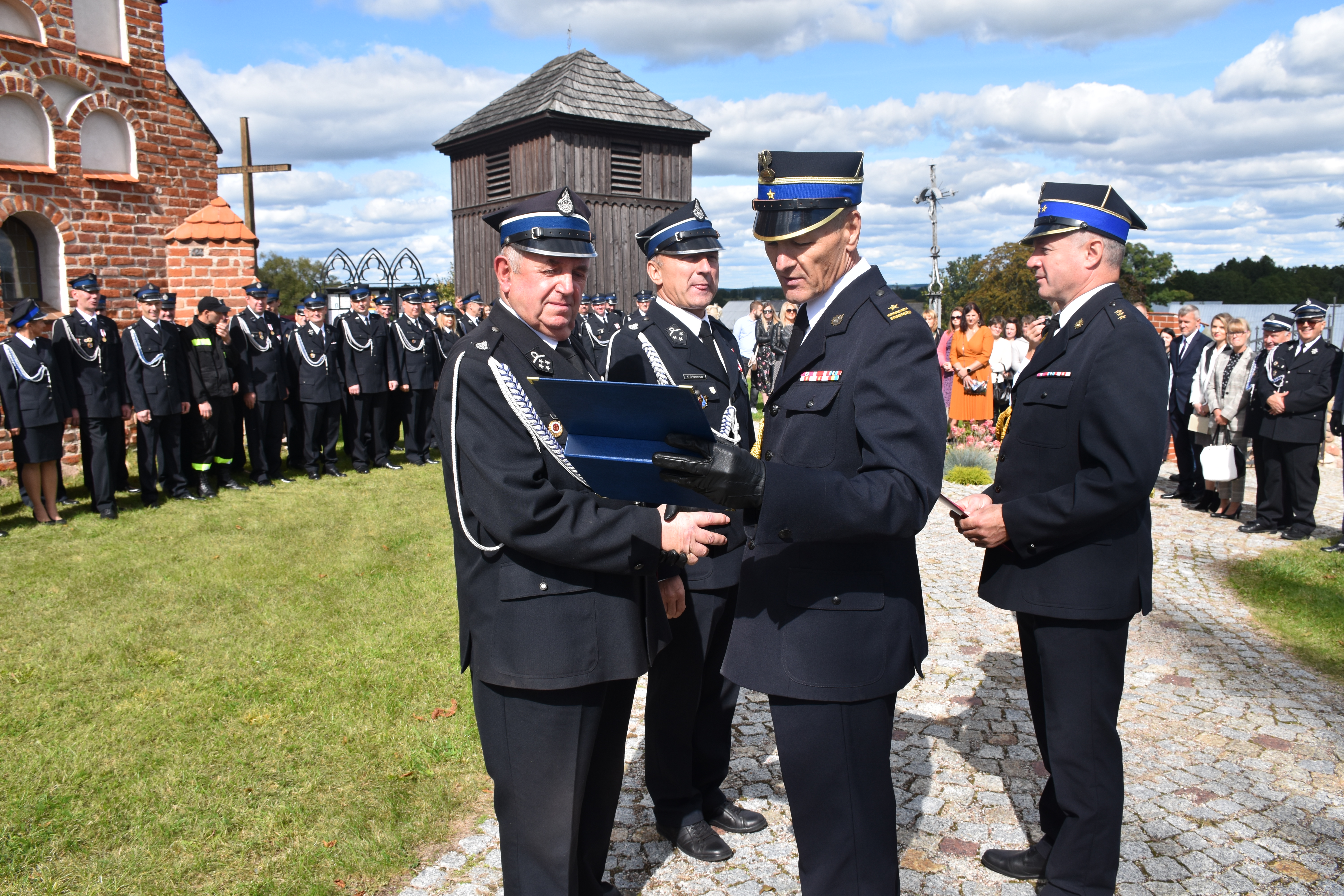 Oficjalna część uroczystości z podniesieniem flagi państwowej i odśpiewaniem hymnu narodowego odbyła się na placu przy kościele. Na wstępie naczelnik Ochotniczej Straży Pożarnej w Niedźwiadnej druh Krzysztof Grunwald powitał zaproszonych gości i przedstawił krótki rys historyczny jednostki. Następnie wyróżniającym się druhnom i druhom wręczono odznaczenia i medale. Złotym Medalem „Za Zasługi dla Pożarnictwa” wyróżniono 3 druhów, Srebrnym Medalem „Za Zasługi dla Pożarnictwa” wyróżniono 6 druhów, natomiast Brązowym Medalem „Za Zasługi dla Pożarnictwa” wyróżniono 4 druhów. Odznakę Honorową „Podlaski Krzyż Floriański” otrzymało 8 druhów, w tym 1 złotą, a odznakę „Strażak Wzorowy” wręczono 5 druhom.