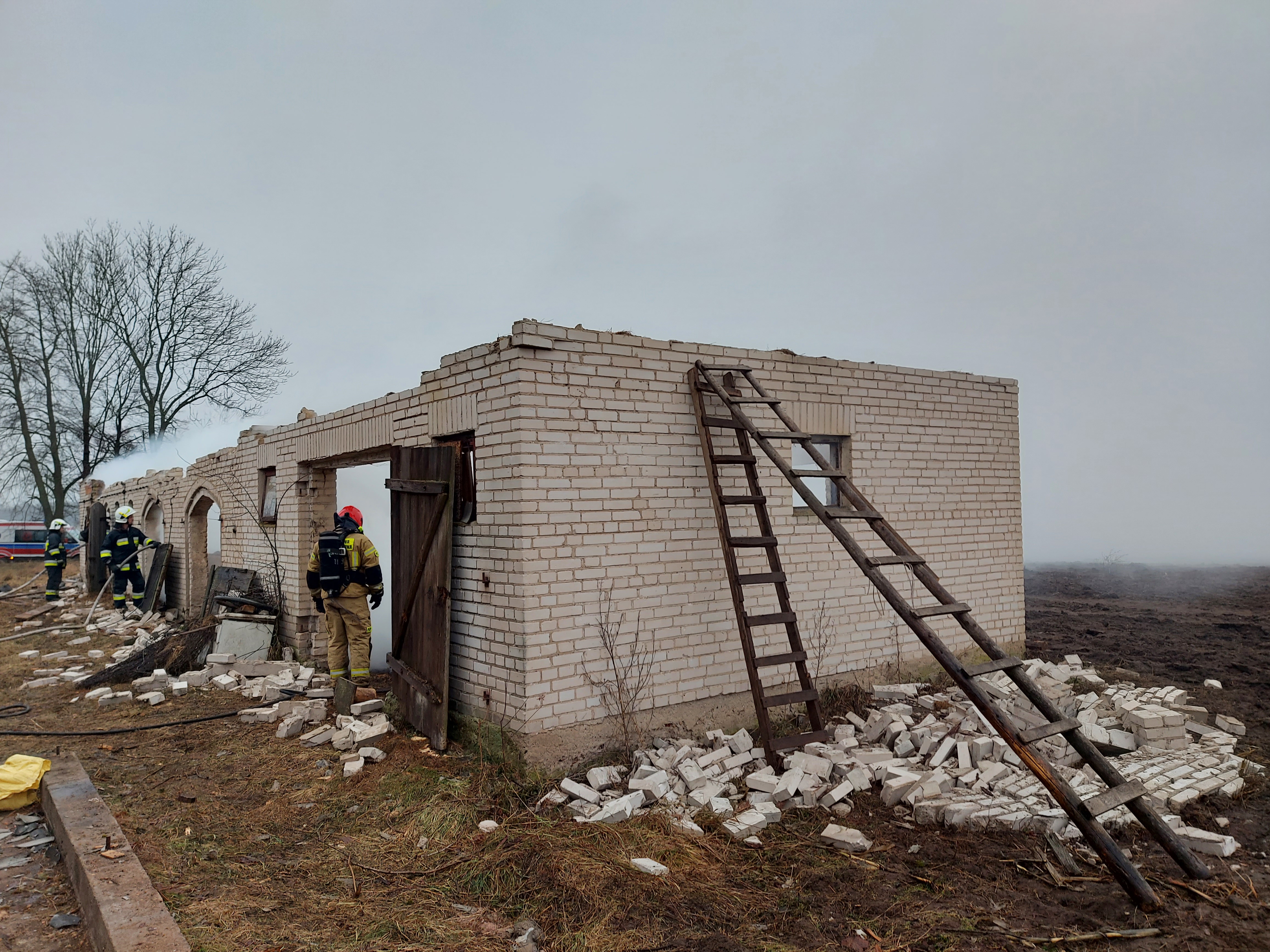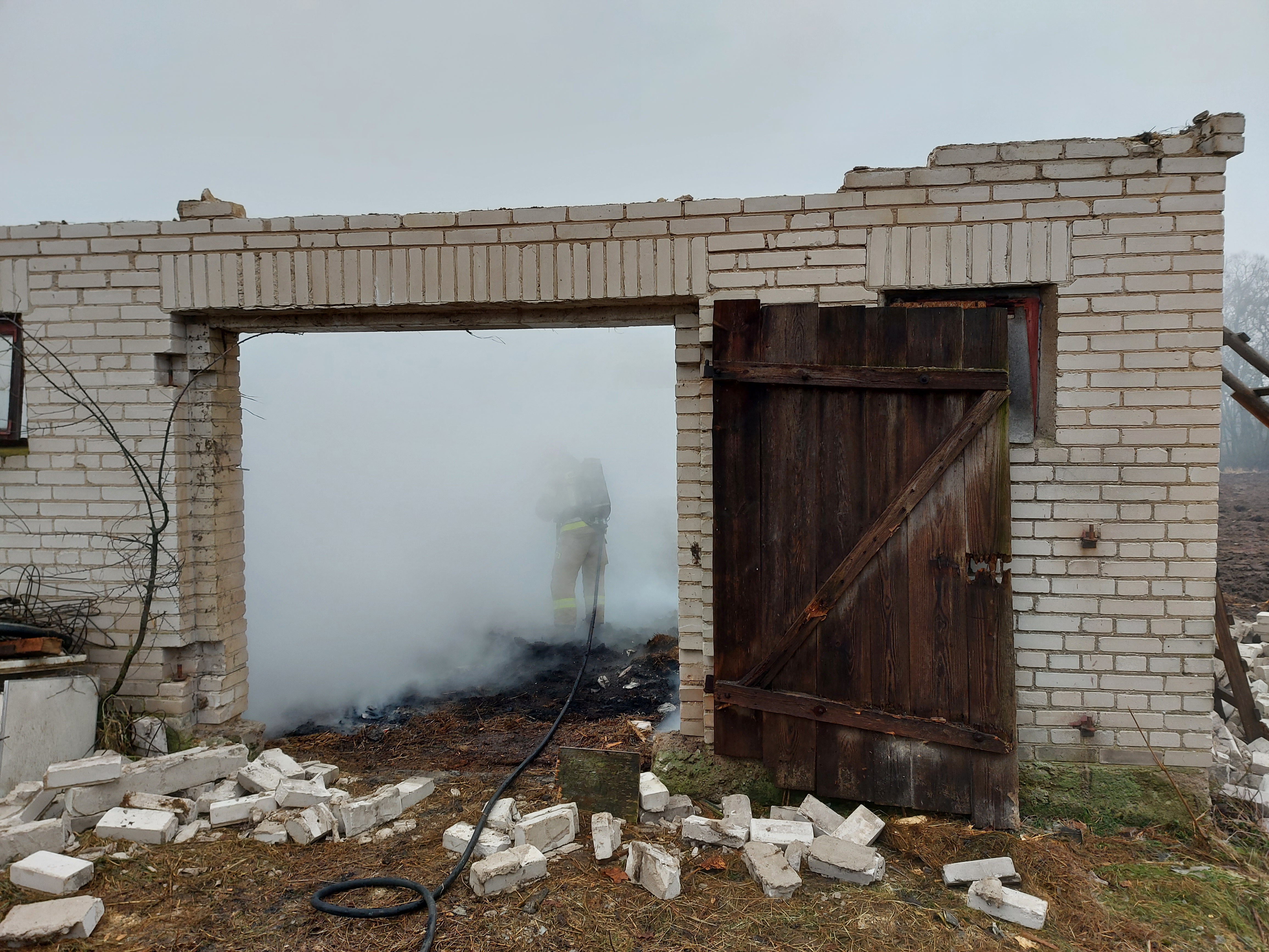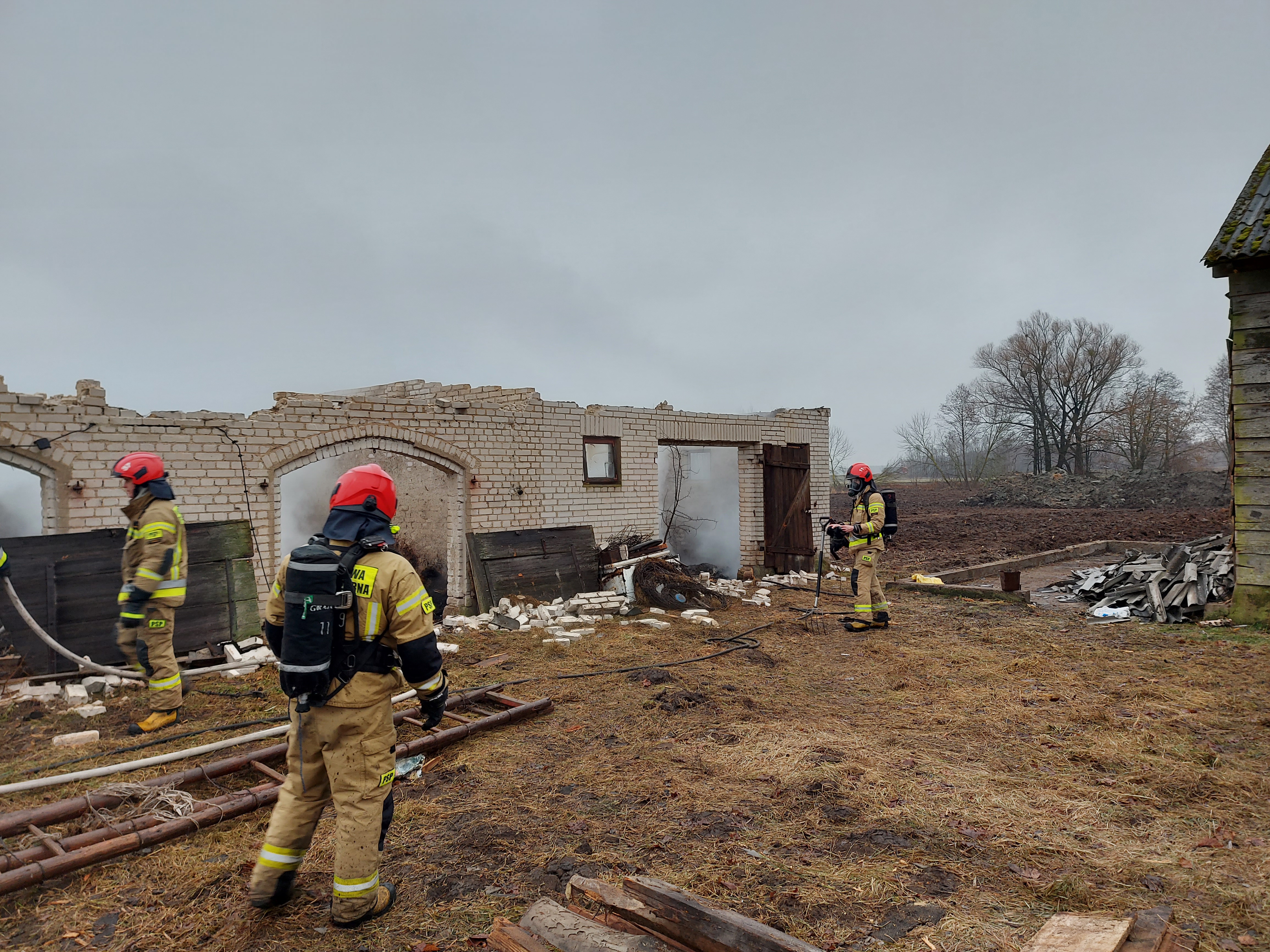 Po przybyciu jednostek ochrony przeciwpożarowej pod wskazany adres okazało się, że w murowanym budynku gospodarczym przeznaczonym do rozbiórki palą się składowane płody rolne i deski. Do działań wewnątrz obiektu wprowadzono w pełni zabezpieczone 2 roty gaśnicze, które równolegle z podawaniem prądów wody prowadziły działania poszukiwawcze osób zagrożonych, a kolejna rota gasiła pożar z zewnątrz. W pełnej gotowości pozostawały też roty medyczne z odpowiednim sprzętem do udzielenia kwalifikowanej pierwszej pomocy.