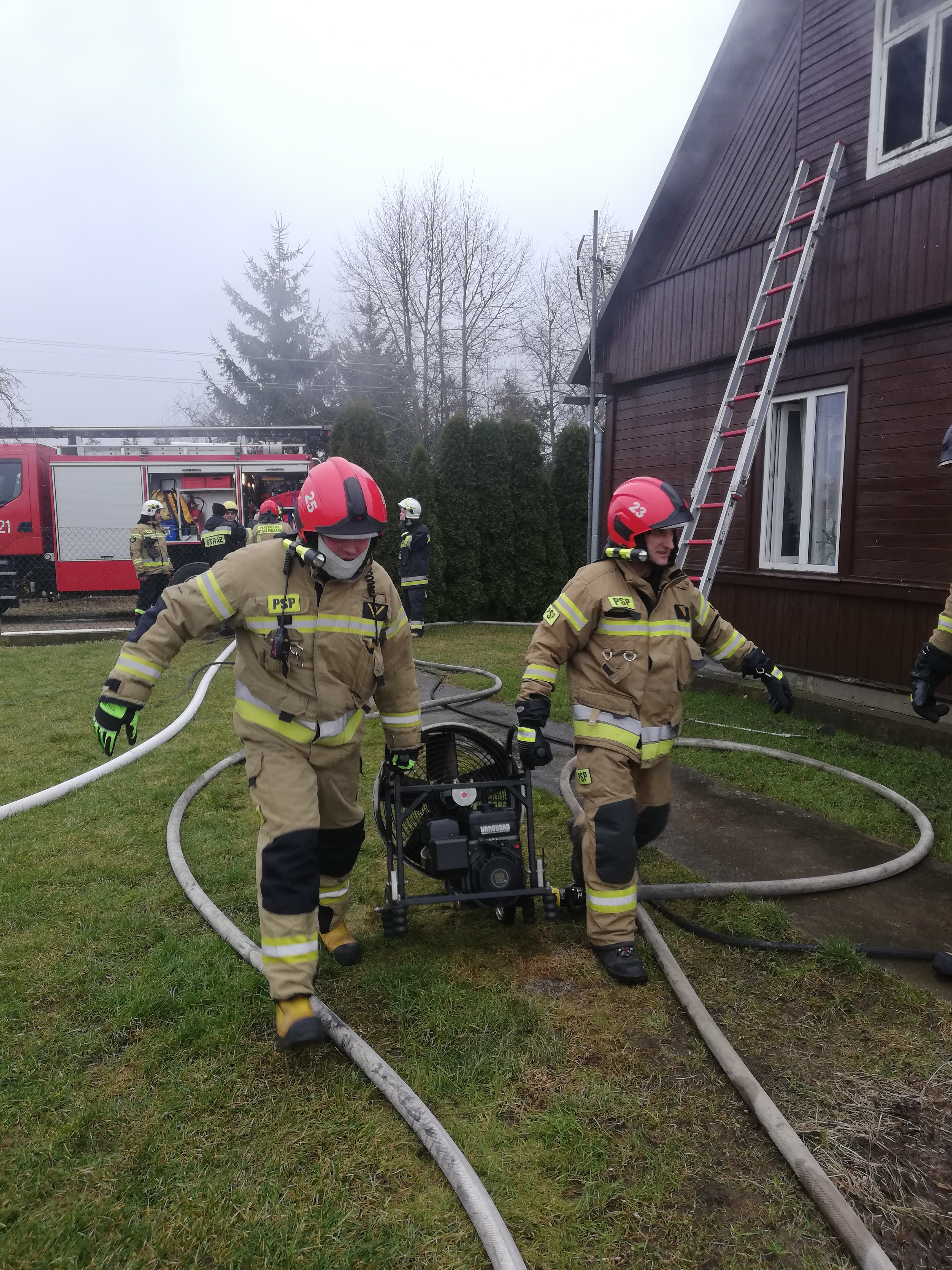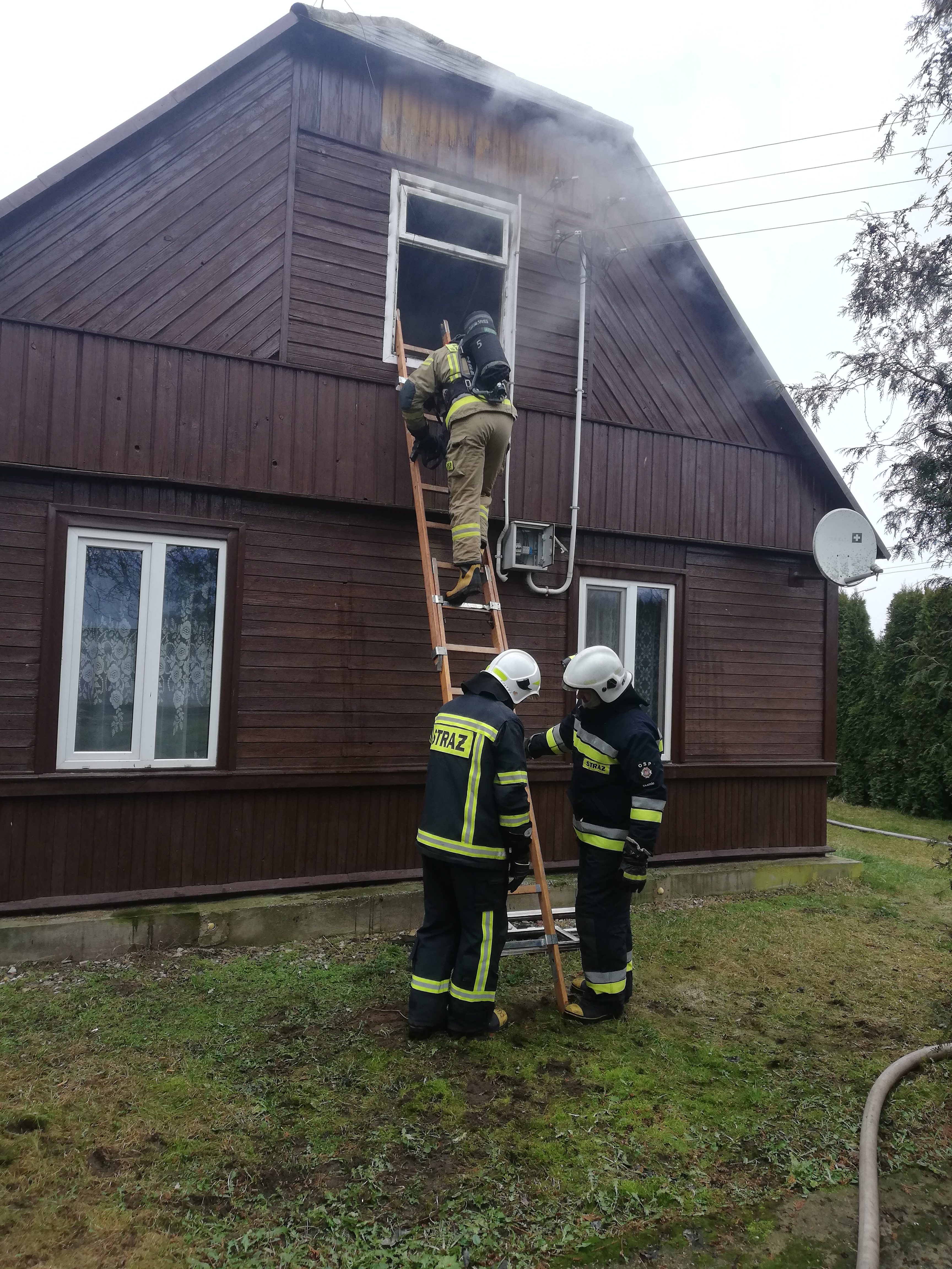 Po dojeździe na miejsce zdarzenia i przeprowadzeniu rozpoznania ustalono, że pali się poddasze budynku, a mieszkańcy zdołali go opuścić przed przybyciem służb. Przybyły na miejsce zdarzenia Zespół Ratownictwa Medycznego po przebadaniu mieszkańców stwierdził, iż nie wymagają oni hospitalizacji. Do płonącego budynku wprowadzono rotę w aparatach ochrony dróg oddechowych celem przeszukania oraz zlokalizowania miejsca pożaru. Dwie roty od zewnątrz prowadziły działania gaśniczy przy użyciu drabin nasadkowych. Po ugaszeniu ognia przystąpiono do wynoszenia spalonych elementów wyposażenia oraz oddymienia domu. Przy użyciu kamery termowizyjnej wykluczono ukryte zarzewia ognia.