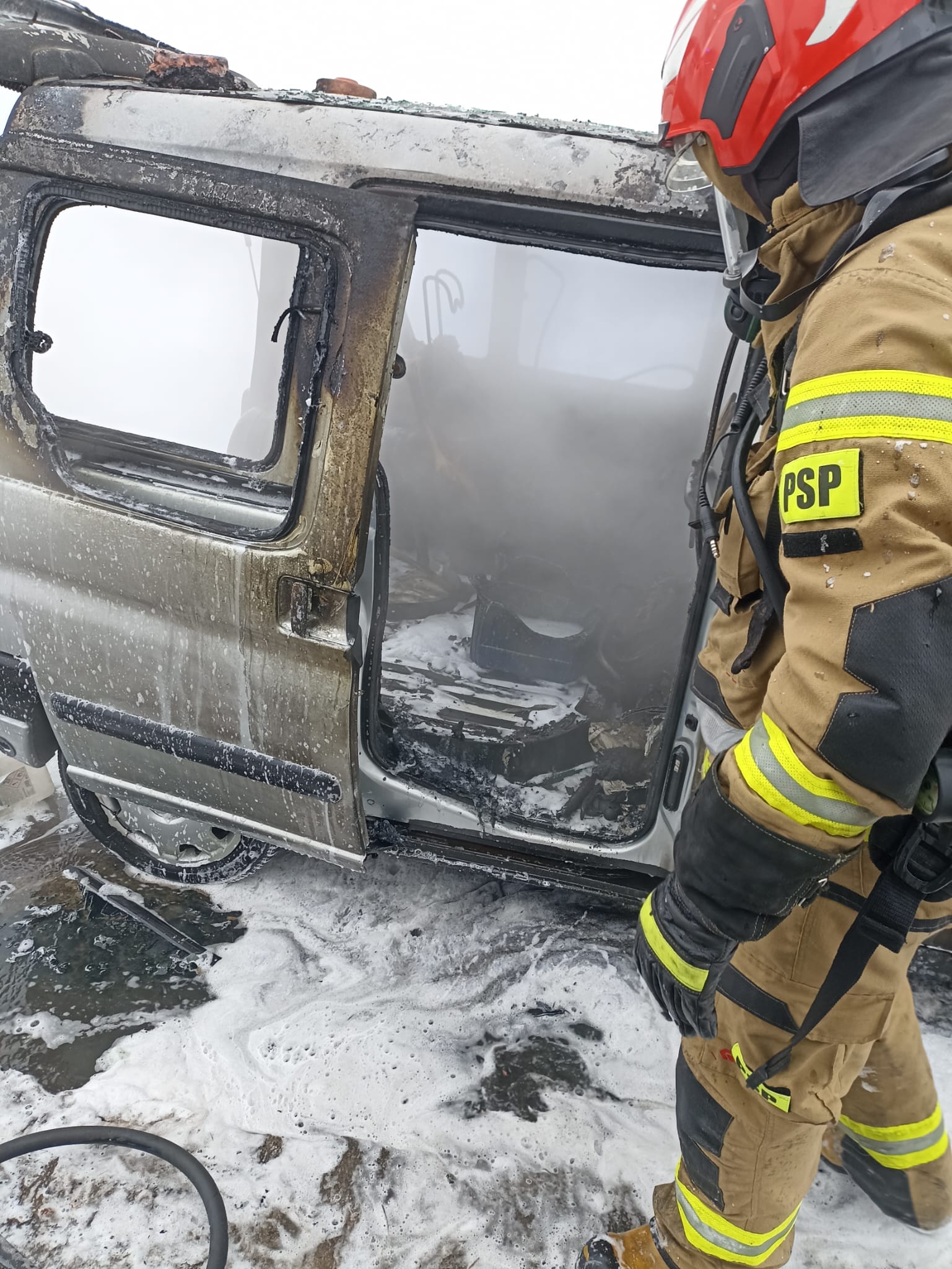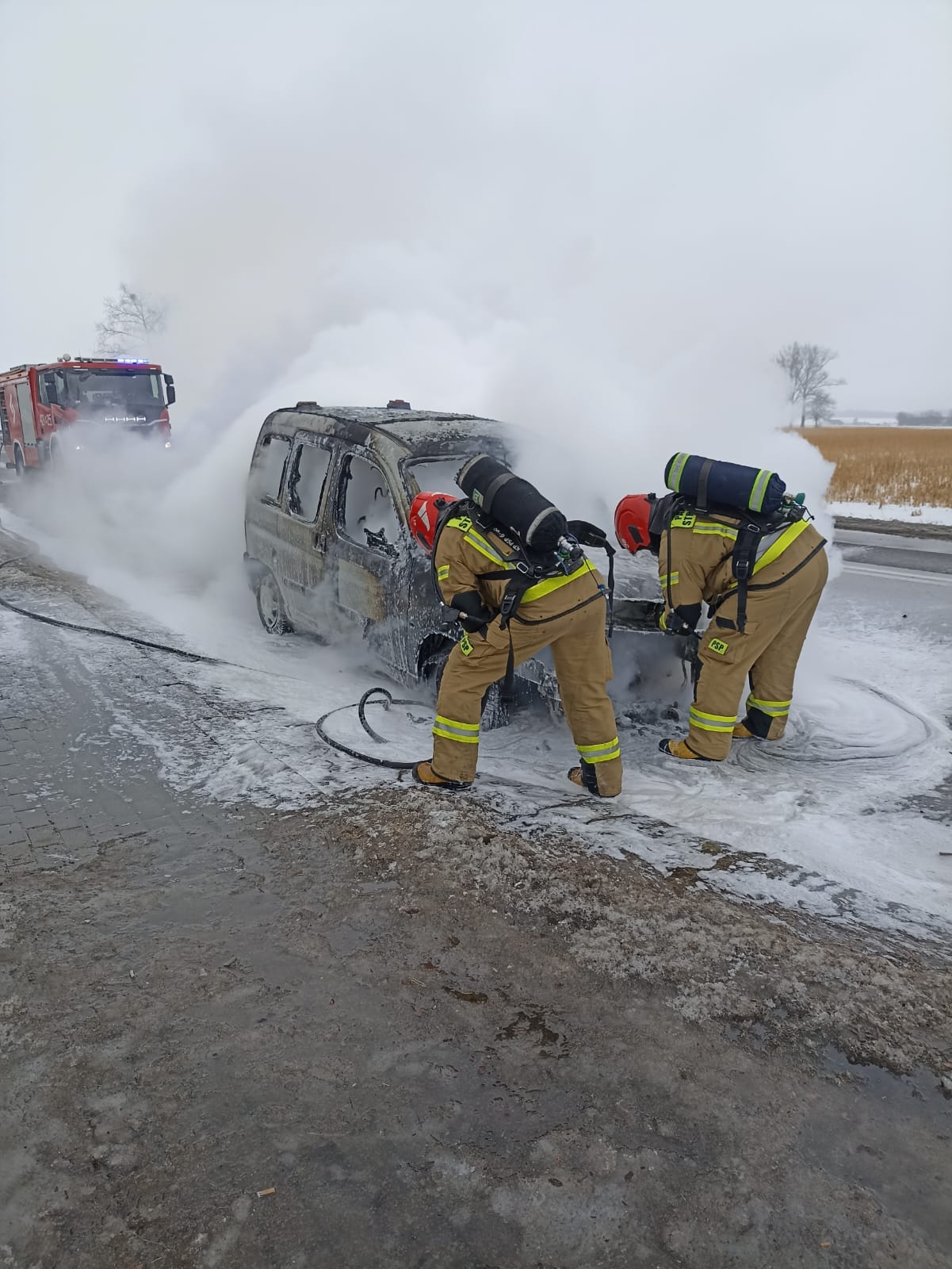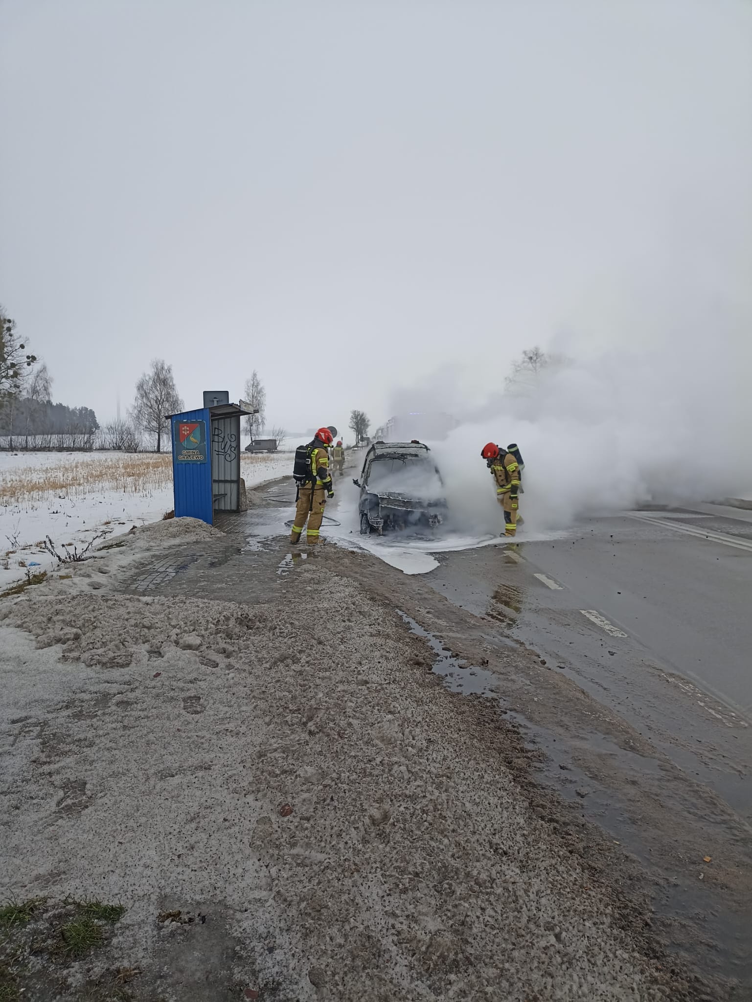 W chwili przybycia straży pożarnej samochód całkowicie był objęty pożarem. Ruch na drodze był całkowicie zablokowany. Strażacy z Jednostki Ratowniczo-Gaśniczej w Grajewie zabezpieczeni w sprzęt ochrony dróg oddechowych podali jeden prąd piany ciężkiej w natarciu na palący się pojazd. Niestety uległ on całkowitemu spaleniu.
