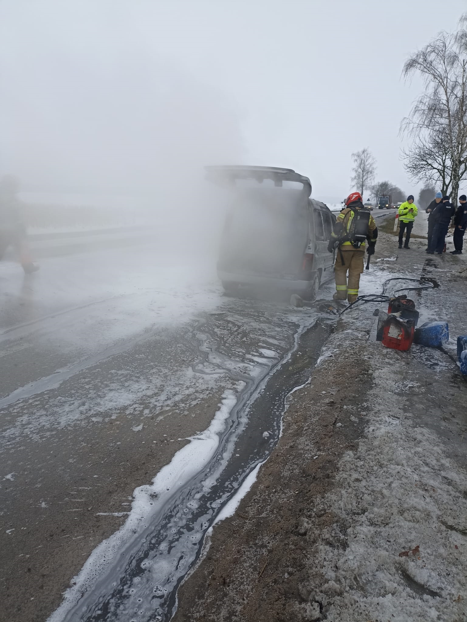 Samochód wyposażony był w instalację gazową, która została zakręcona. Droga do czasu prowadzenia działań gaśniczych była częściowo zablokowana, a ruch odbywał się wahadłowo kierowany przez strażaków. Około godziny 11:40, po zabraniu samochodu przez właściciela ruch na drodze przywrócono całkowicie.