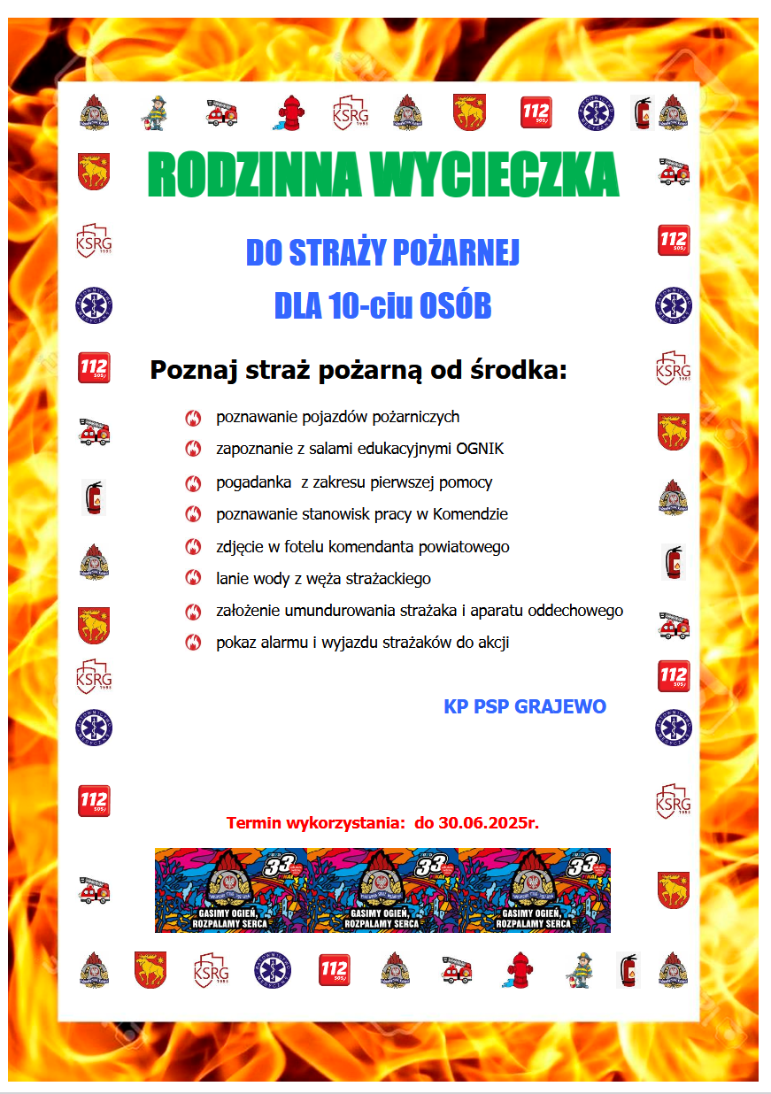 - możliwości wylicytowania 3 bonów na bardzo atrakcyjne wizyty w straży pożarnej. Jeden to „8 godzin w jednostce ratowniczo-gaśniczej”, czyli poznanie pracy strażaka od środka. Drugi to atrakcyjna „Rodzinna wycieczka do straży pożarnej dla max. 10 osób”. Trzeci to wirtualne szkolenie w goglach VR z możliwością wyboru 10 interesujących scenariuszy.
