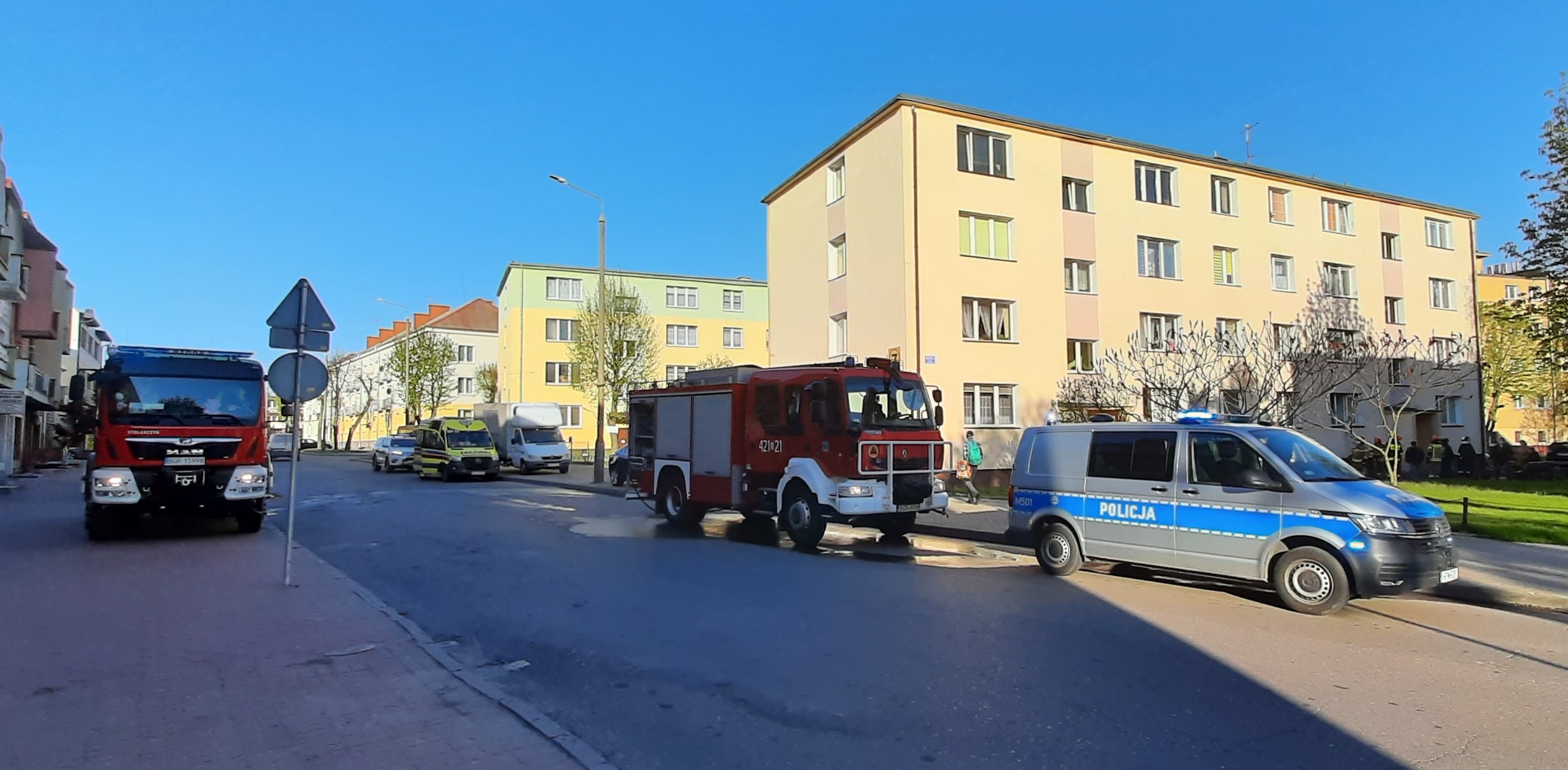 W chwili przyjazdu na miejsce jednostek ochrony przeciwpożarowej przy otwartymokniemieszkania znajdującego się na parterze budynku, z którego wydobywał się gęsty dym stał mężczyzna wołający o pomoc. Ten sam mężczyzna poinformował strażaków, że w pokoju, w którym wybuchł pożar przebywa druga osoba, ale ze względu na gęsty dym utrudniający oddychanie i widoczność nie jest w stanie do niej dotrzeć.