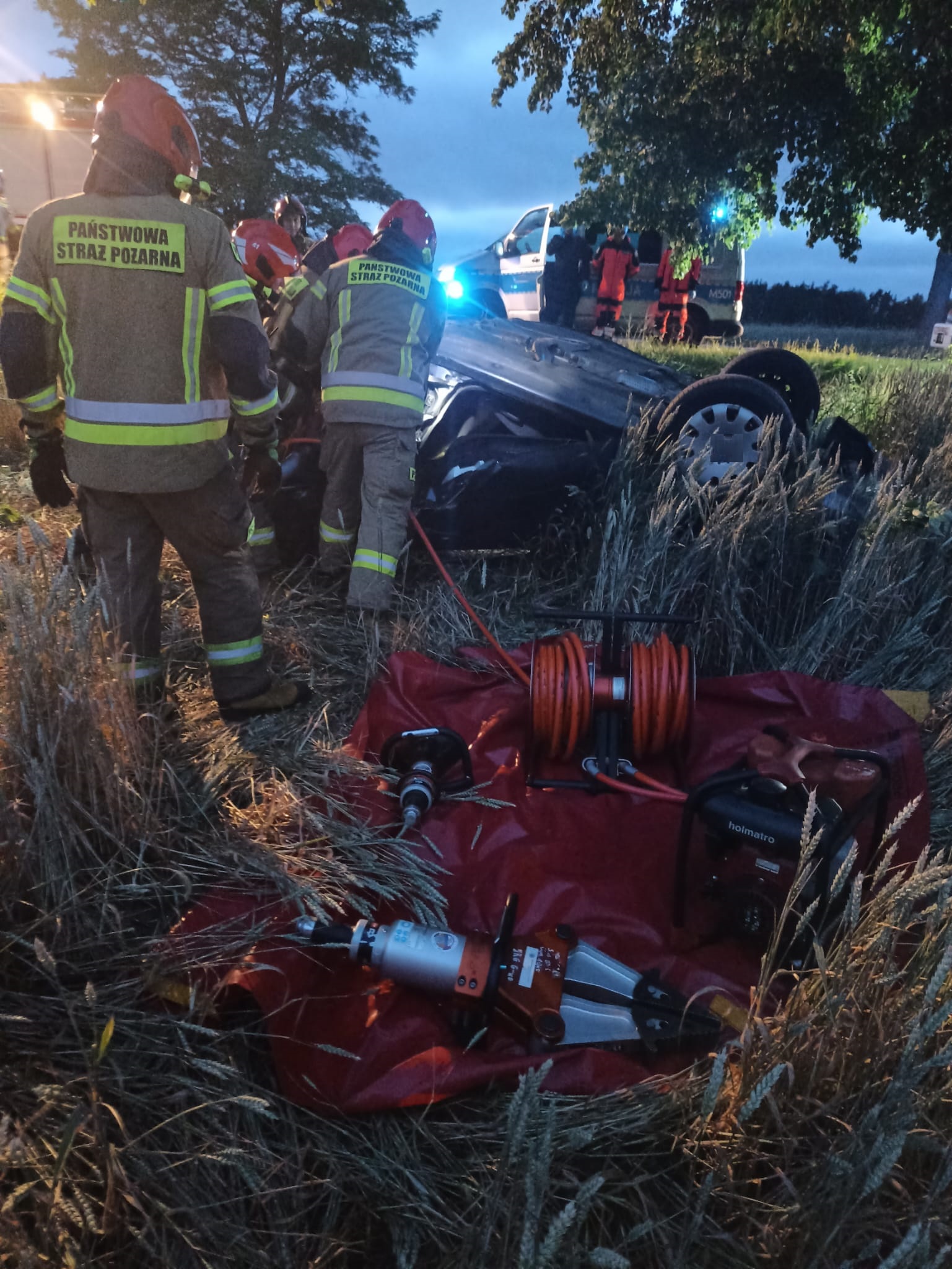 Ze zgłoszenia wynikało, że auto dachowało i znajduje się w polu. Wewnątrz był 1 nieprzytomny poszkodowany, który nie wydostał się z pojazdu.
