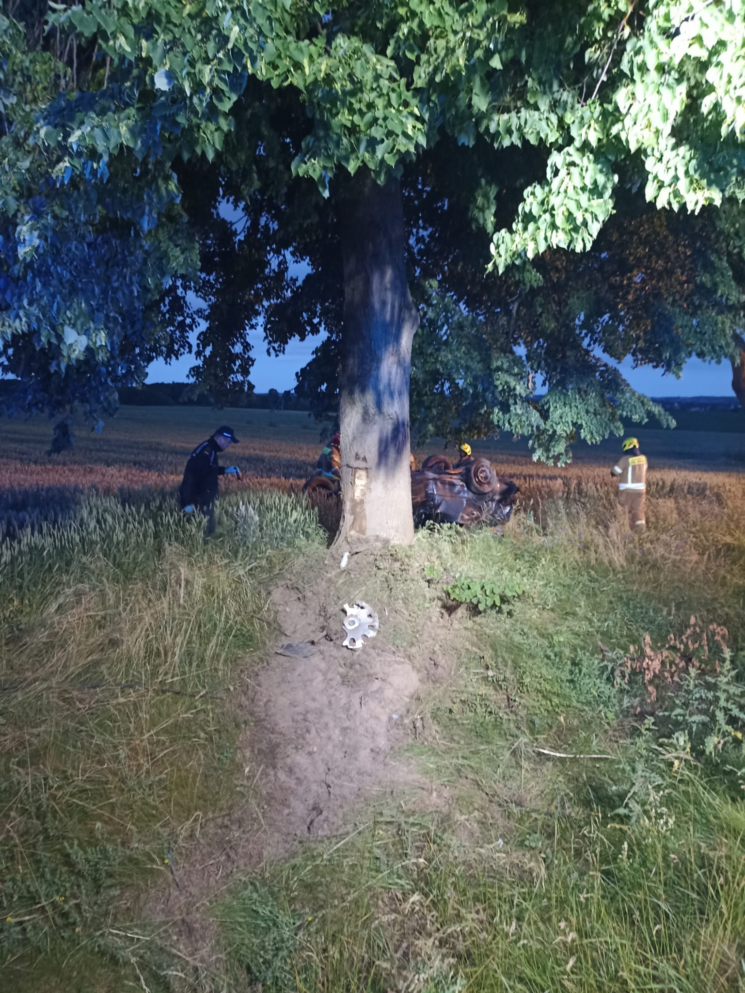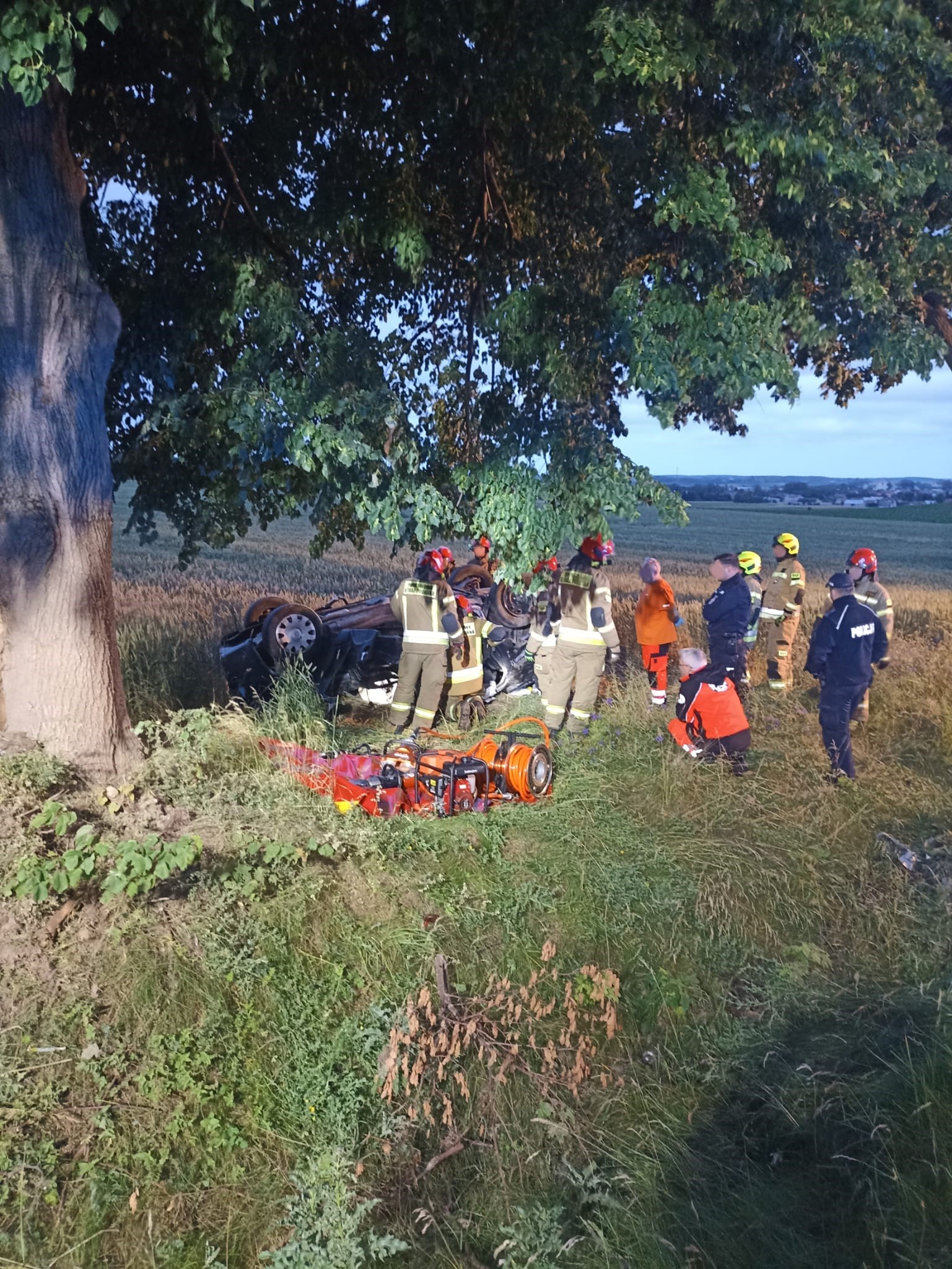 Przybyłe jednostki ustaliły, że kierujący samochodem osobowym młody mężczyzna na łuku drogi uderzył pojazdem w przydrożne drzewo przewracając się na dach. Kierujący, który podróżował samodzielnie znajdował się w pojeździe. Obecny na miejscu zespół ratownictwa medycznego stwierdził zgon poszkodowanego.