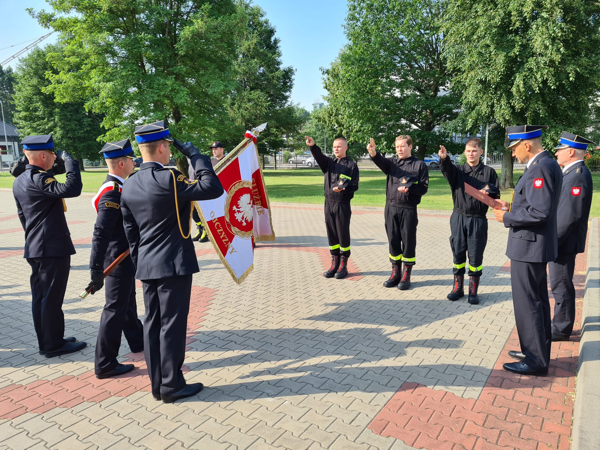 "Ja, obywatel Rzeczypospolitej Polskiej, świadom podejmowanych obowiązków strażaka, uroczyście ślubuję być ofiarnym i mężnym w ratowaniu zagrożonego życia ludzkiego i wszelkiego mienia - nawet z narażeniem życia.”