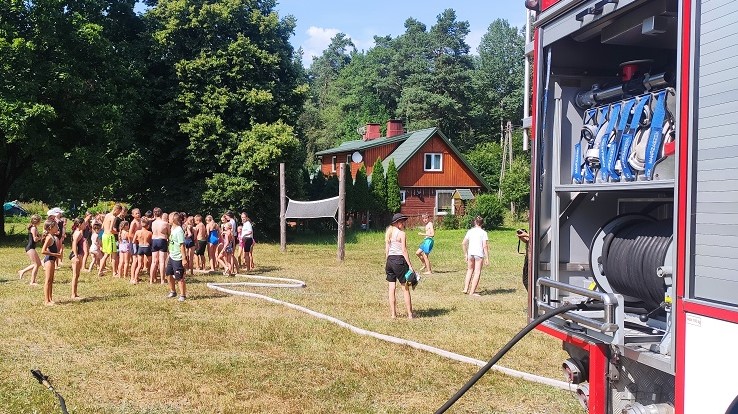 Realizując działania edukacyjne w ramach prewencji społecznej, funkcjonariusze Komendy Powiatowej Państwowej Straży Pożarnej w Grajewie omówili zasady postepowania na wypadek powstania pożaru lub innego miejscowego zagrożenia na terenie obozu ze szczególnym uwzględnieniem niebezpiecznych zjawisk atmosferycznych, praktycznego użycia podręcznego sprzętu gaśniczego i alarmowania służb przy wykorzystaniu numeru alarmowego 112. W celu wzmożenia bezpieczeństwa obozowiczów przeprowadzono praktyczną próbę ewakuacji i dokonano podsumowania jej przebiegu.