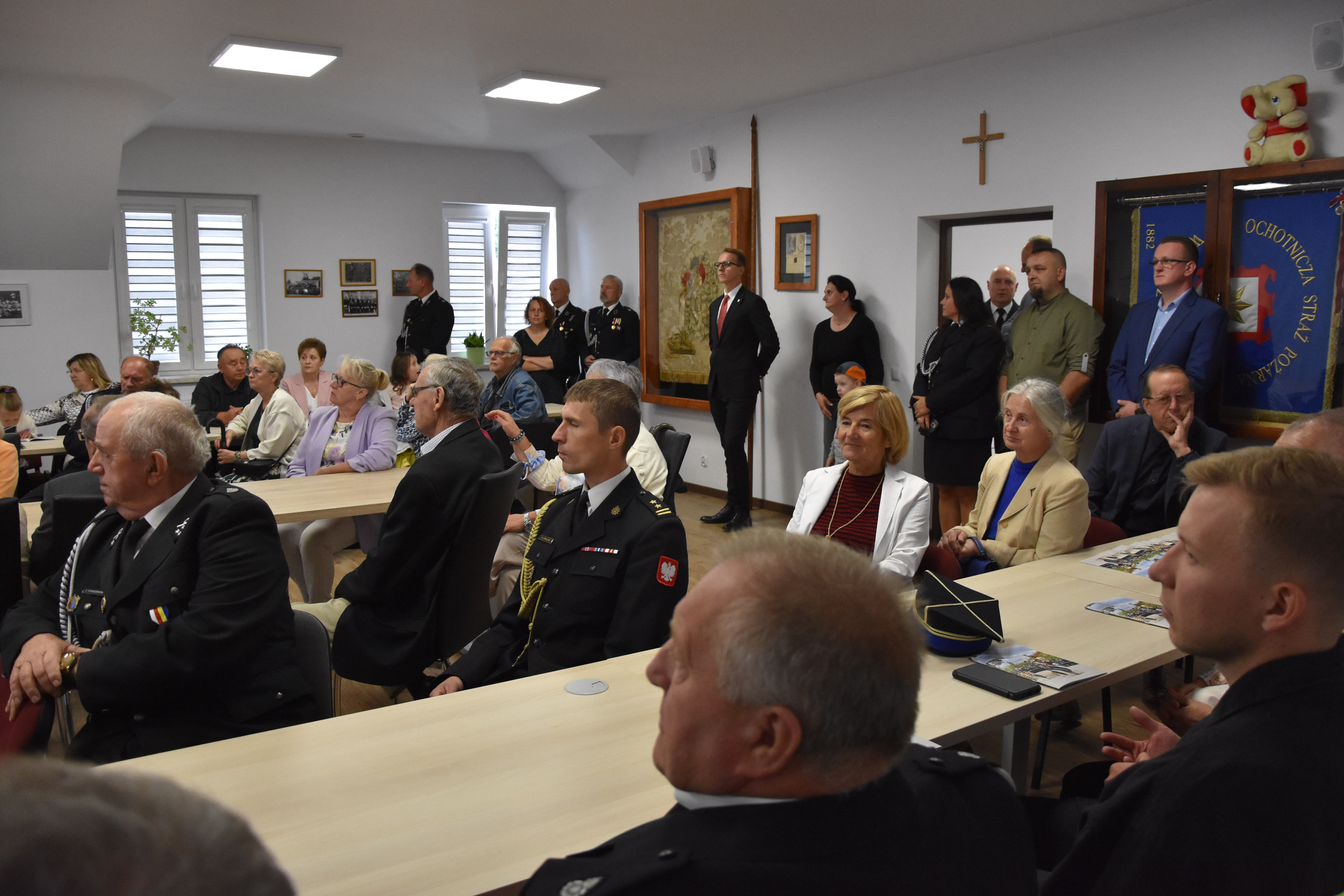 Następnie w świetlicy jednostki przedstawiono historię nadania sztandaru i jego dzieje. Sztandar nadano na 25-cio lecie jednostki powstałej w 1882r. W dalszej kolejności omówiono historię przebiegu prac restauracyjnych oraz wymieniono osoby i instytucje, które dołożyły swoją cegiełkę do tego dzieła. Wśród nich byli również strażacy i pracownicy KP PSP w Grajewie.