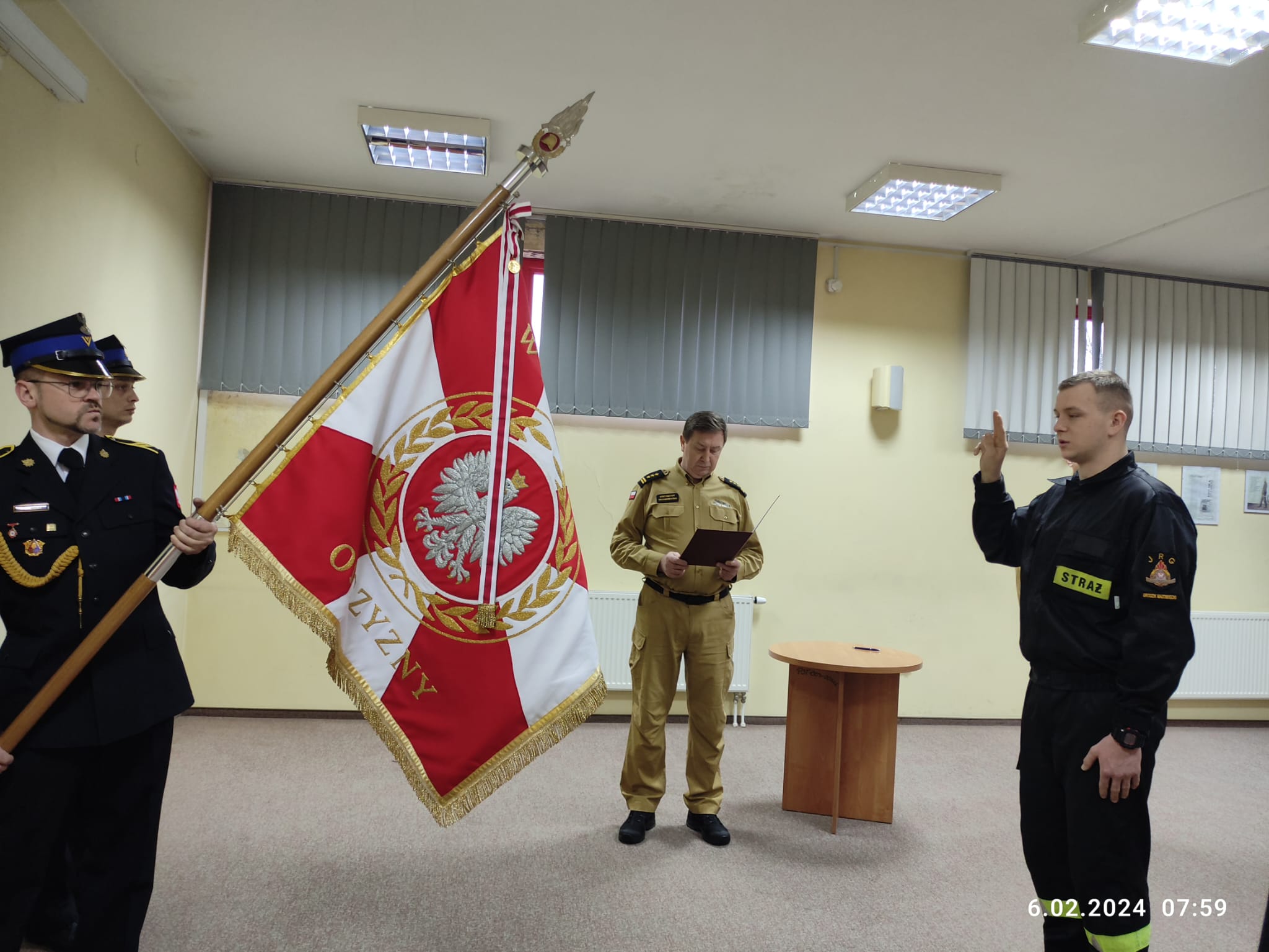 „Ja, obywatel Rzeczypospolitej Polskiej, świadom podejmowanych obowiązków strażaka, uroczyście ślubuję być ofiarnym i mężnym w ratowaniu zagrożonego życia ludzkiego i wszelkiego mienia – nawet z narażeniem życia. Wykonując powierzone mi zadania, ślubuję przestrzegać prawa, dyscypliny służbowej oraz wykonywać polecenia przełożonych. Ślubuję strzec tajemnic związanych ze służbą, a także honoru, godności i dobrego imienia służby oraz przestrzegać zasad etyki zawodowej.”