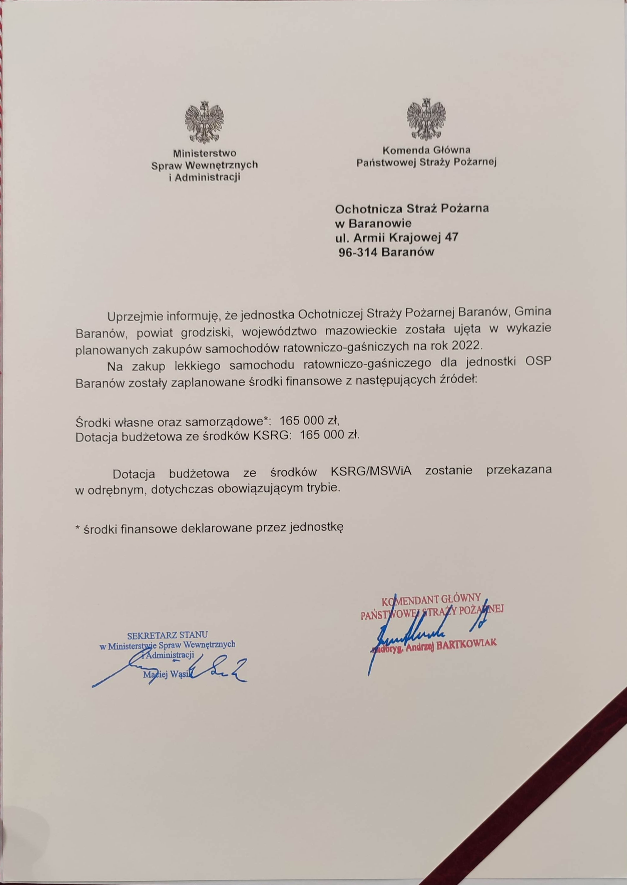 Wśród dziewięciu OSP, które odbierały powyższe promesy znalazła się również jednostka z powiatu Grodziskiego OSP Baranów. Mazowiecki komendant wojewódzki PSP nadbryg. Jarosław Nowosielski wraz z szefem Gabinetu Politycznego Ministra Spraw Wewnętrznych i Administracji Panem Michałem Prószyńskim, Posłem na Sejm RP Panią Anitą Czerwińską oraz Posłem na Sejm RP Panem Dariuszem Olszewskim wręczyli prezesowi OSP Baranów druhowi Dariuszowi Szymańczakowi oraz wójt gminy Baranów Pani Agacie Trzop-Szczypiorskiej promesę na dofinansowanie kupna pojazdu ze środków krajowego systemu ratowniczo-gaśniczego.