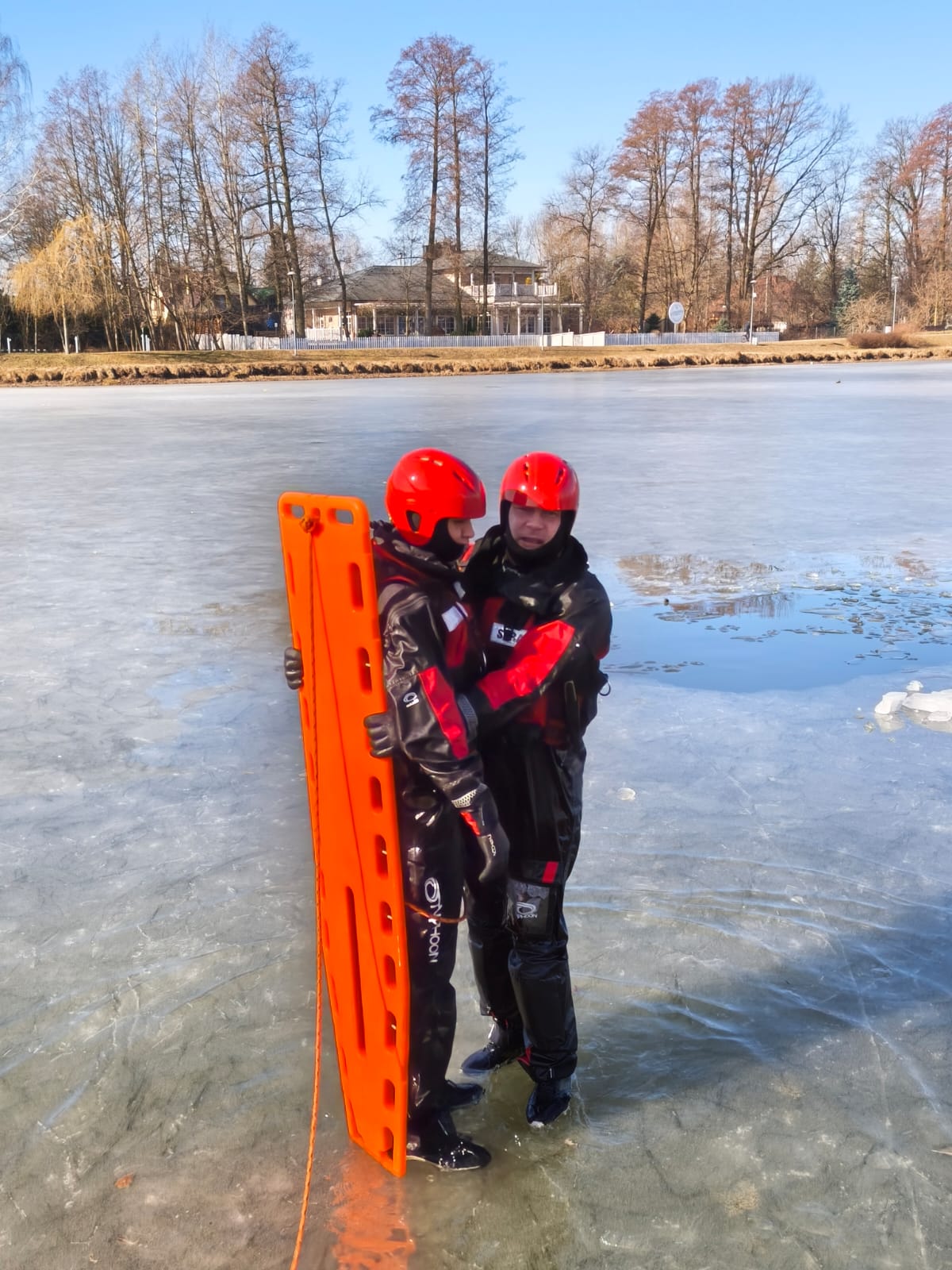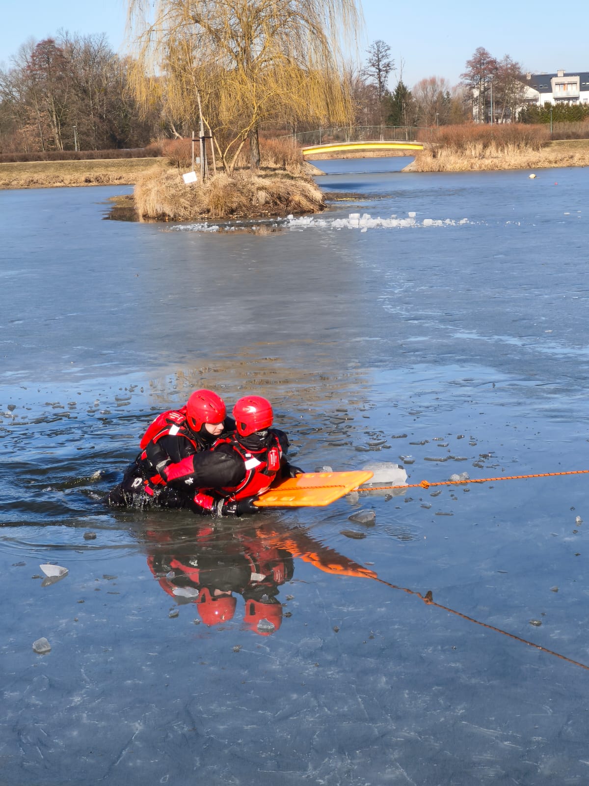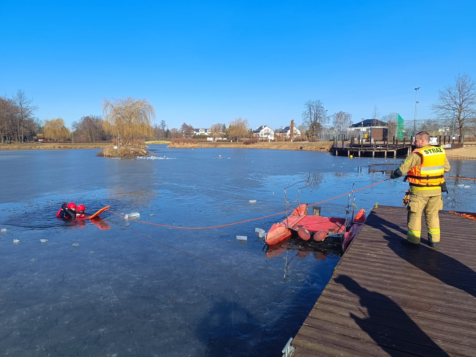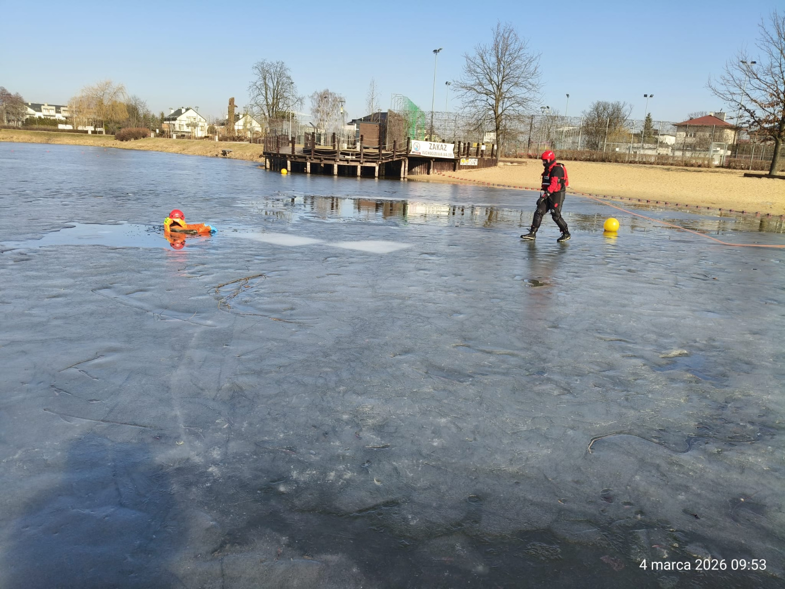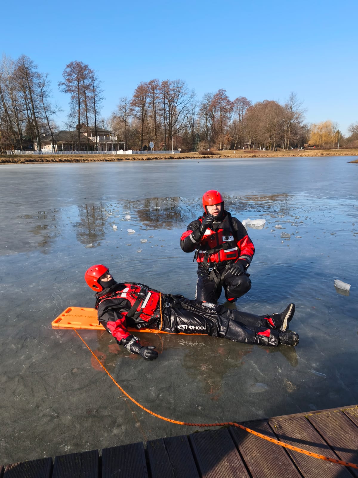 Ćwiczenia praktyczne w zakresie podstawowym z ratownictwa lodowego na terenie zamarzniętego Kąpieliska Miejskiego „Stawy Walczewskiego”