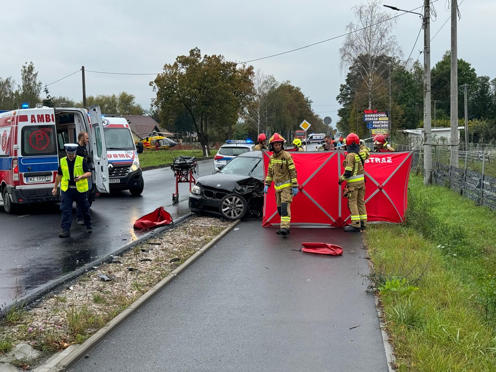 Po dojeździe zadysponowanych zastępów stwierdzono zderzenie czołowe dwóch pojazdów osobowych (Toyota oraz BMW), którymi podróżowali tylko kierowcy. Obie osoby poszkodowane były poza pojazdami pod opieką zespołów Państwowego Ratownictwa Medycznego. Względem jednej z osób prowadzona była resuscytacja krążeniowo-oddechowa. Działania strażaków polegały na zabezpieczeniu miejsca zdarzenia przez zablokowanie ruchu drogowego na drodze wojewódzkiej, wsparciu działań ratowników medycznych, wyznaczeniu miejsca lądowania helikoptera LPR we współpracy z pilotem i jego zabezpieczeniu.