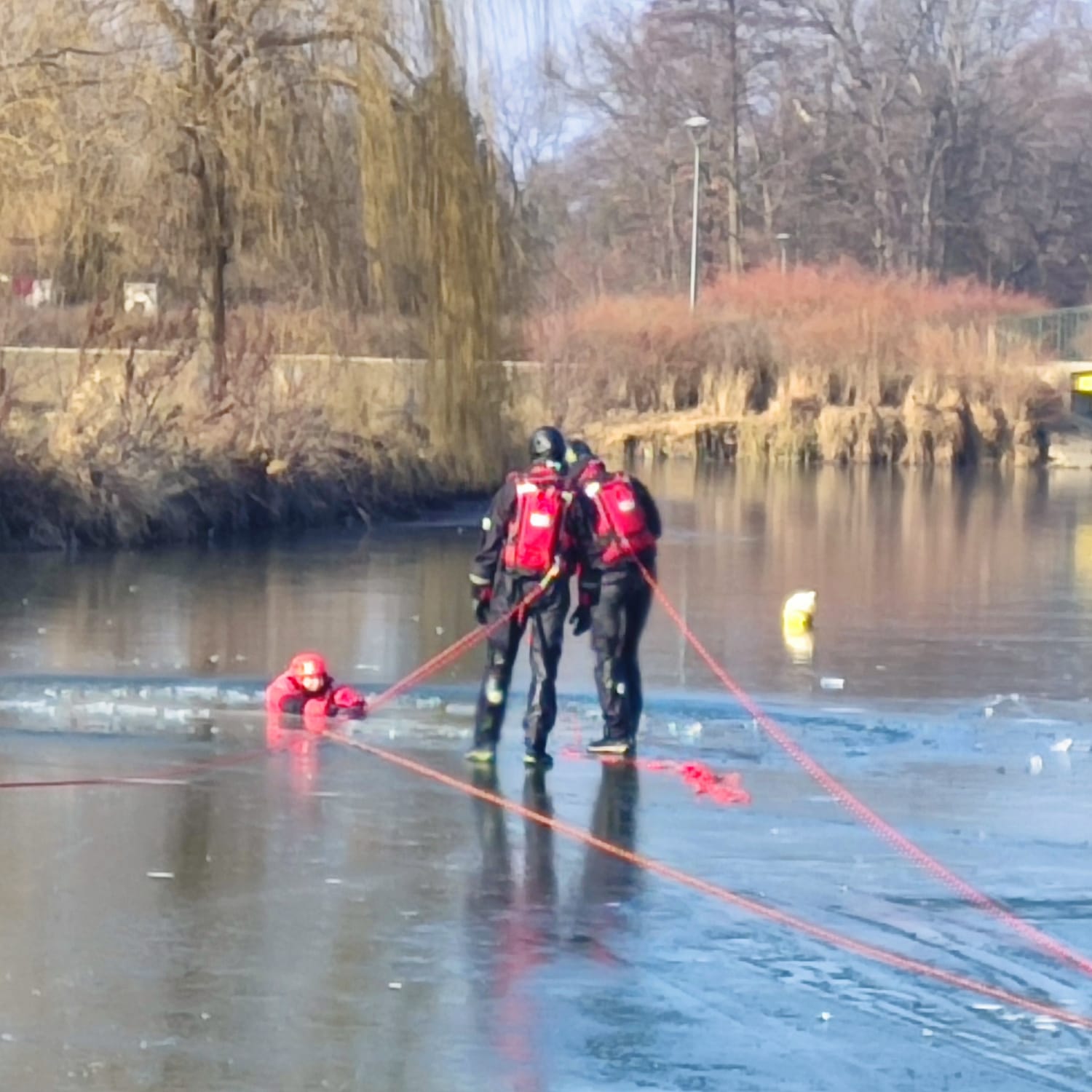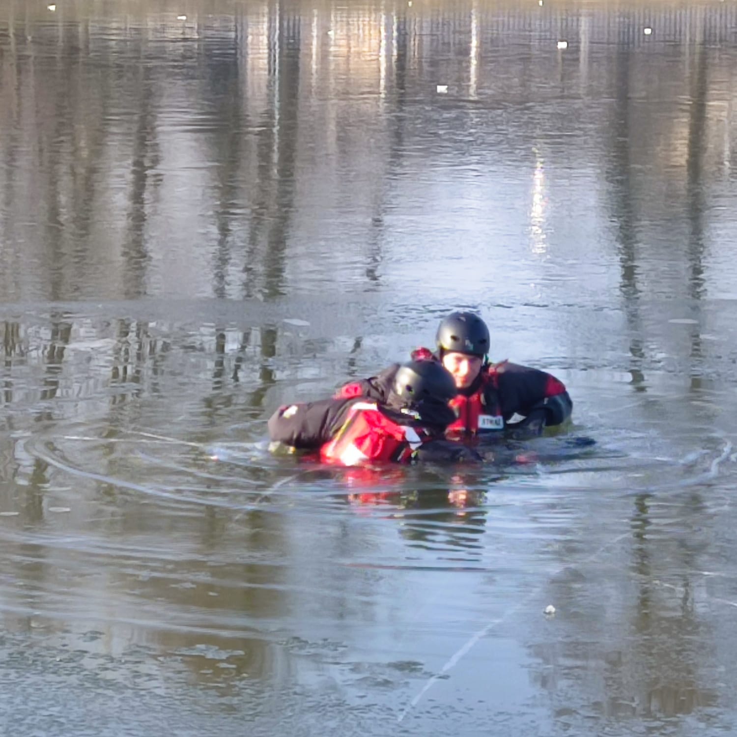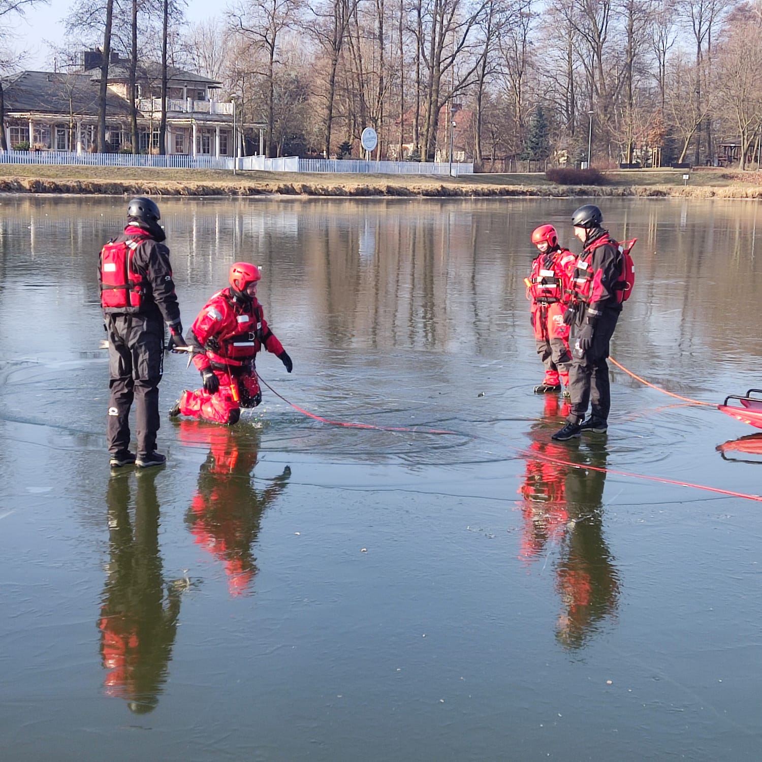 Ćwiczenia praktyczne z ratownictwa lodowego na terenie zamarzniętego Kąpieliska Miejskiego „Stawy Walczewskiego”