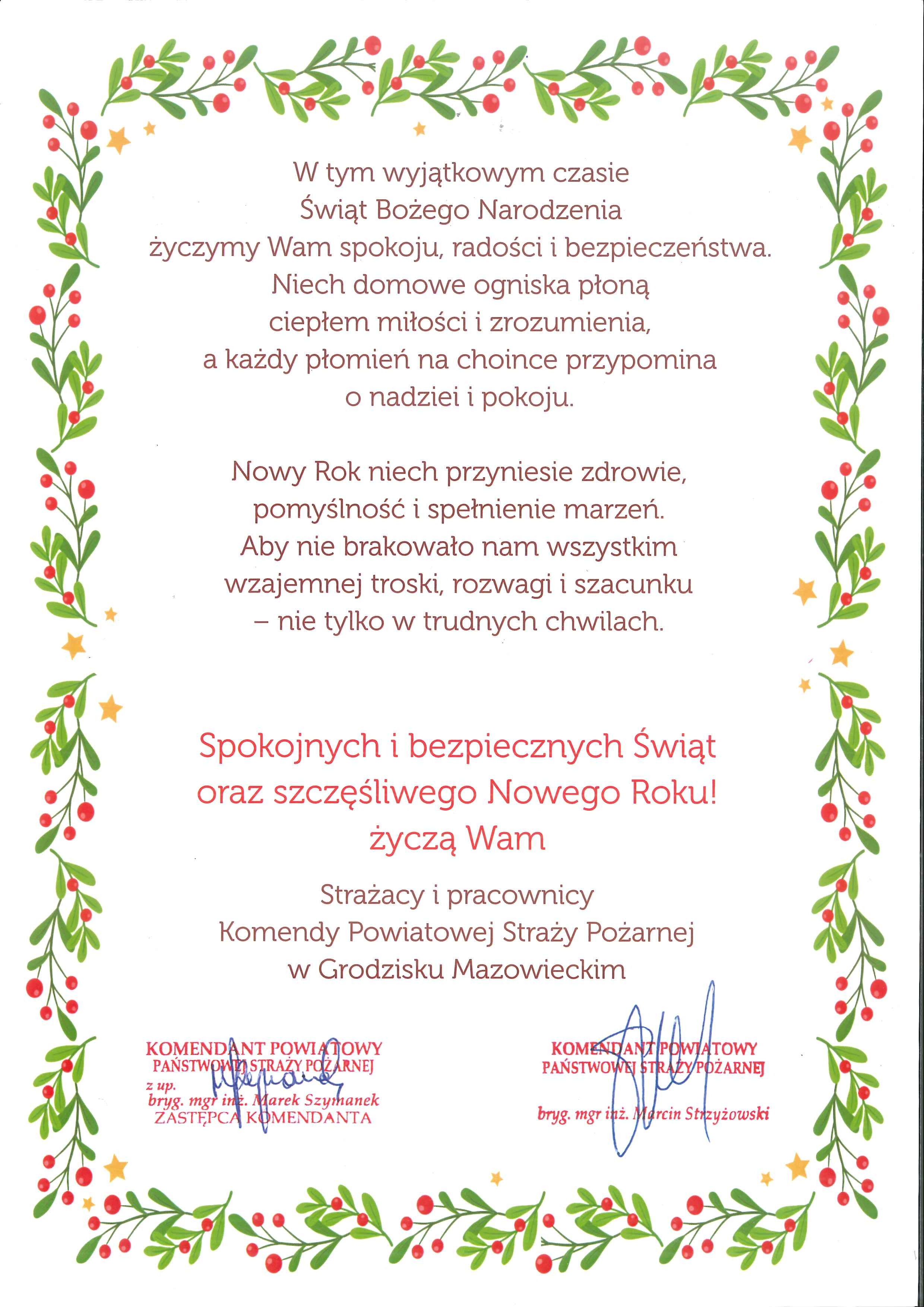 W tym wyjątkowym czasie Świąt Bożego Narodzenia życzymy Wam spokoju, radości i bezpieczeństwa. Niech domowe ogniska płona ciepłem miłości i zrozumienia, a każdy płomień na choince przypomina o nadziei i pokoju. Nowy Rok niech przyniesie zdrowie, pomyślność i spełnienie marzeń. Aby nie brakowało nam wszystkim wzajemnej troski, rozwagi i szacunku - nie tylko w trudnych chwilach. Spokojnych i bezpiecznych Świąt oraz szczęśliwego Nowego Roku! życzą Wam Strażacy i pracownicy Komendy Powiatowej Straży Pożarnej w Grodzisku Mazowieckim.