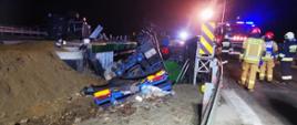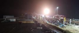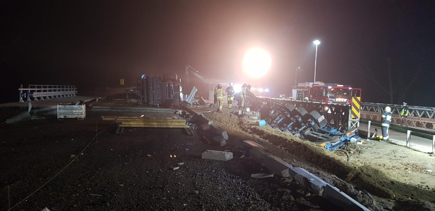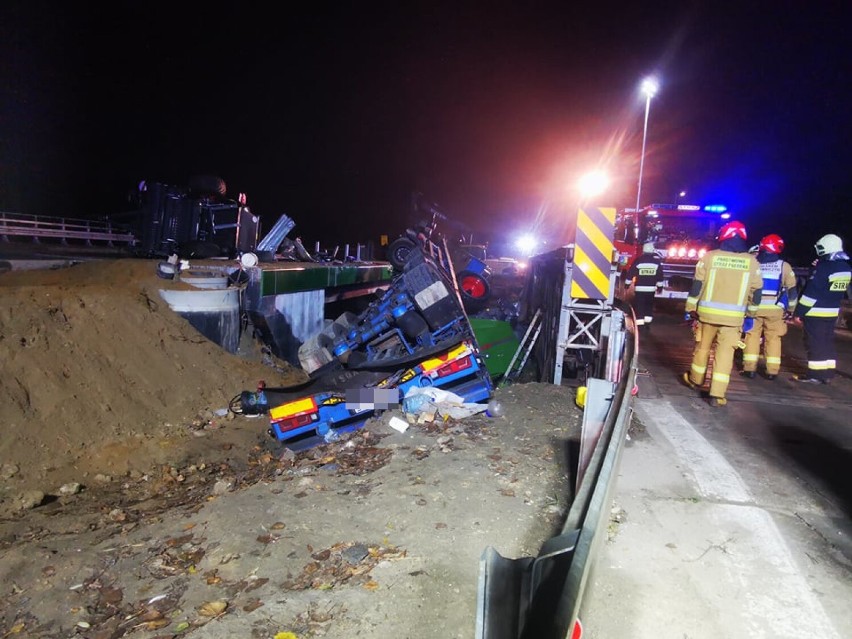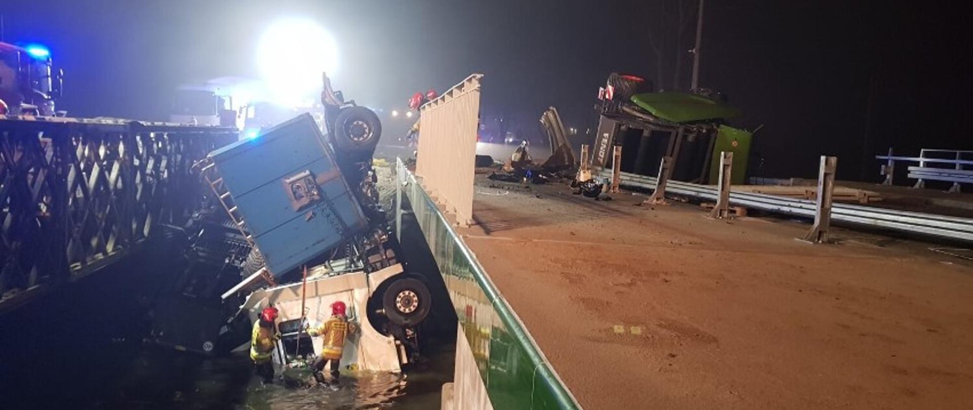 Po przybyciu na miejsce okazało się, że ciągnik siodłowy z naczepą przewożący maszyny rolnicze wypadł z drogi i częściowo wpadł do rzeki Mogilnicy. Strażacy pomogli kierowcy wydostać się z pojazdu, by następnie udzielić mu kwalifikowanej pierwszej pomocy i dalej przekazać obecnemu zespołowi ratownictwa medycznego. Kierowca doznał najprawdopodobniej tylko niegroźnych ogólnych potłuczeń.