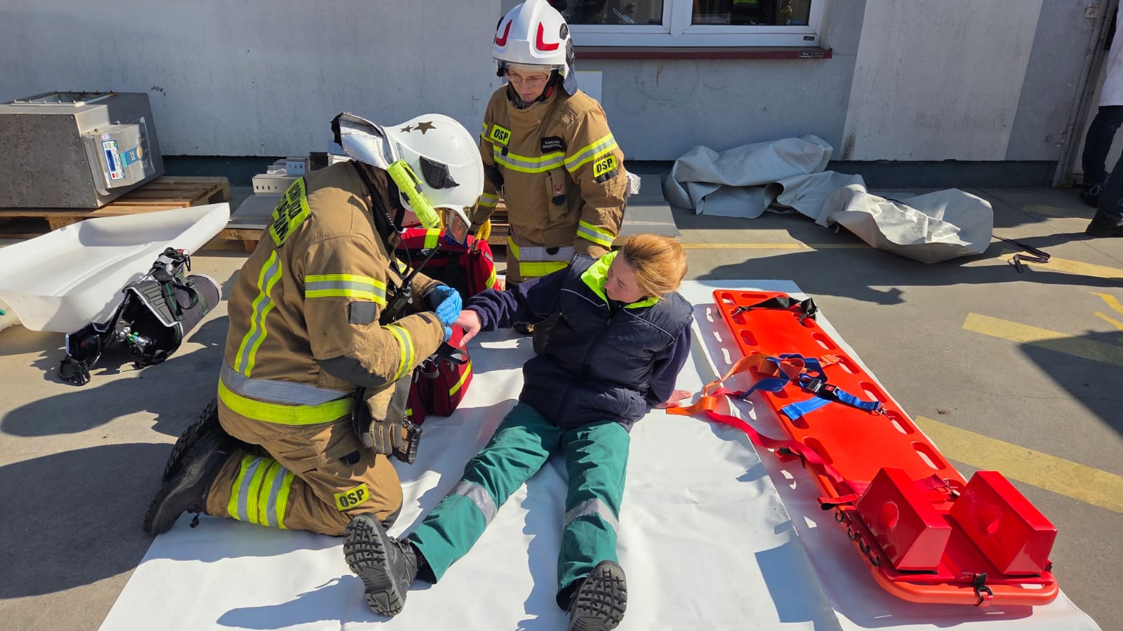 - dodatkjowo podczas ewakuacji jeden z pracowników wykonujących prace przy instalacji chłodniczej potknął się i zawisł na wysokości około 3 metrów.