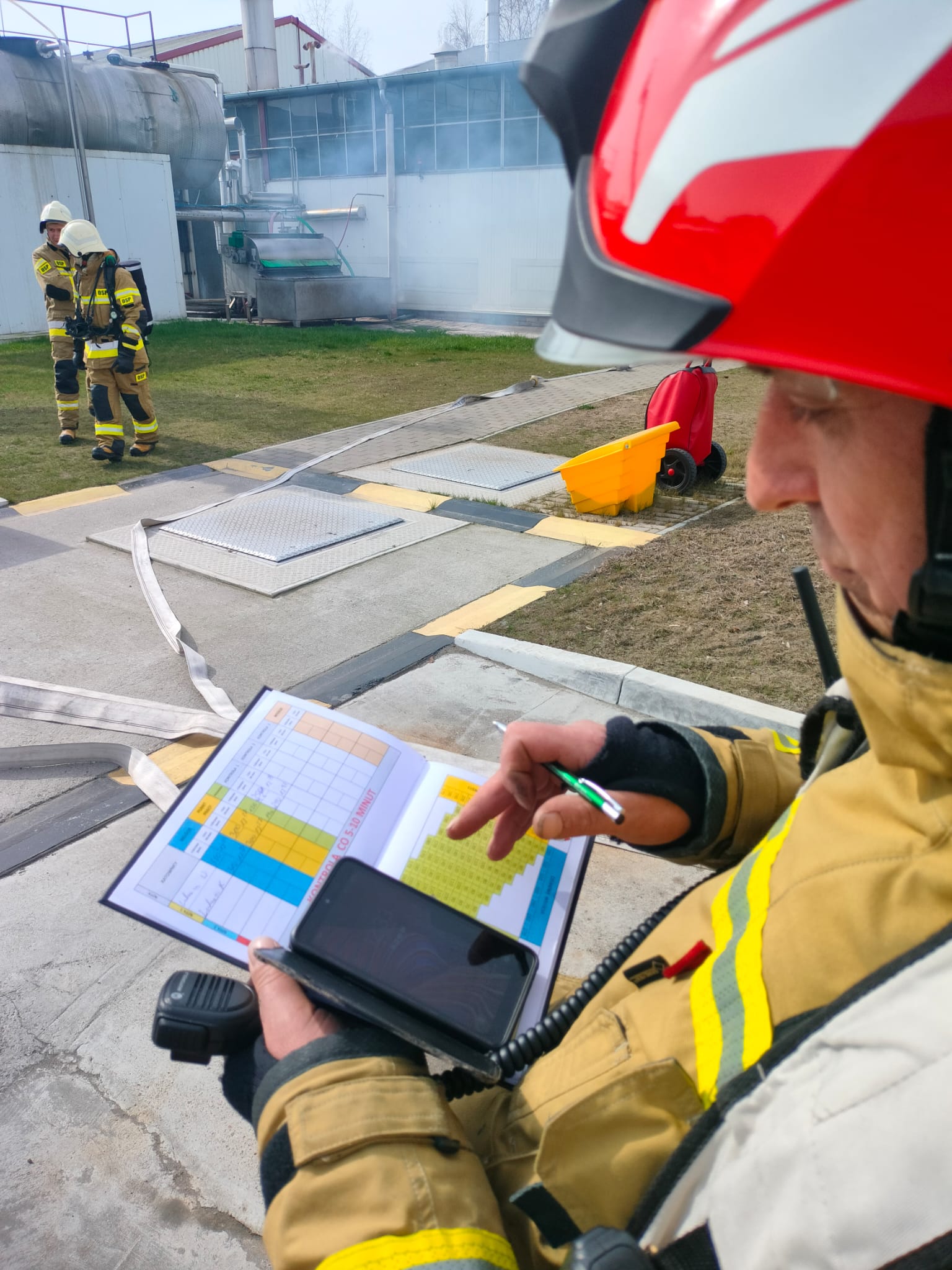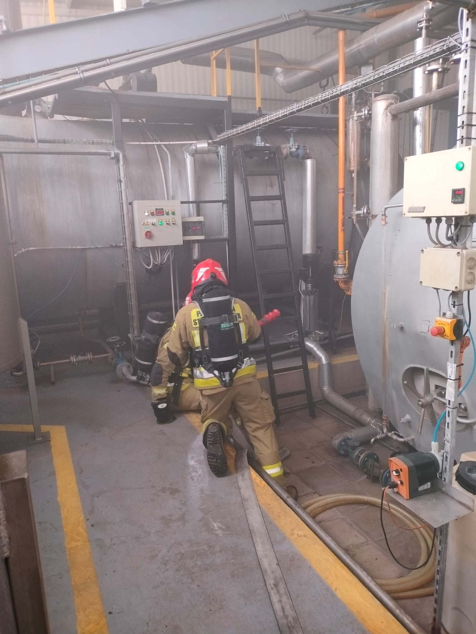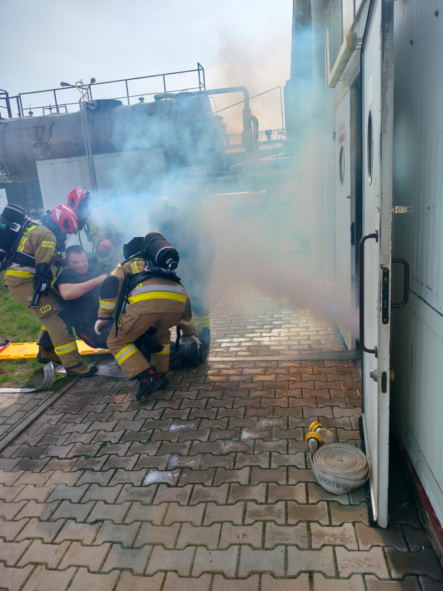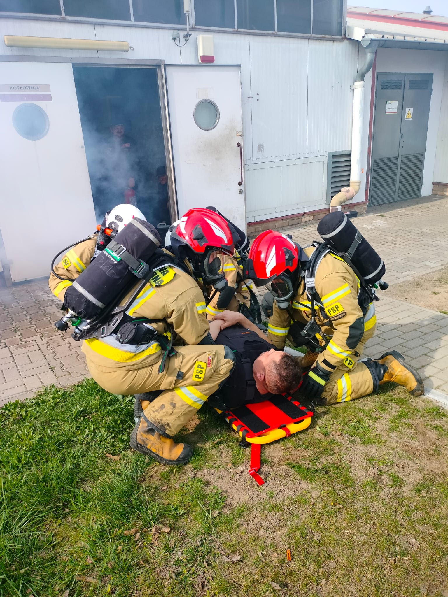 Na potrzeby ćwiczeń założono, że w pomieszczeniu kotłowni podczas prowadzenia prac pożarowo niebezpiecznych doszło do zaprószenia ognia. Krótko po tym pracownicy przyległej hali produkcyjnej zauważyli dym. Pracownicy natychmiast przystąpili do próby gaszenia, podjęli ewakuację z obiektu oraz przekazali informacje o pożarze kierownictwu zakładu. Pożar silnie rozwijał w pomieszczeniu kotłowni oraz przedostał się na halę produkcyjną. Po sprawdzeniu obecności wśród ewakuowanych okazało się, że czterech pracowników pozostało na terenie zakładu.