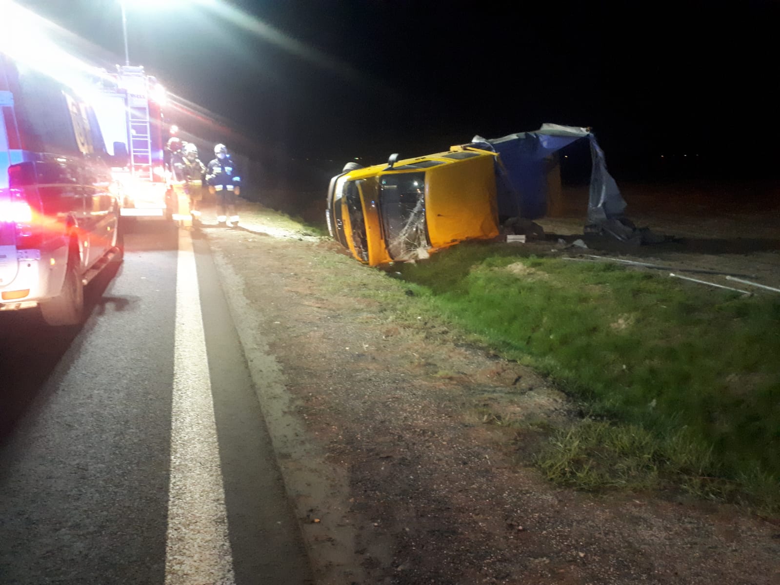 Po przybyciu na miejsce zastano poważnie uszkodzonego busa, który pozostawał na boku poza pasem drogowym.